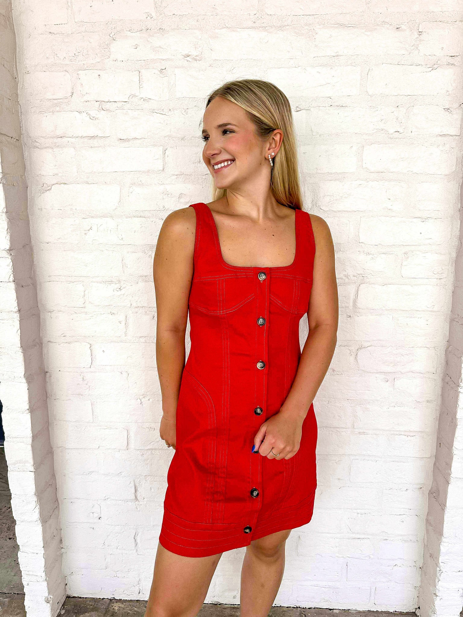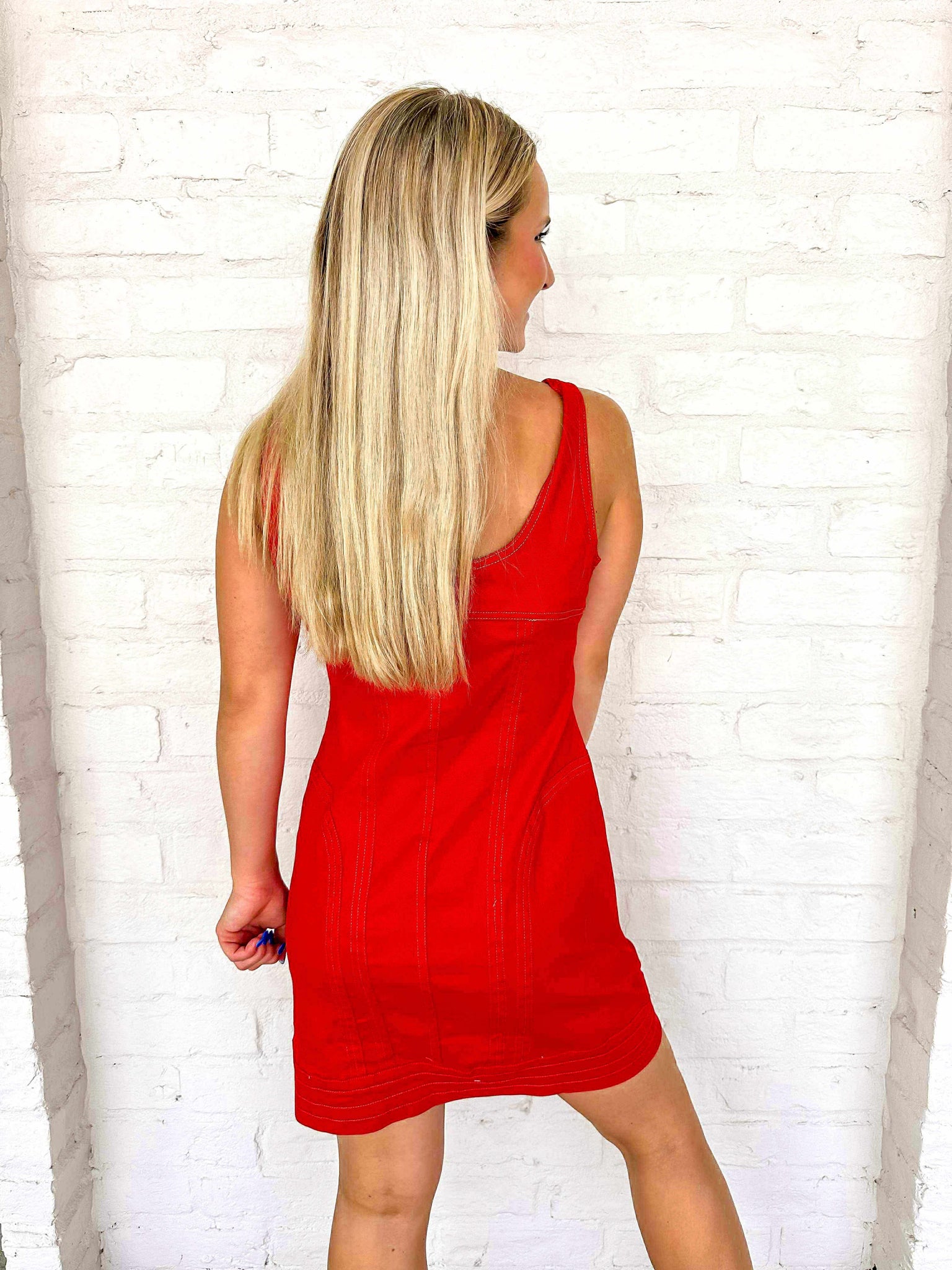 Upgrade your wardrobe with our Friends For Better Red Denim Dress! Made with high-quality denim, this dress offers both comfort and style. Perfect for any occasion, its versatility allows you to dress it up or down. Stand out in the crowd with this must-have addition to your closet!