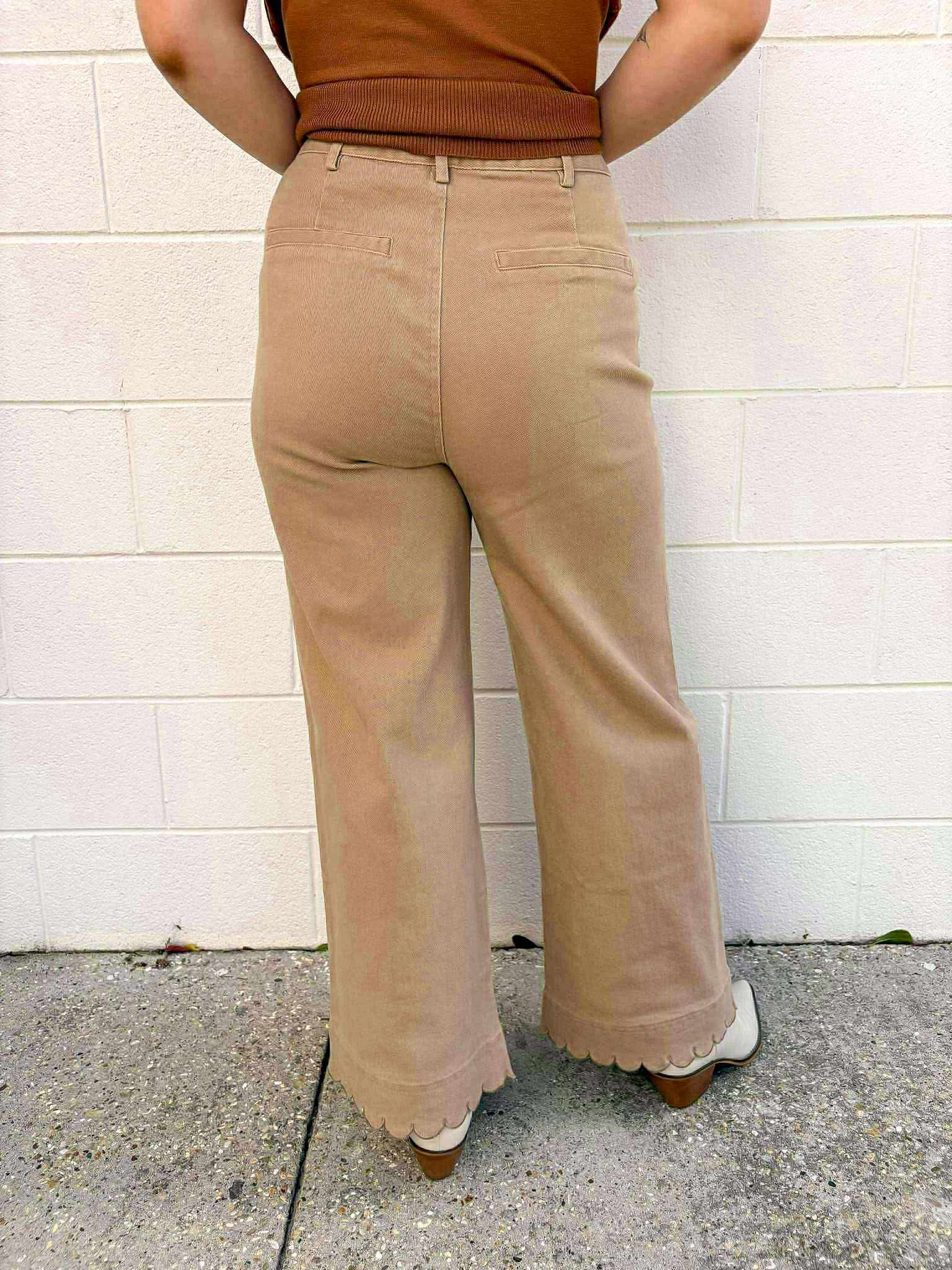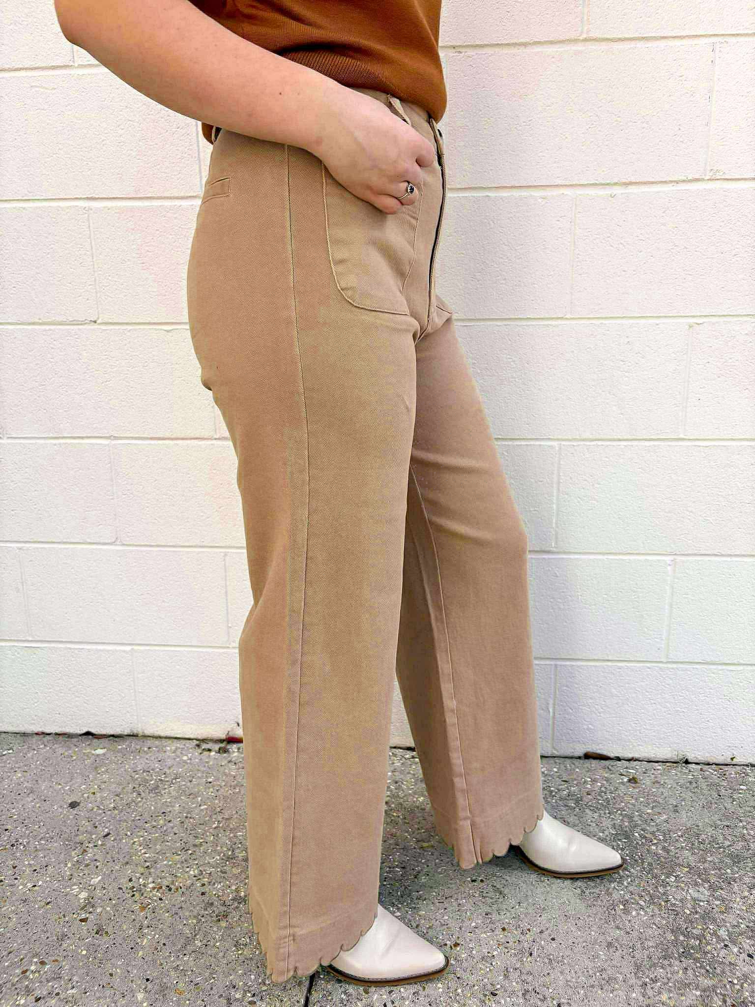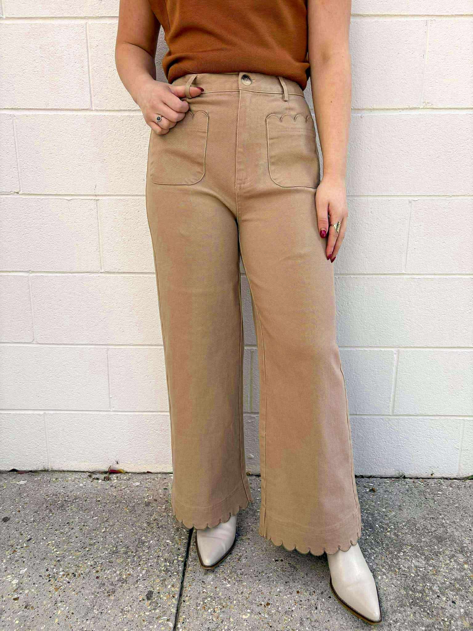 Experience the best of both worlds with our City Streets Camel Scallop Pants. Made from a comfortable denim-like material, these pants offer the perfect balance of style and comfort. Dress them up or down for any occasion and feel confident and fashionable all day long!
