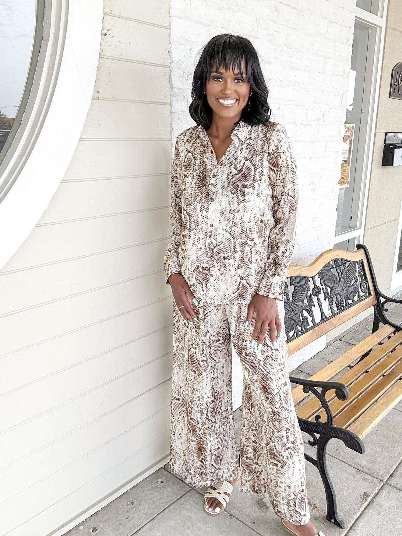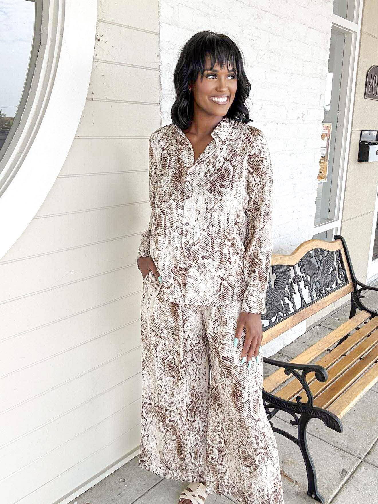 Unleash your inner wild side with Normal Days From Now Brown Bottoms featuring a bold snake print. These bottoms add a touch of edginess to your everyday look, making you stand out in the best way possible. Embrace your unique style and make a statement with these bottoms!