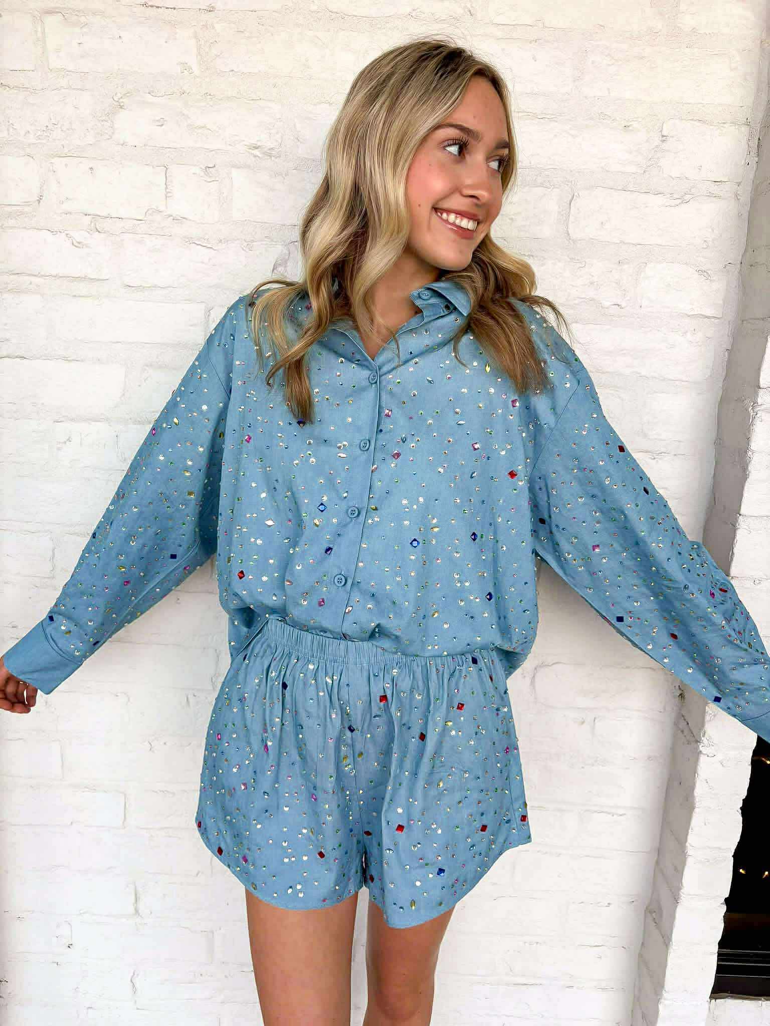 Queen Of Sparkles Chambray Multi Rhinestone Shorts