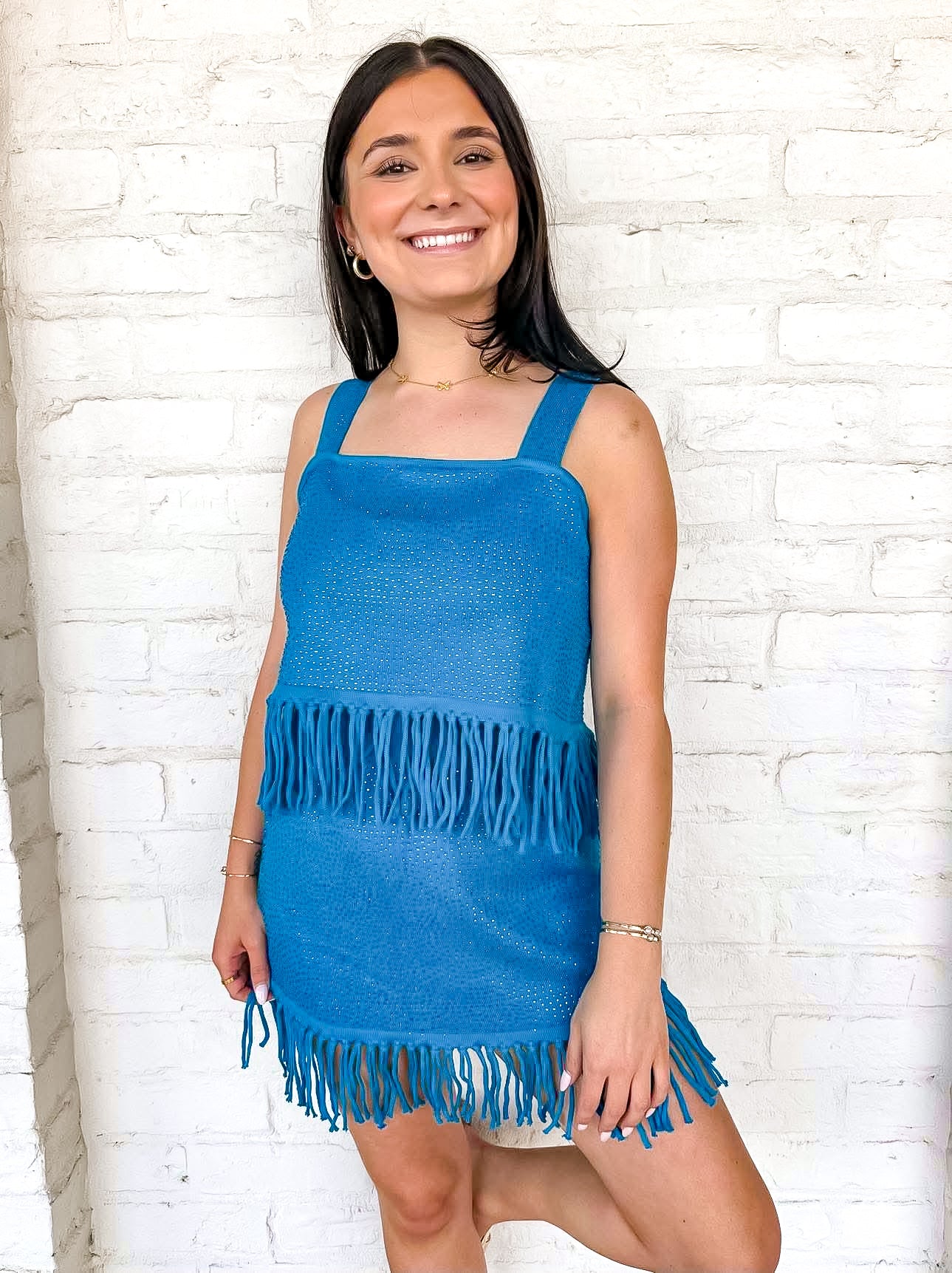 Introducing the Queen Of Sparkles Mesh Fringe Coverup Midi Skirt! This light blue skirt is perfect for adding a touch of glamour to any outfit. The mesh fabric adds a unique texture while the fringe detailing adds movement and flair. Stand out and shine with this one-of-a-kind statement piece!