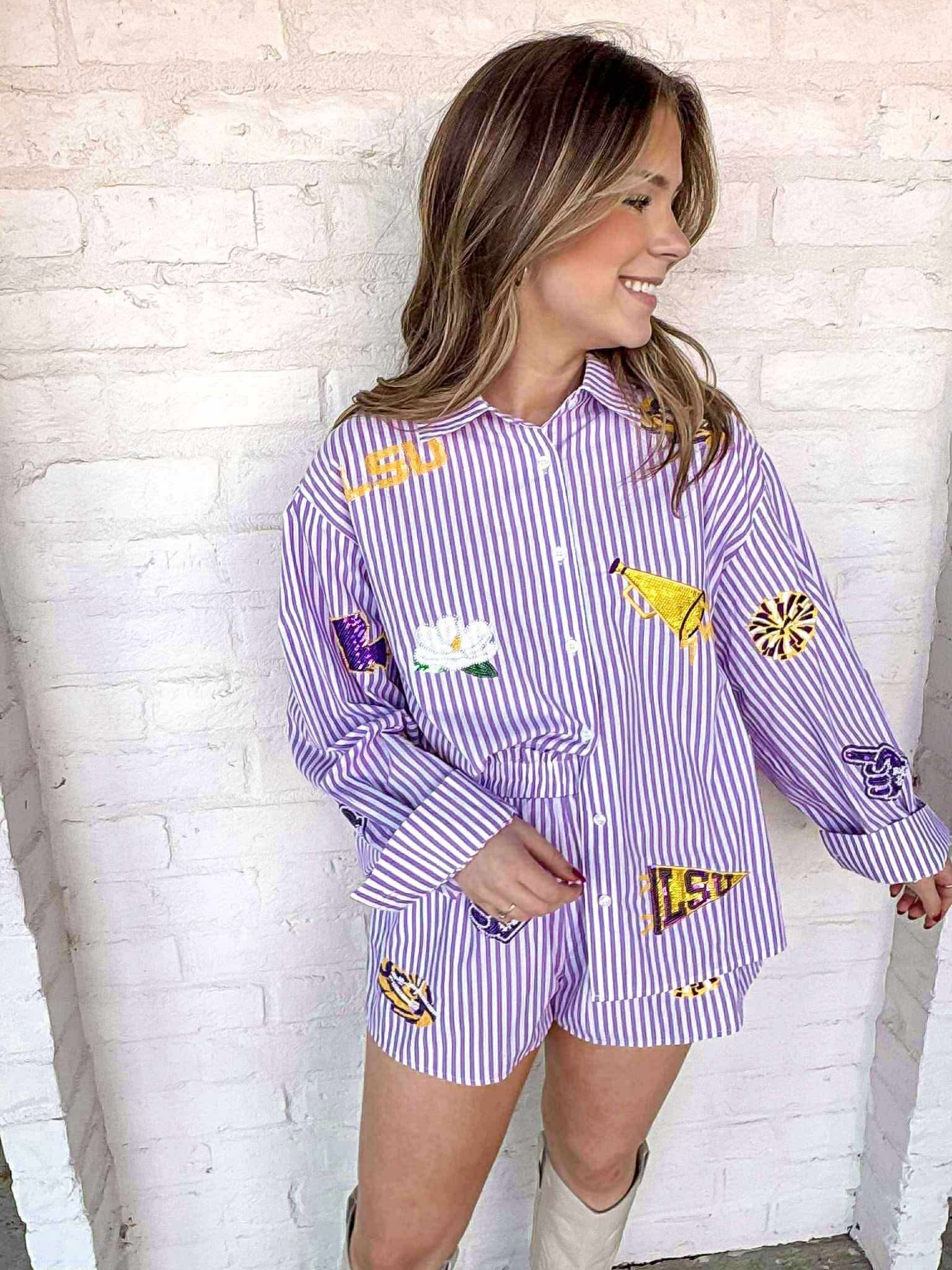 Stay stylish and comfortable with our Queen Of Sparkles LSU Mini Icon Striped Shorts! Made with high-quality material, these shorts provide a flattering fit and are perfect for any casual outing or game day. Stand out and show off your love for LSU with these must-have shorts.