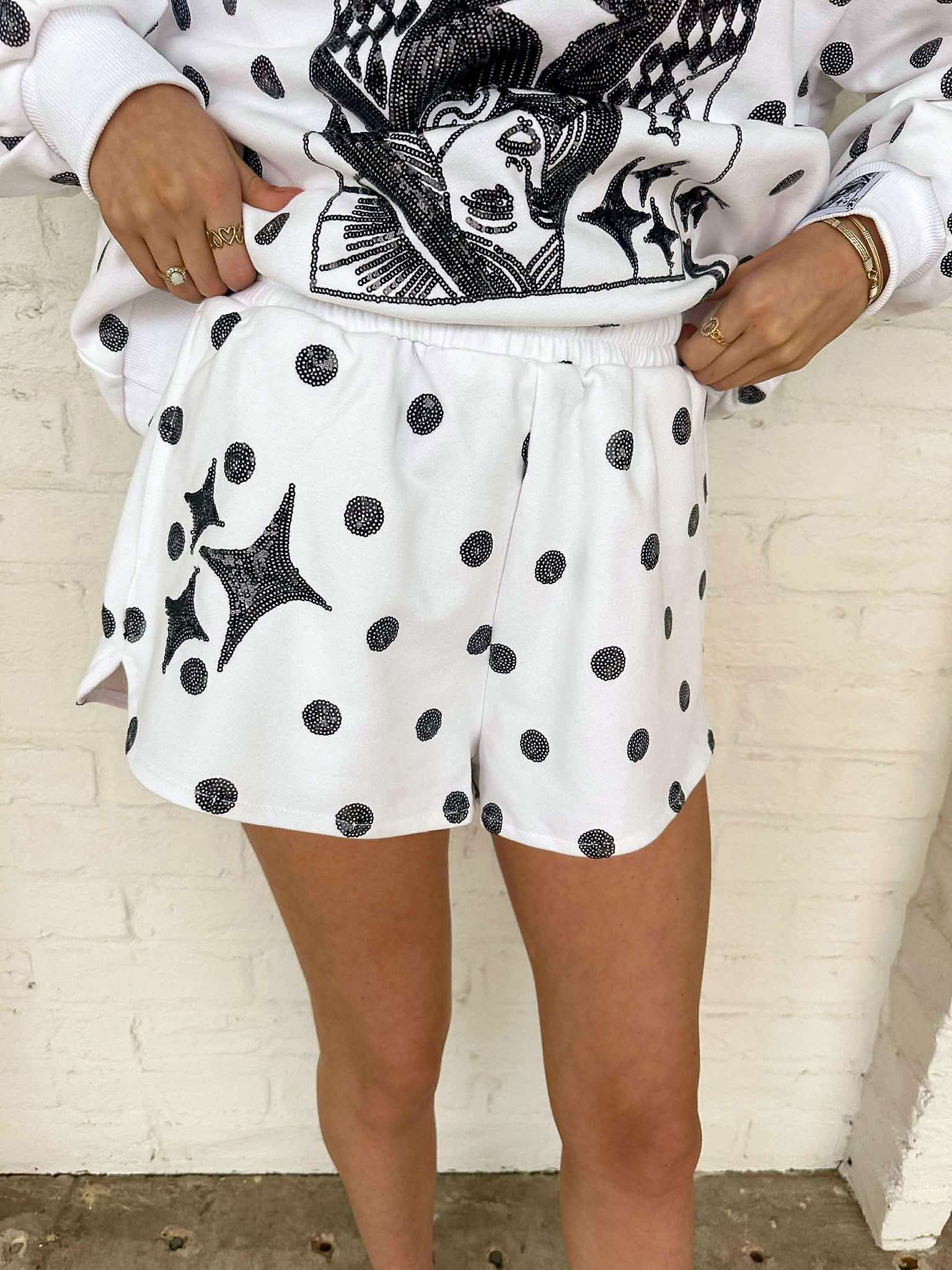 Capture the attention of the room with the Queen of Sparkles White & Black Polka Dot Short. The iconic card logo sparkles, adding a touch of glam to this trendy piece. Stand out in style and confidence as you make a statement with every step.