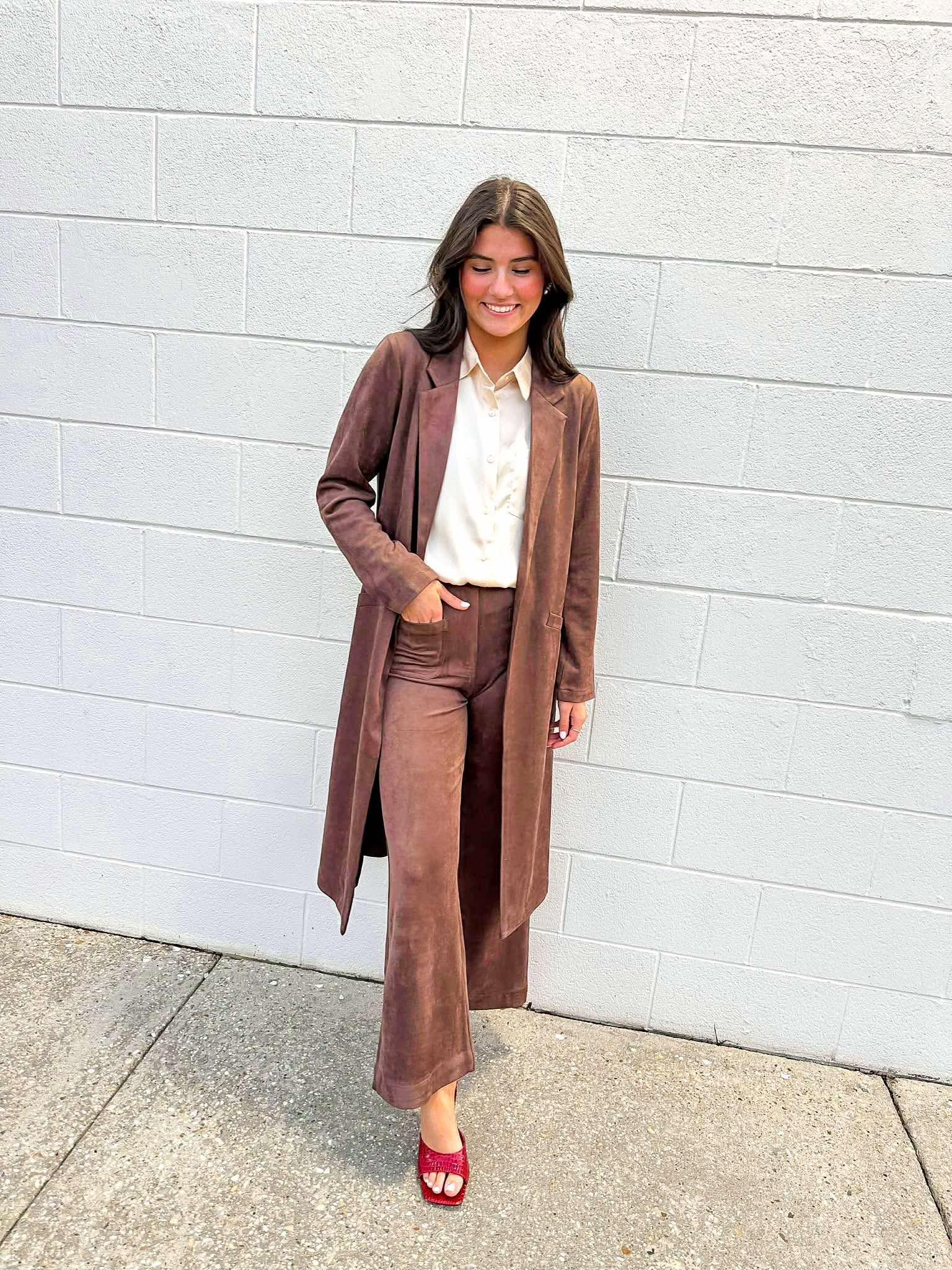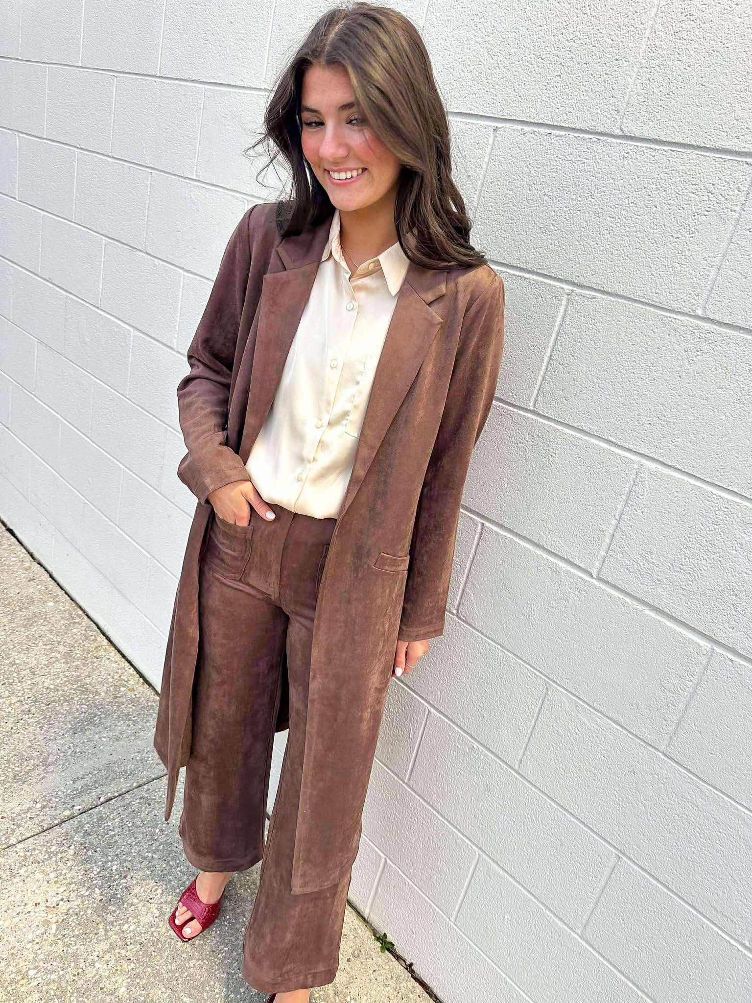 Indulge in luxury with our Tell Me More Brown Pants. Made from soft suede, these pants will elevate your style and provide ultimate comfort. Perfect for any occasion, experience the benefits of both fashion and comfort with these sleek and stylish pants.