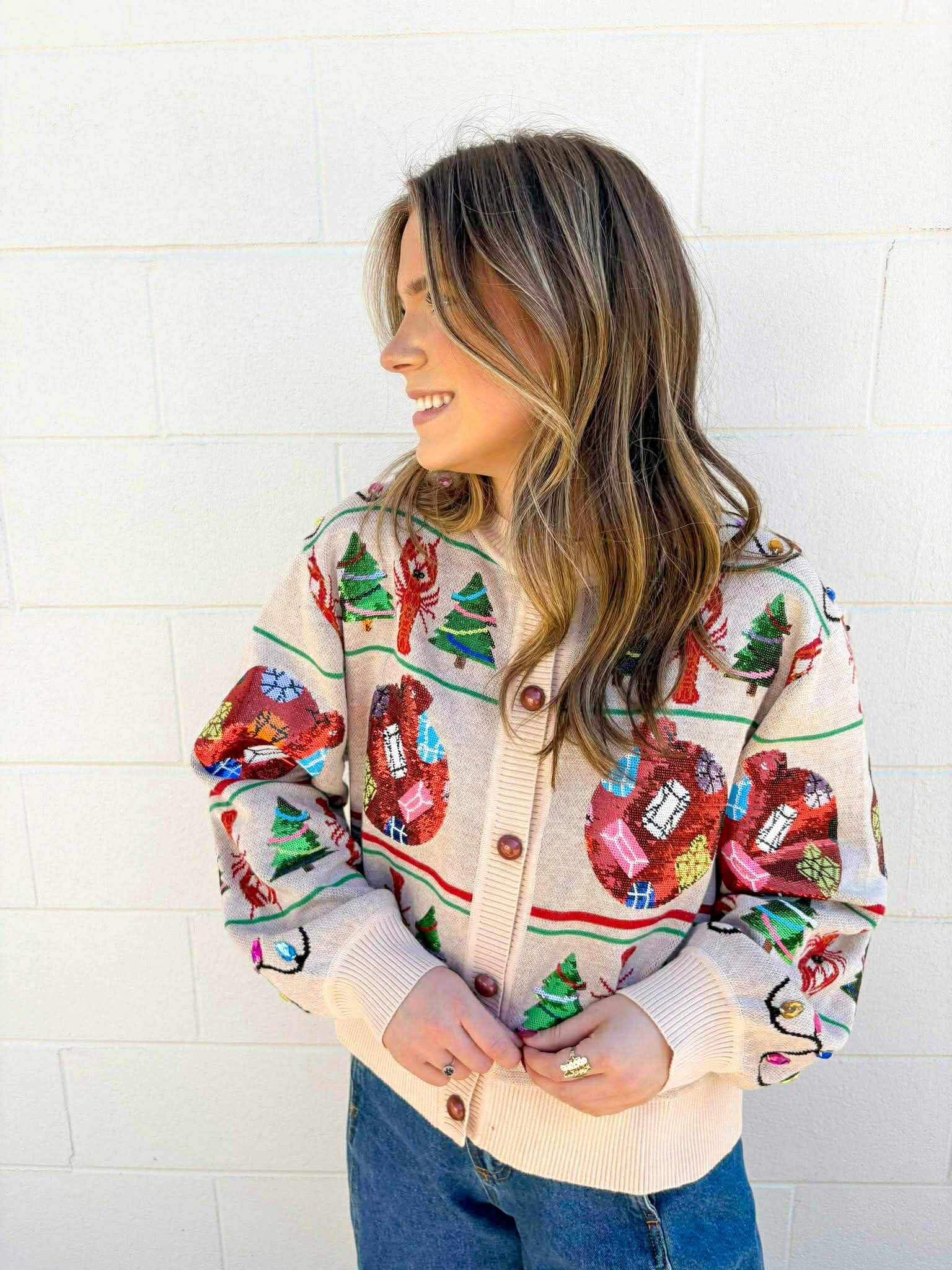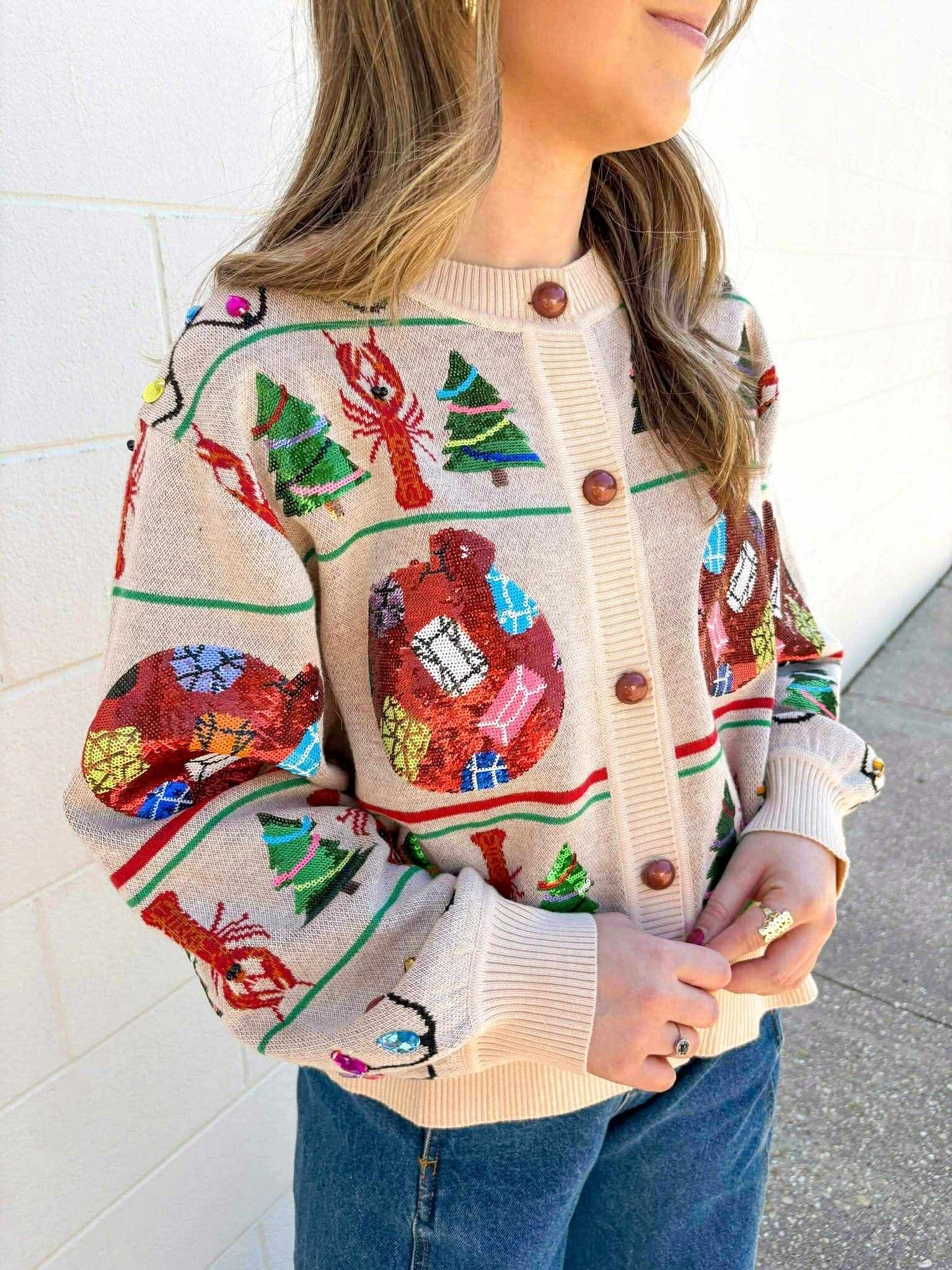 Indulge in the holiday spirit while staying warm and stylish with our Queen Of Sparkles Cajun Christmas Crawfish Ivory Icon Cardigan. Featuring a versatile design, this cardigan can also be buttoned up for a chic look. Add a touch of sparkle to your wardrobe and spread the festive cheer this season!