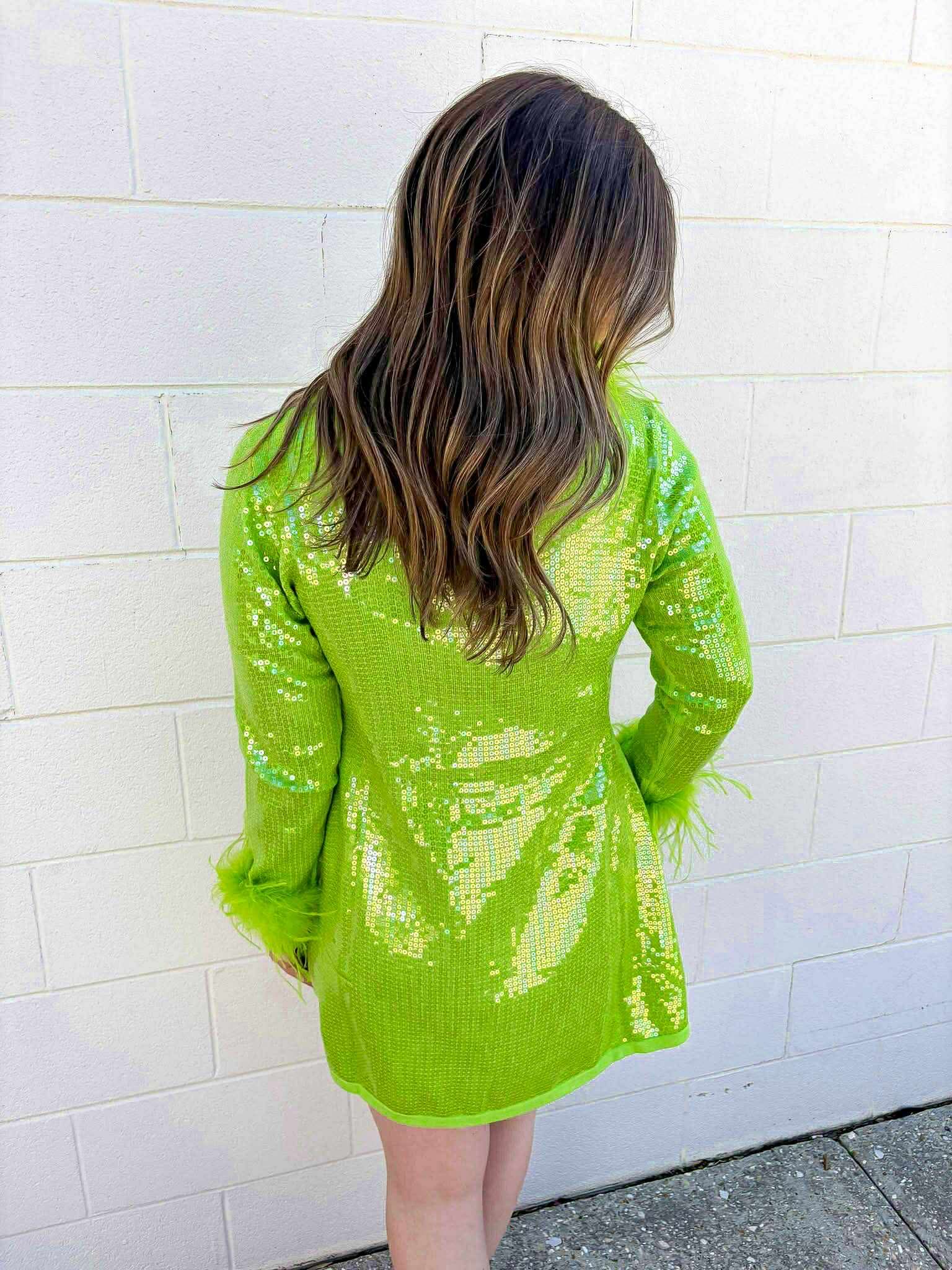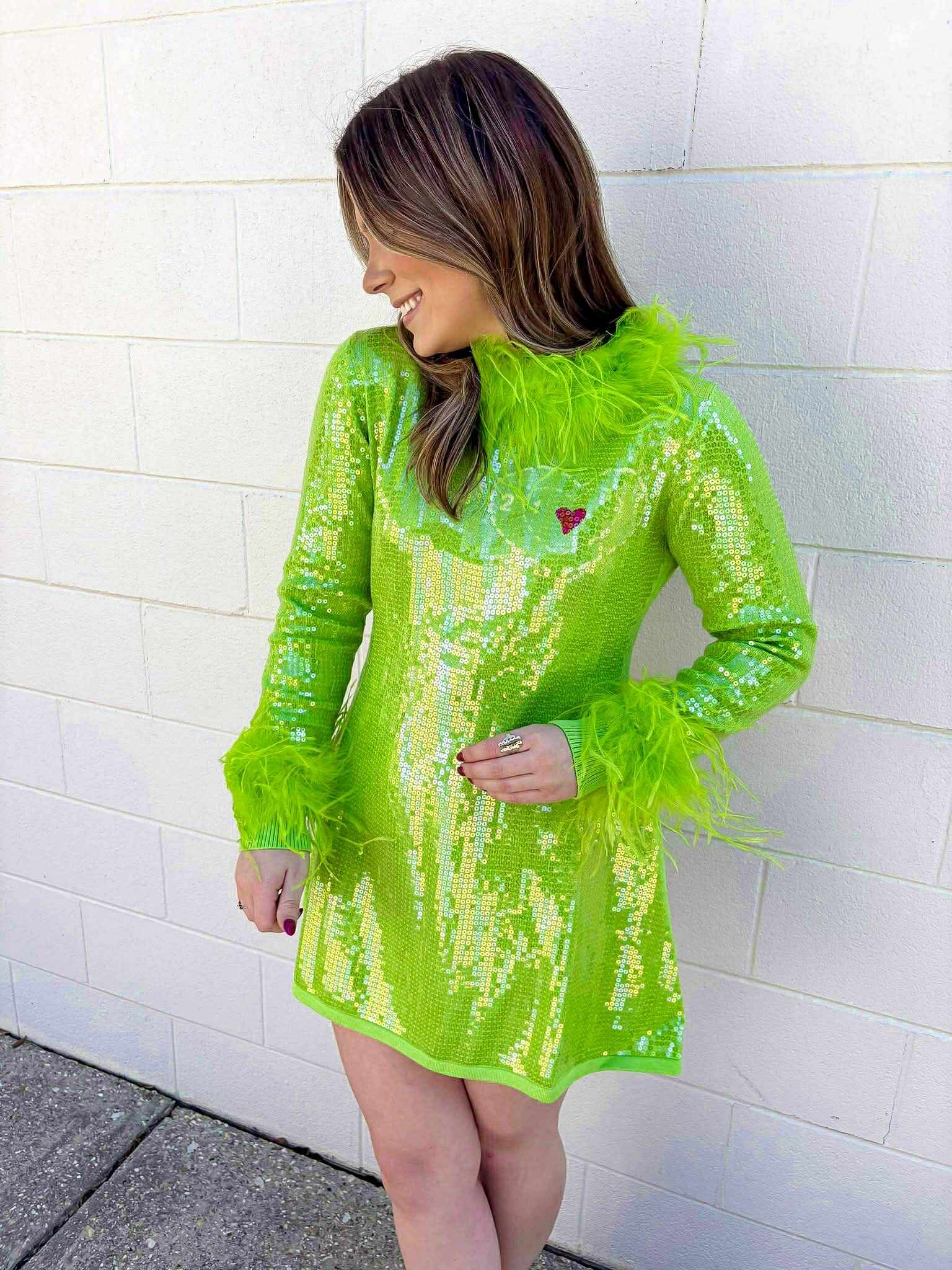 "Sparkle and shine like the Queen of the holiday season in our Green Sequin Grinch Dress! With a full sequin design and feather sleeves, this dress will make you stand out at any party. Add a touch of whimsy and steal the show with this festive and fabulous dress!"