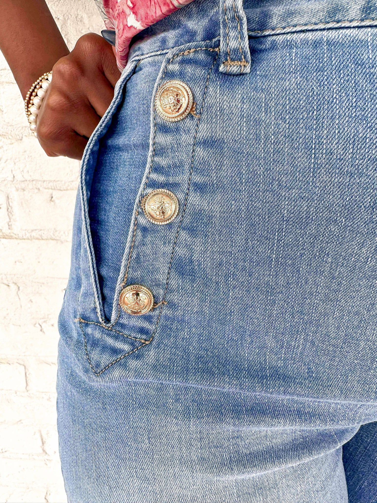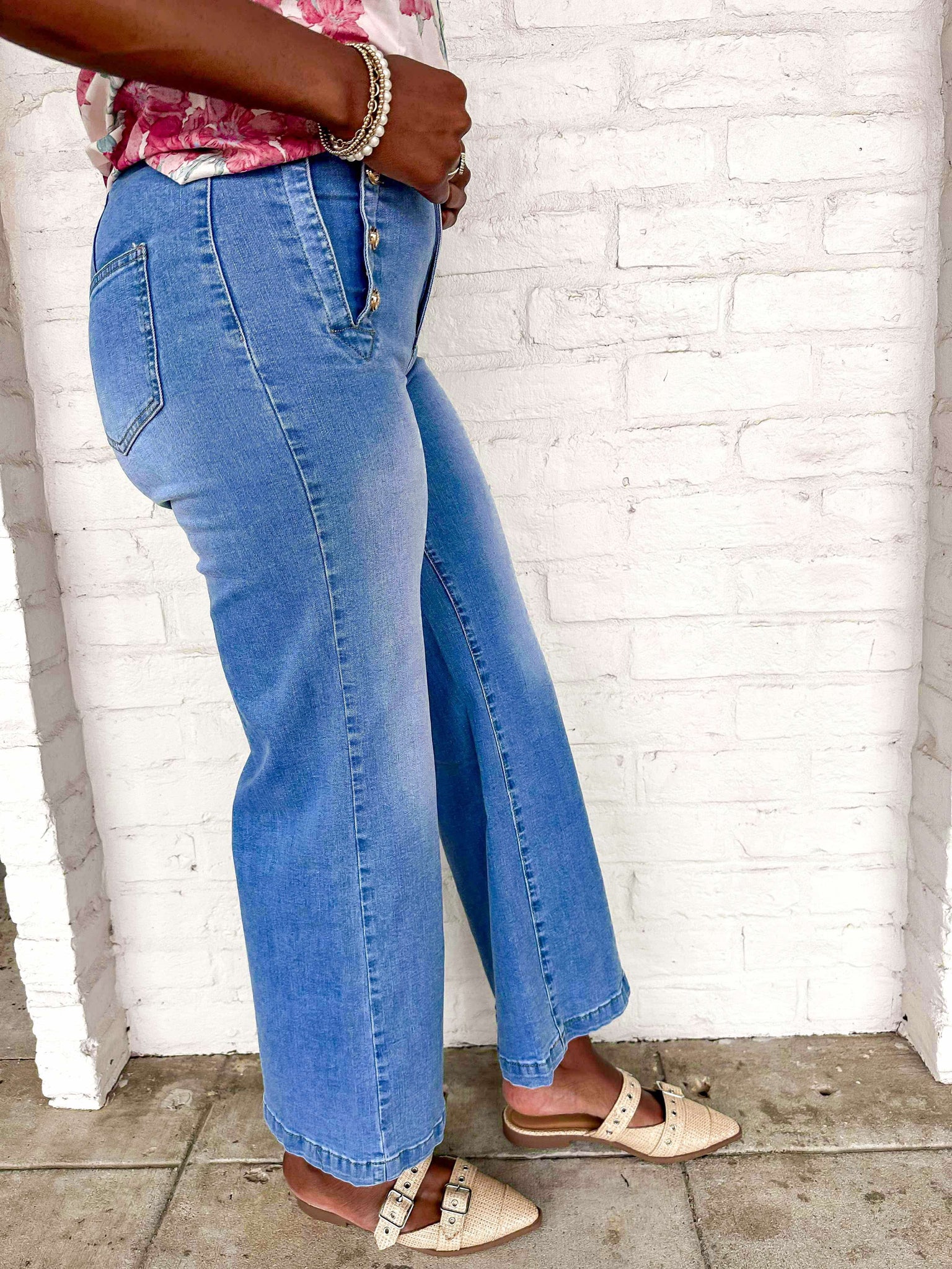 Expertly crafted for both style and comfort, our Happiest Moment Washed Blue Straight Flare with Button Detail jeans are a must-have addition to any wardrobe. Made with the finest quality fancy denim, these jeans are perfect for achieving a trendy and sophisticated look. Upgrade your denim game and experience the ultimate in luxury and versatility with these stylish jeans.