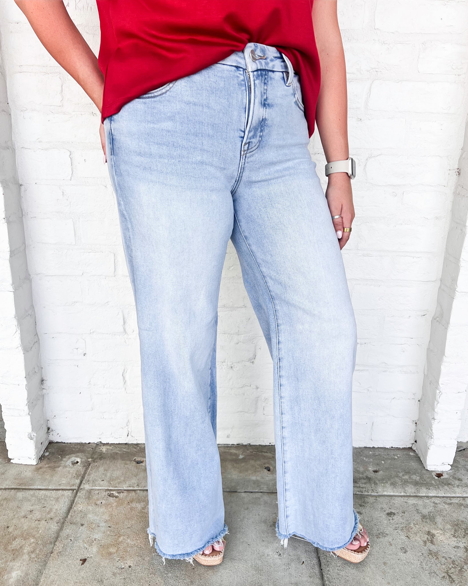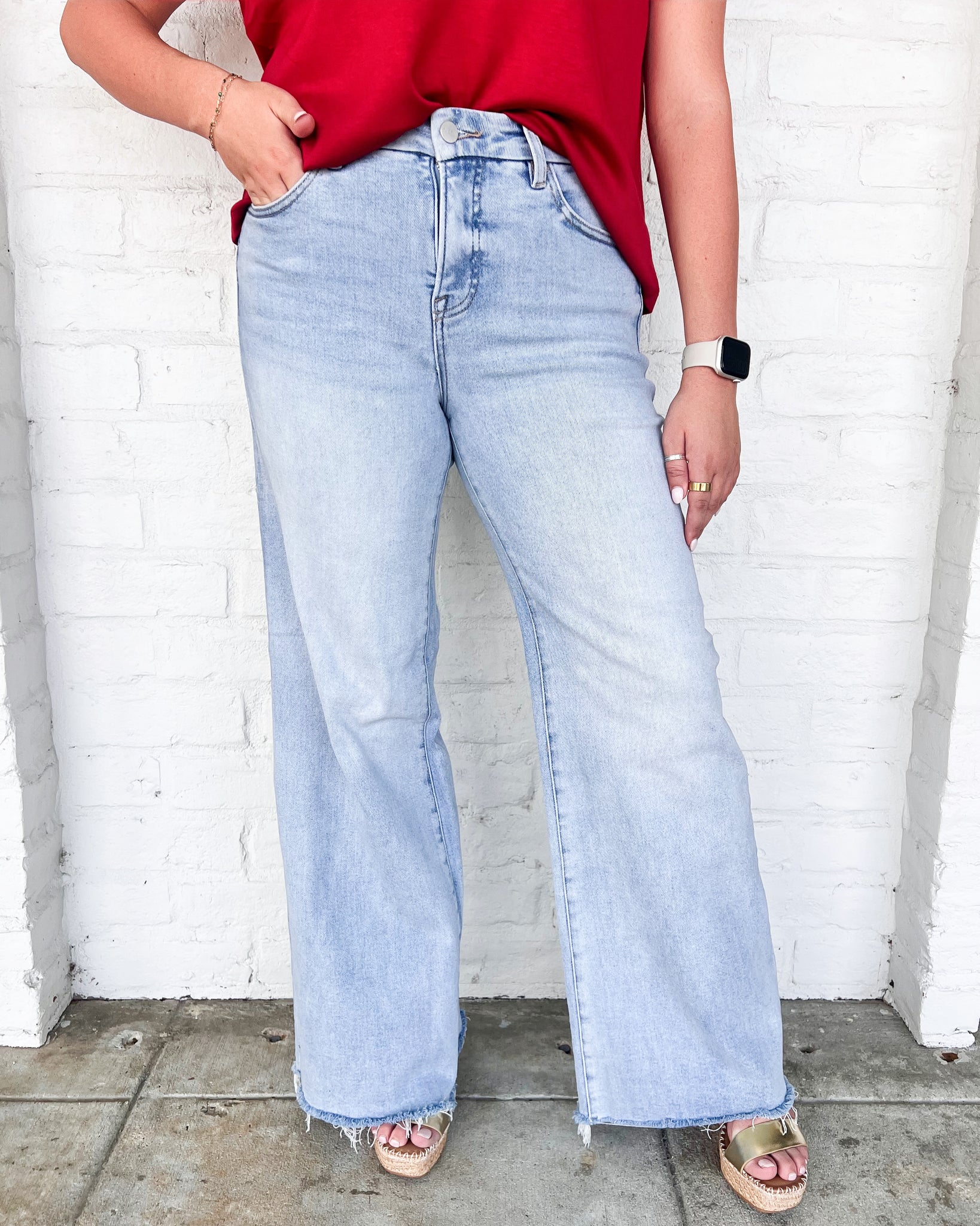 Elevate your style and confidence with our Progressing Forward Light Mid Rise Wide Leg Jean. Featuring Tummy Control to help you feel your best, and a Mis Rise for comfortable wear. Pair with your favorite top for a flattering and on-trend look.