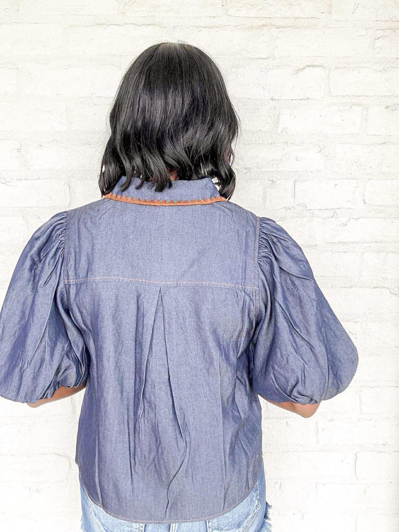 Introducing THML Feel It Coming Dark Blue Top! Experience the perfect blend of style and comfort with this puff sleeved denim button up top. Elevate your wardrobe with this must-have piece, perfect for any occasion. Upgrade your look and feel confident with THML!