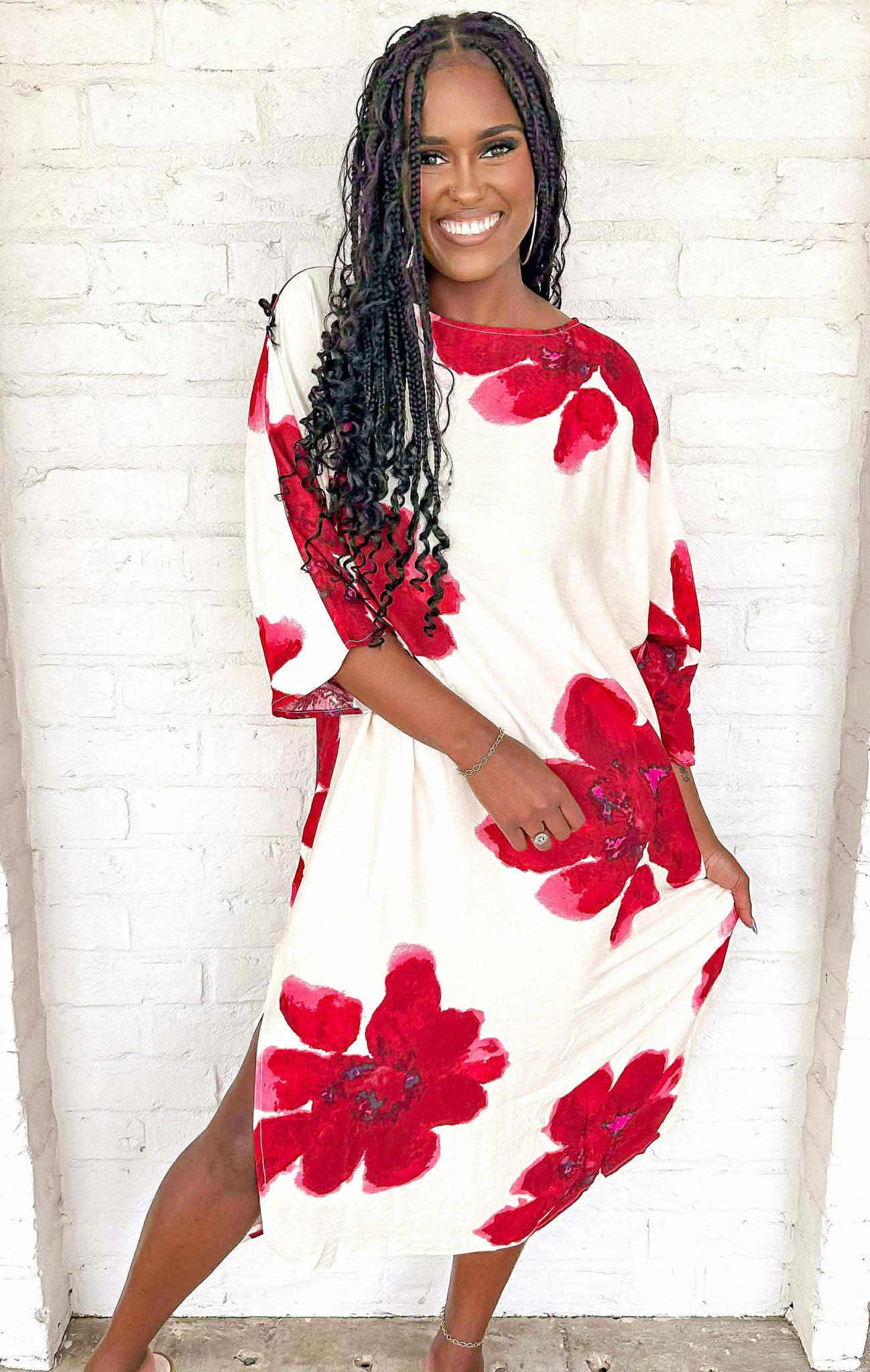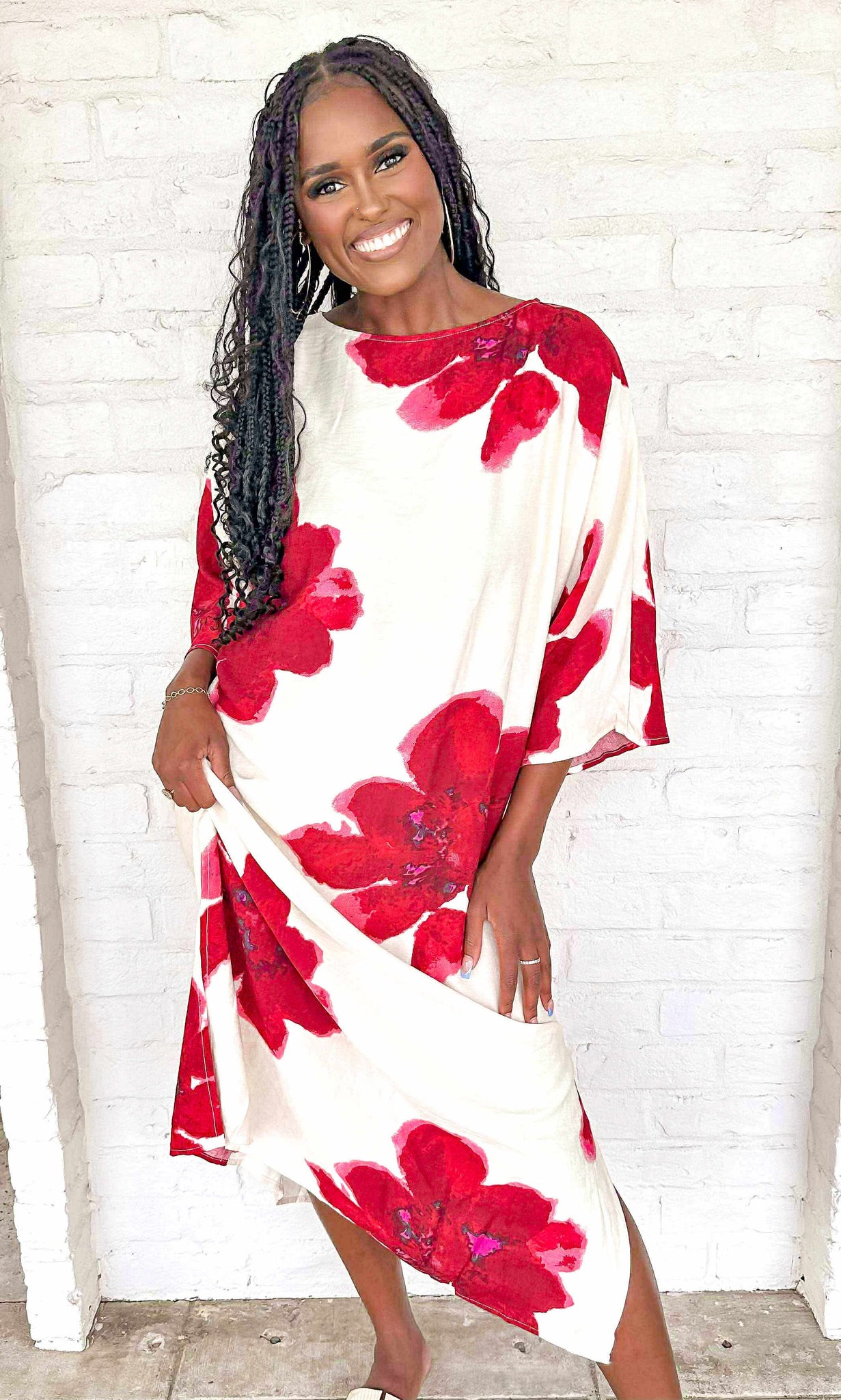 Indulge in elegance with the Made With Thanks Red Dress! This stunning floral maxi will make you stand out in any crowd. Feel confident and effortlessly chic thanks to the vibrant print and flattering silhouette. Perfect for any occasion, this dress is a must-have addition to your wardrobe.