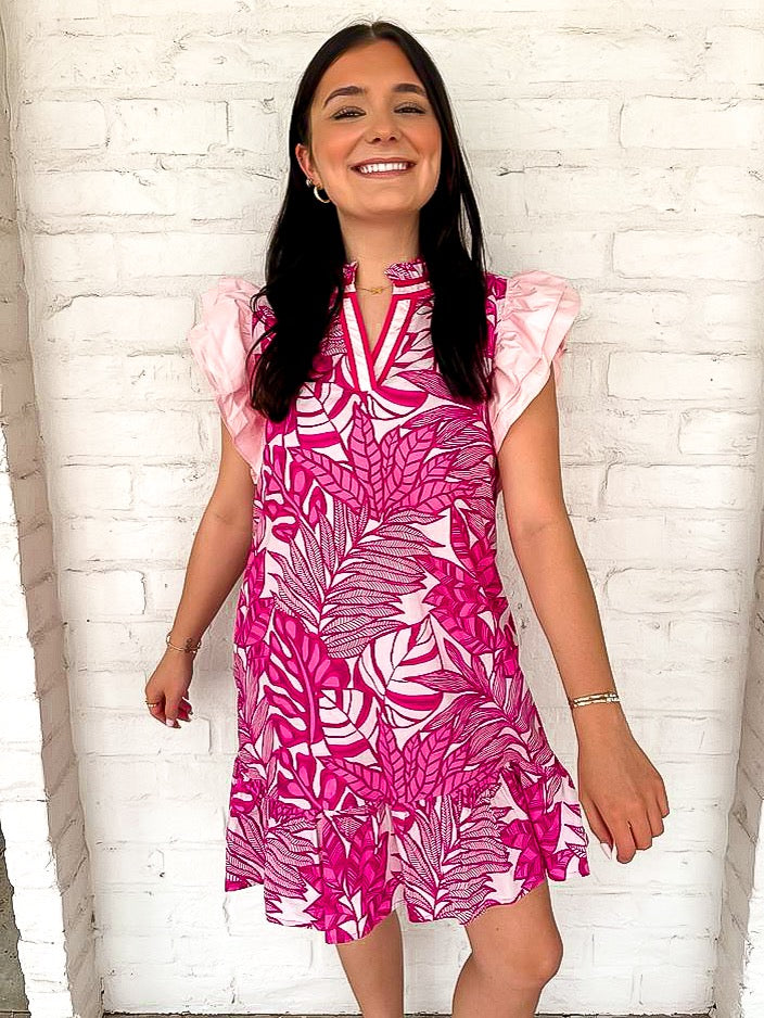 Experience elegance and femininity with our Setting The Standards Magenta Dress! This stunning pink dress features light pink ruffle sleeves, adding a touch of playfulness to its classic silhouette. Stand out and make a statement at any event with this must-have dress!