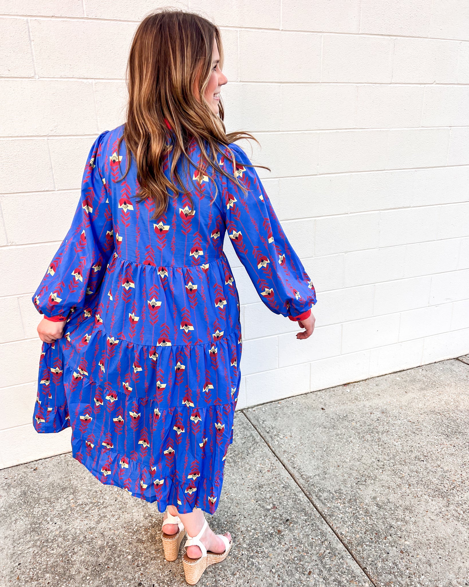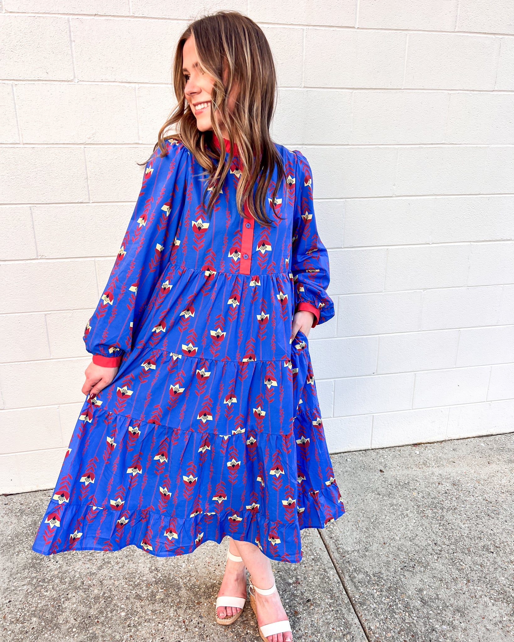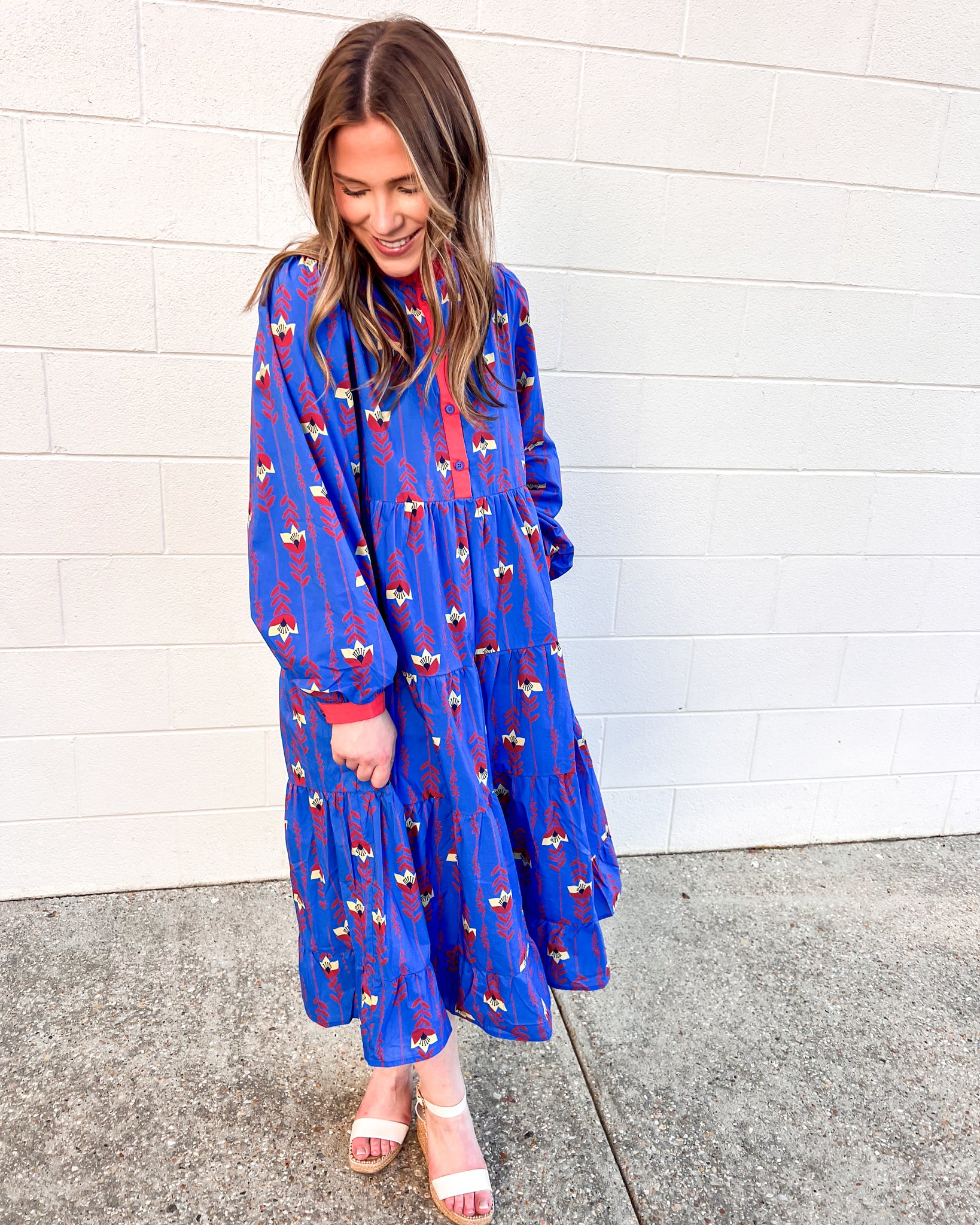 Make a statement in the Bold Blue & Red Tiered Maxi Dress, designed to turn heads with its vibrant color and playful print. Featuring a striking blue base with red and cream accents, this dress combines a button-front bodice, long sleeves with contrast cuffs, and a tiered skirt for a flowy, feminine silhouette. The relaxed yet polished design makes it easy to dress up or down, ensuring all-day comfort with standout style.