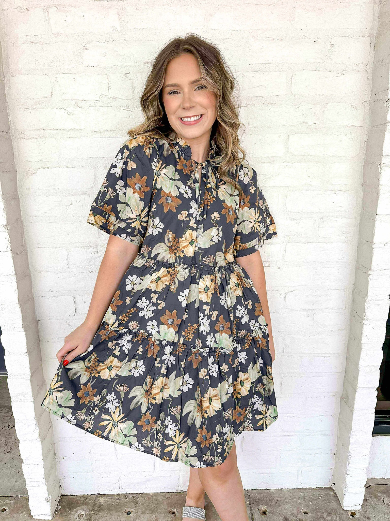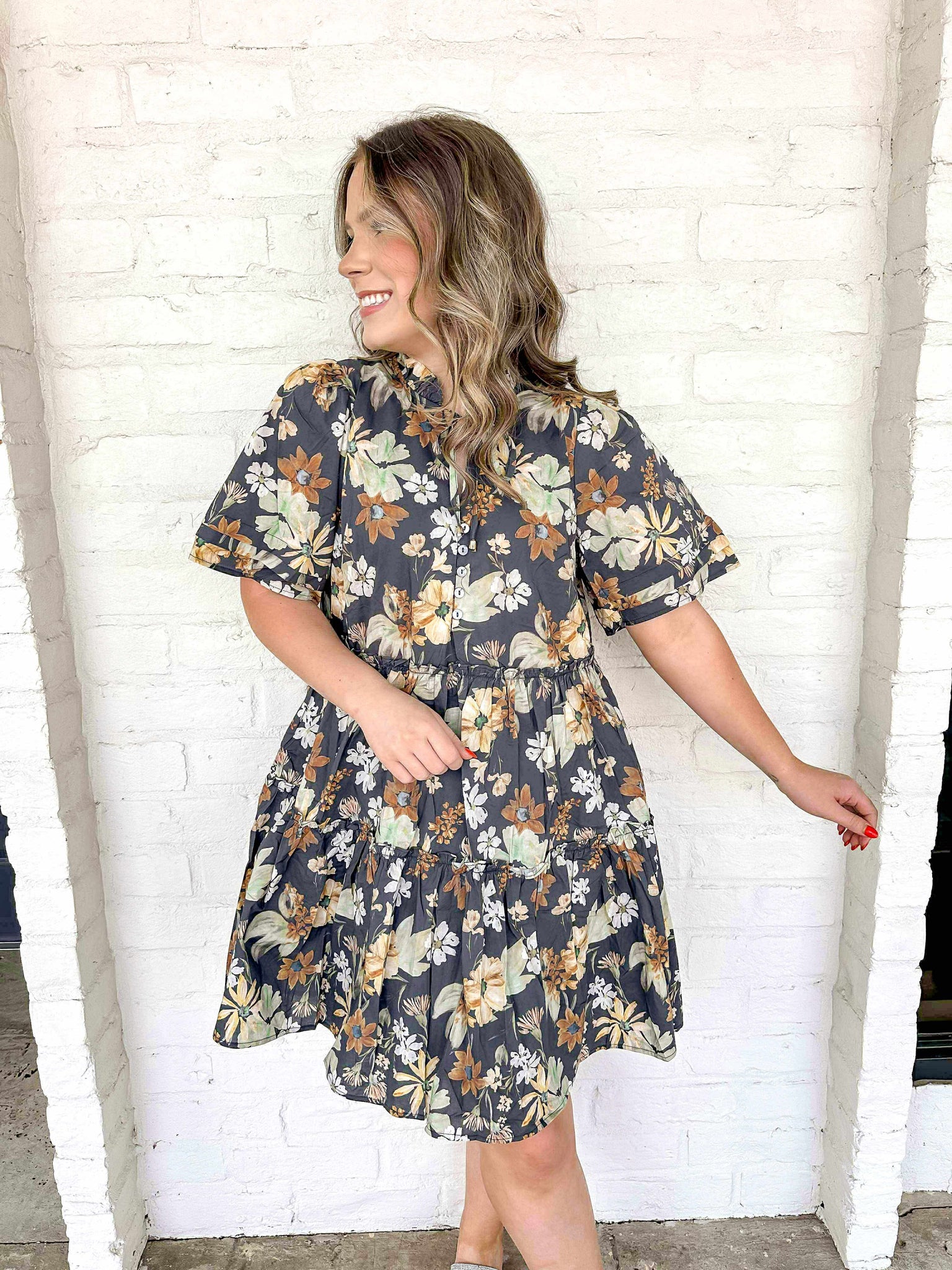 Introducing The Only Way Charcoal Dress! This beautiful navy fall floral dress is perfect for any occasion. Its stylish design and comfortable fit will make you stand out in a crowd. Elevate your wardrobe with this must-have piece.