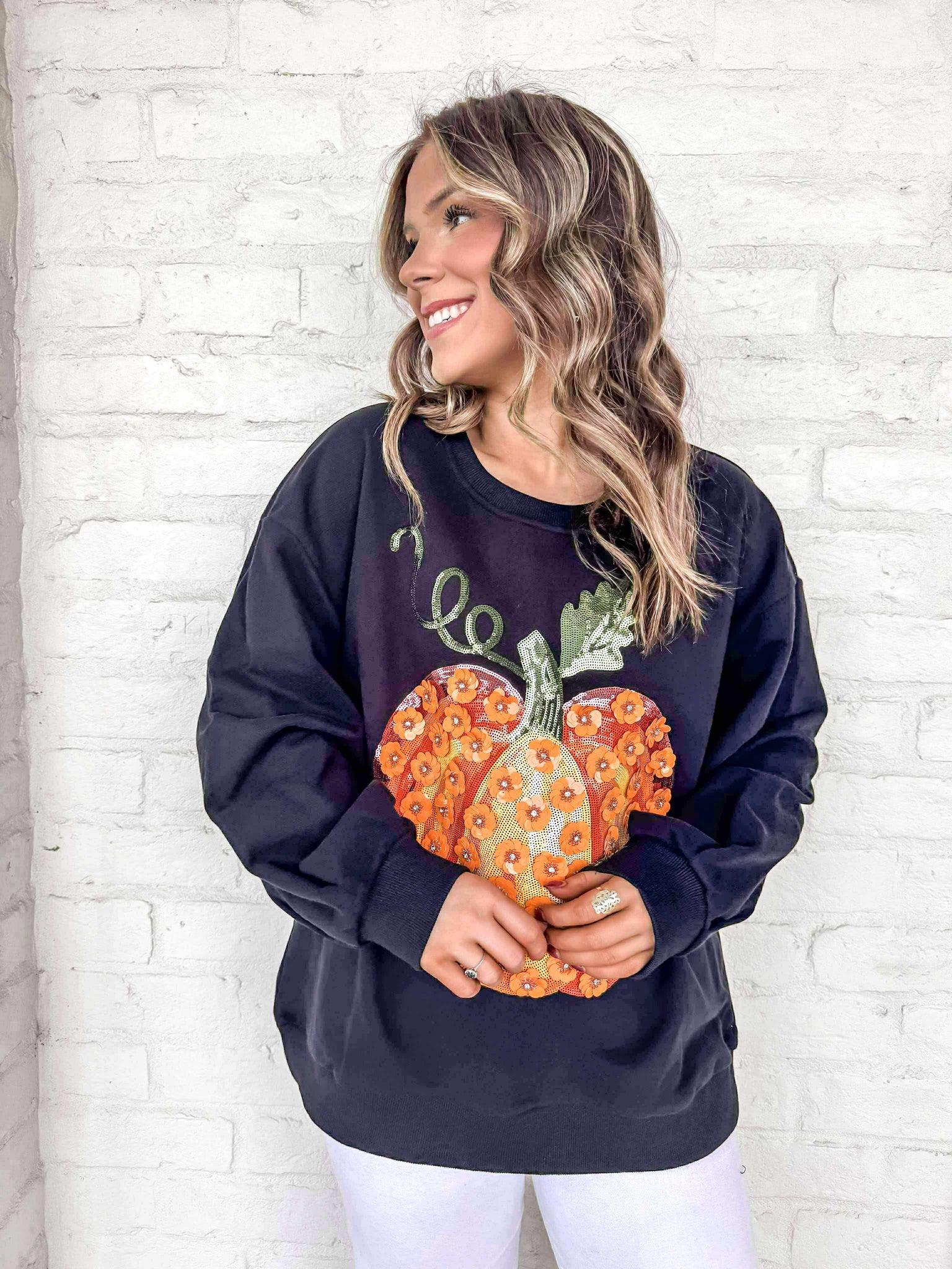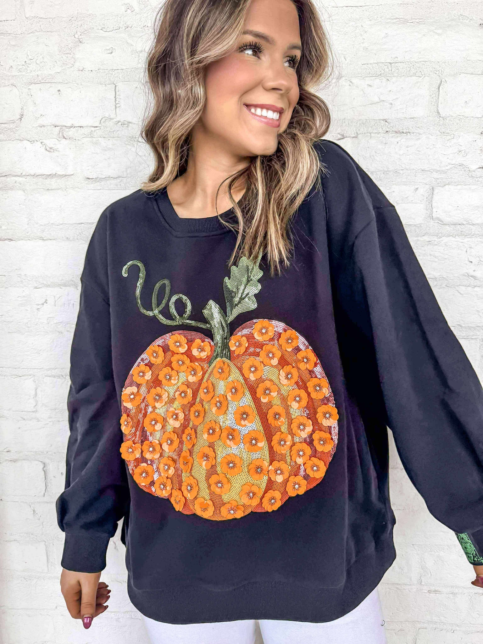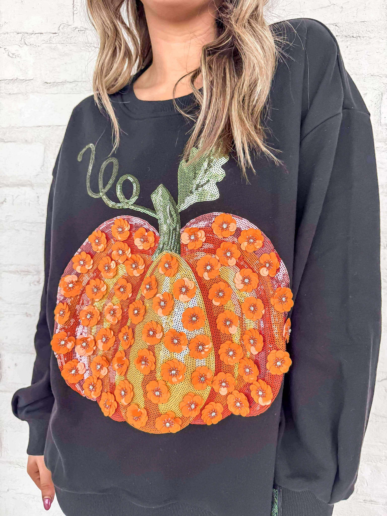 Experience the true essence of fall with our Queen of Sparkles sweatshirt. Adorned with a beautiful flower and sequin pumpkin design, this black and orange sweatshirt will add a touch of glamour to your autumn wardrobe. Embrace the season and shine like the queen you are!