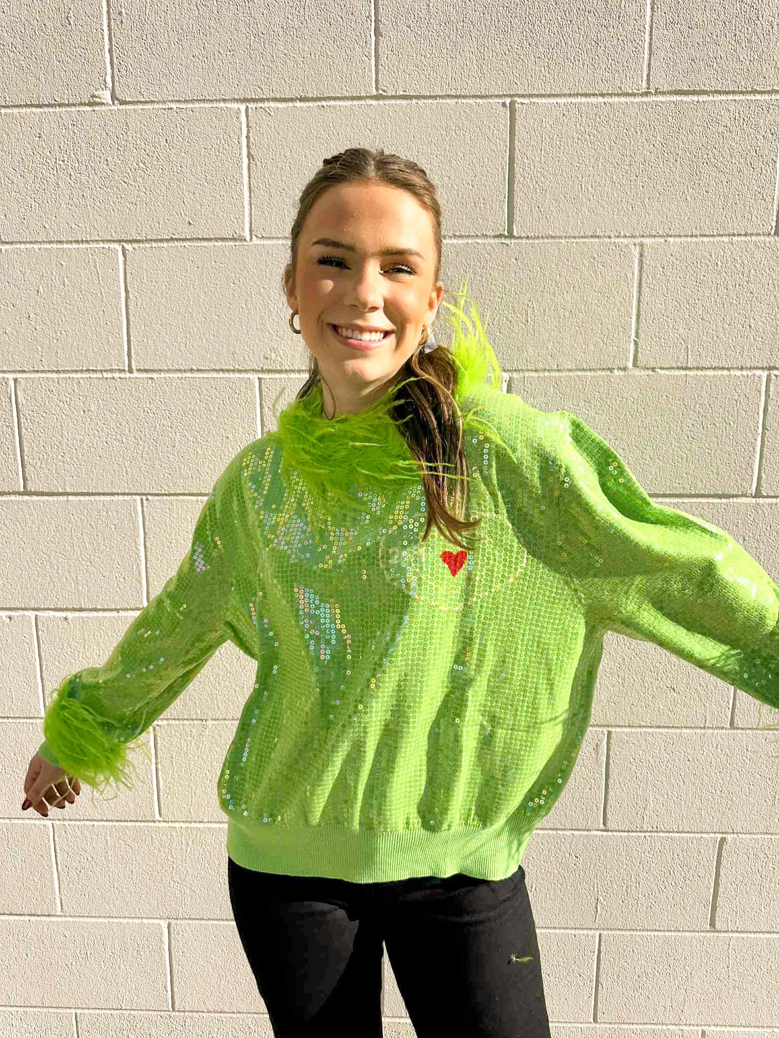 Experience the magic of the holiday season with our Queen Of Sparkles Green Full Sequin Grinch Sweatshirt! Featuring the lovable and mischievous Grinch who stole Christmas, this sweatshirt will add a touch of sparkle to your winter wardrobe. Stay cozy and stylish while spreading Christmas cheer with every step.