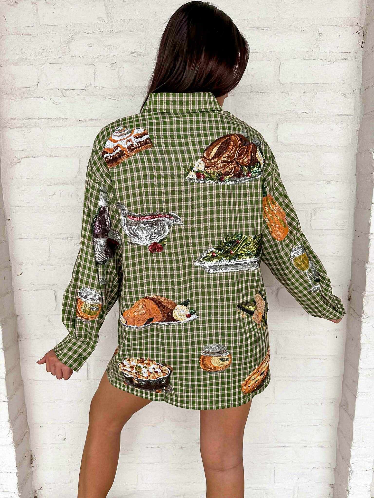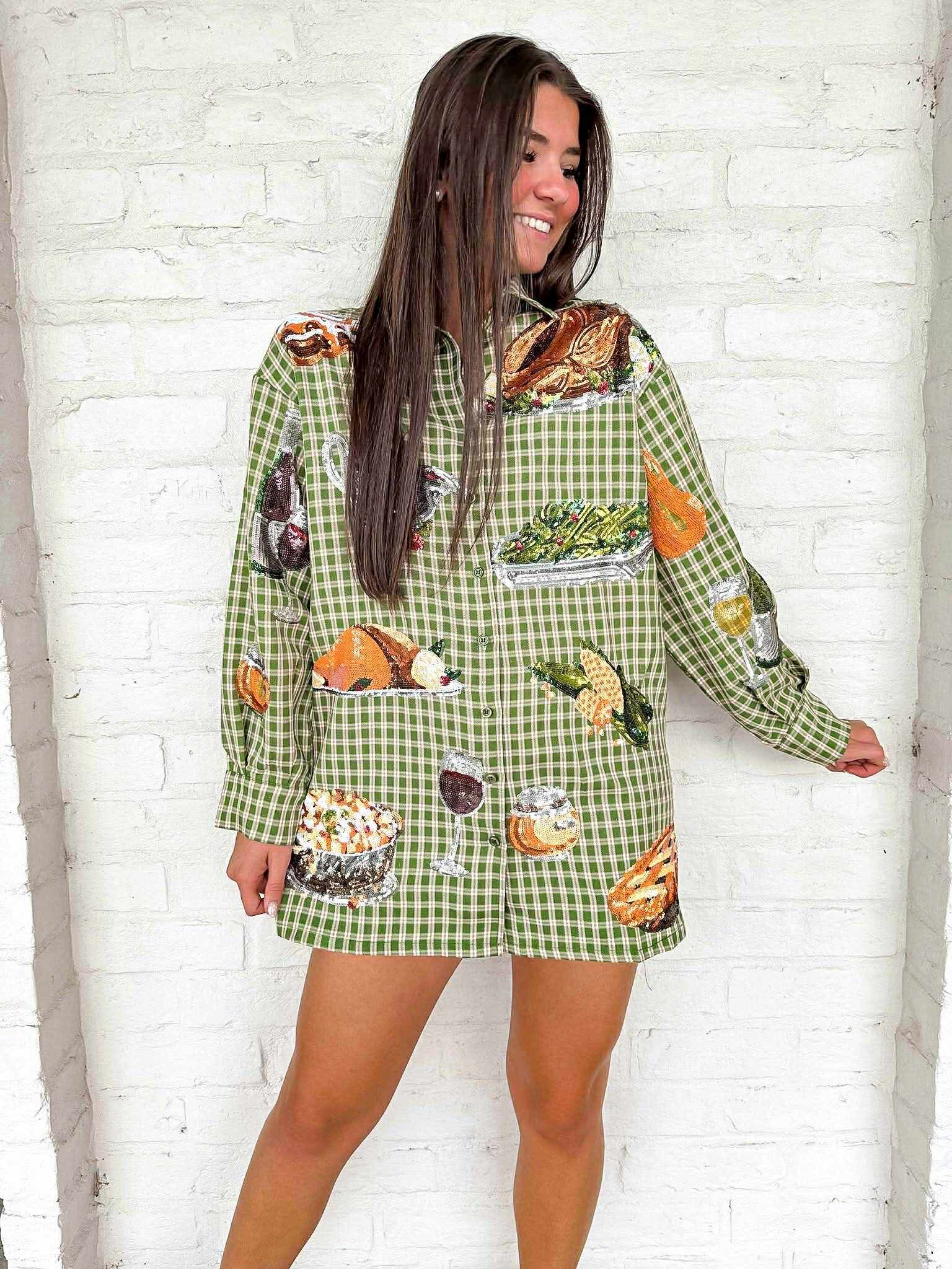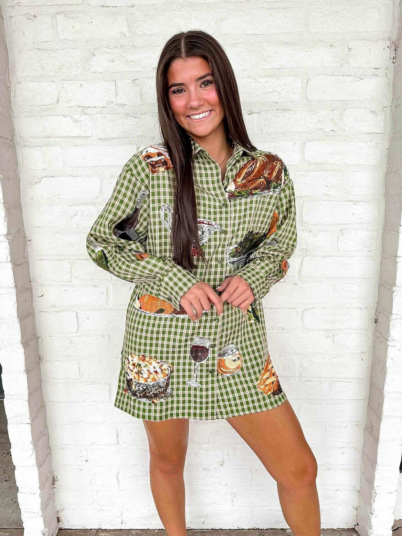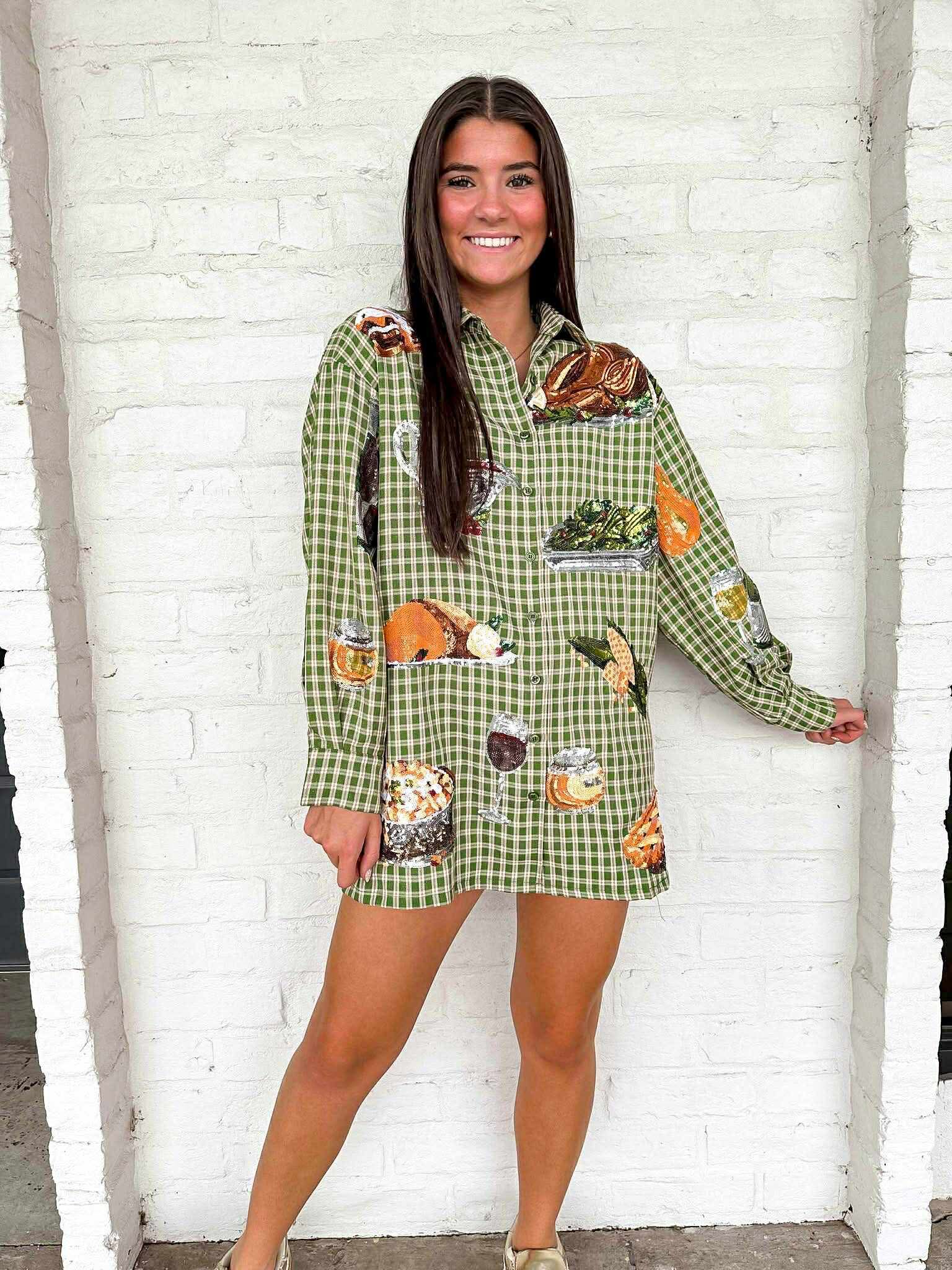 Embrace the sparkle and stand out from the crowd with our Queen Of Sparkles Green Plaid Turkey Button Up Dress. This dress features a unique turkey print that adds a touch of whimsy to your wardrobe. Be the talk of the town and make a statement with this one-of-a-kind dress.
