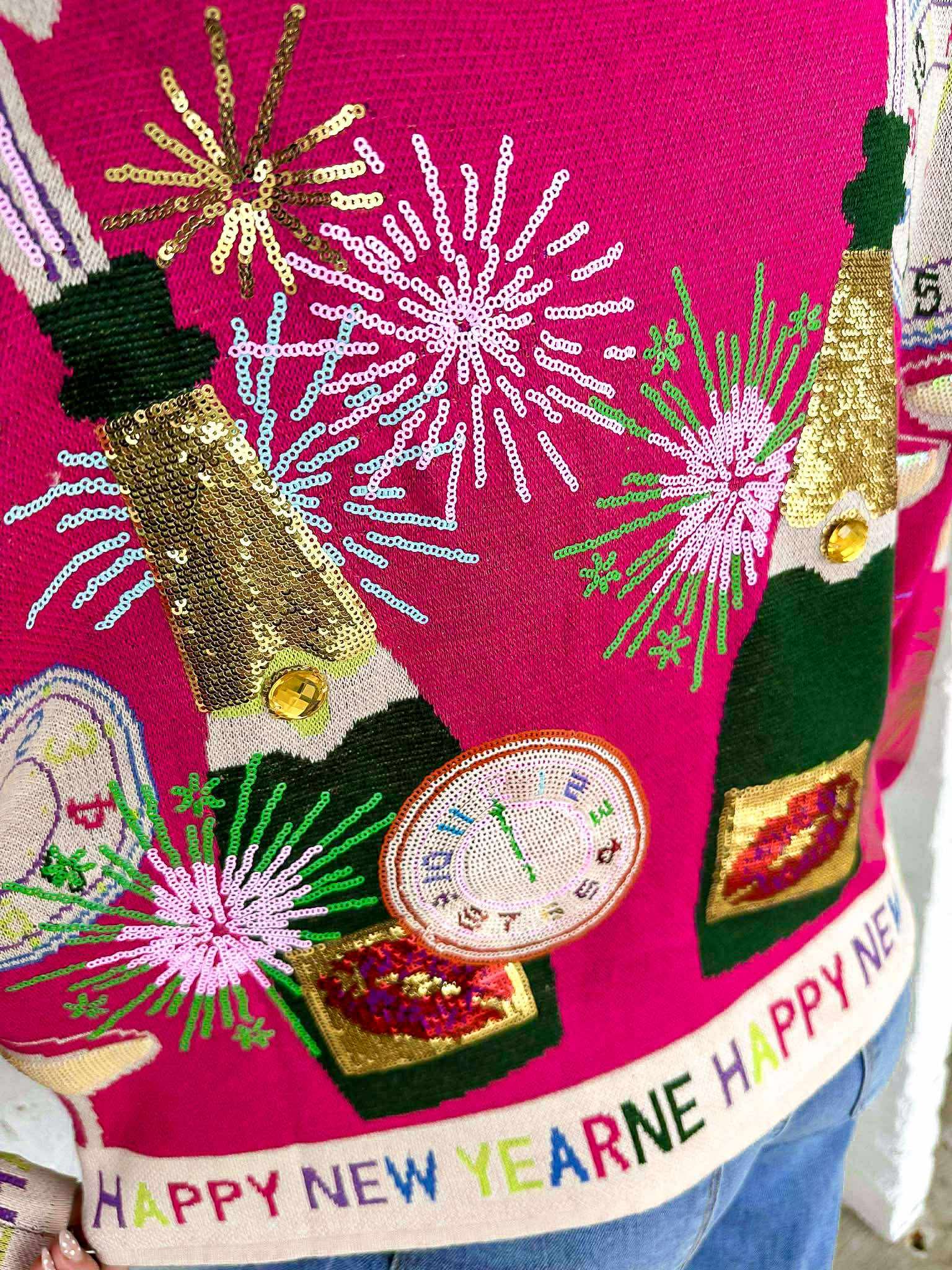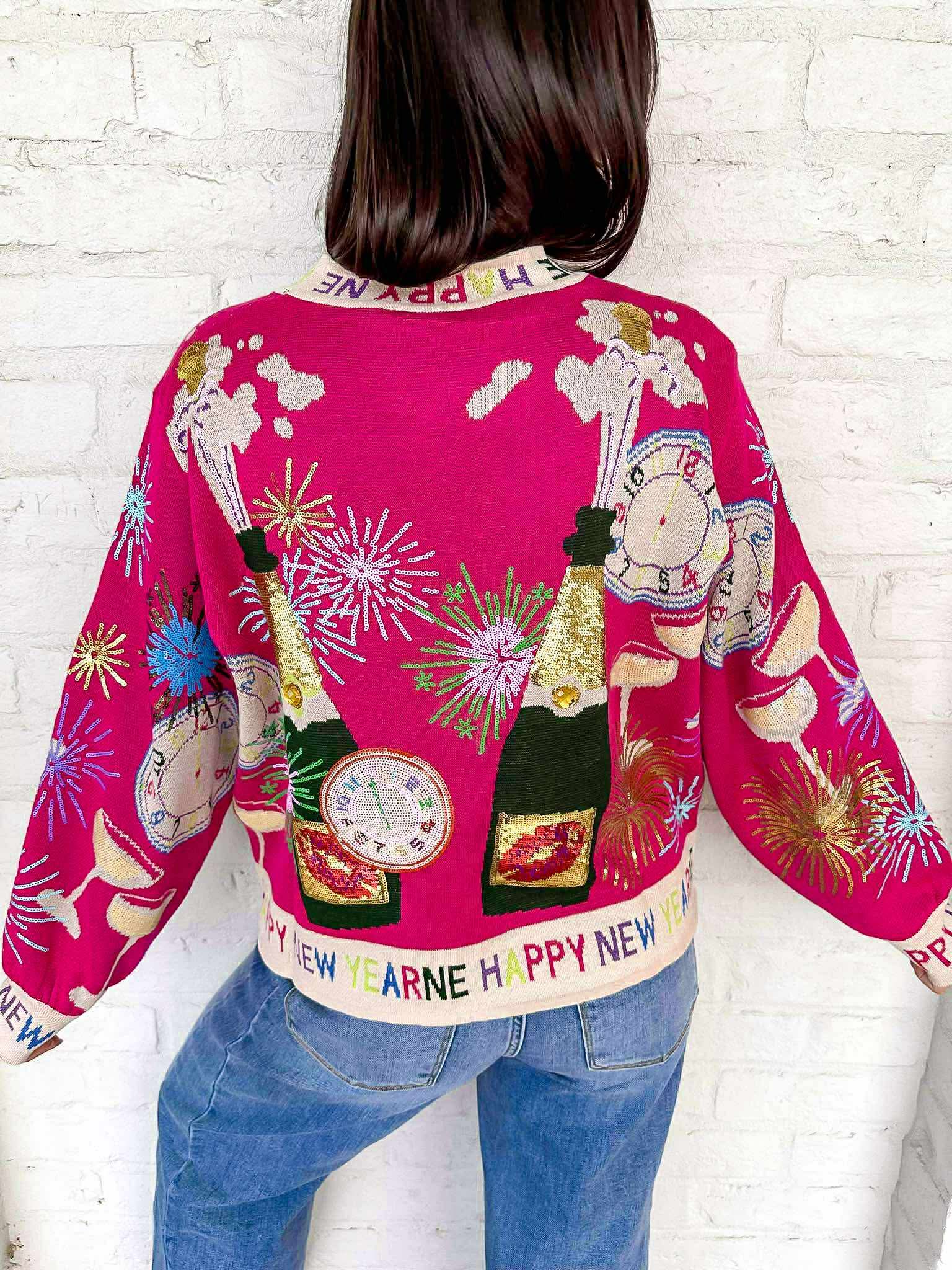Celebrate the new year in style with our Queen Of Sparkles Hot Pink NYE Icon Cardigan! Adorned with a festive "Happy New Year" trim, this cardigan will bring the perfect touch of sparkle and joy to your outfit. Spread good vibes and make a statement with this must-have piece!