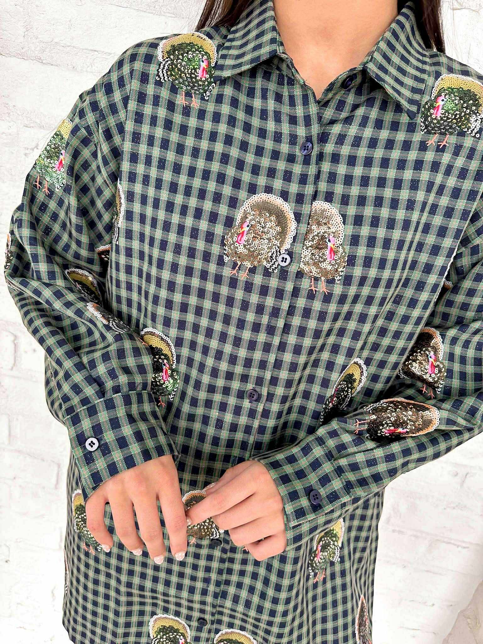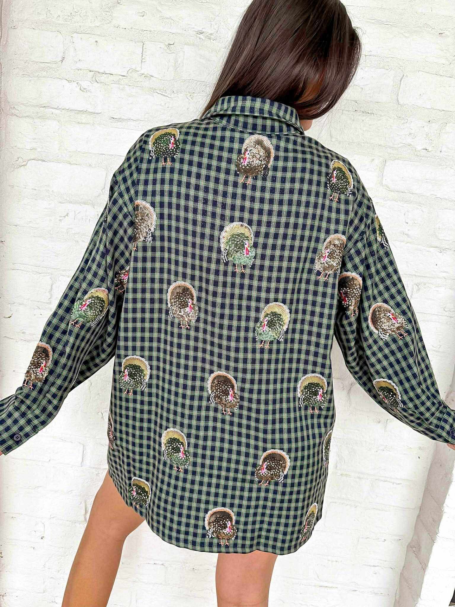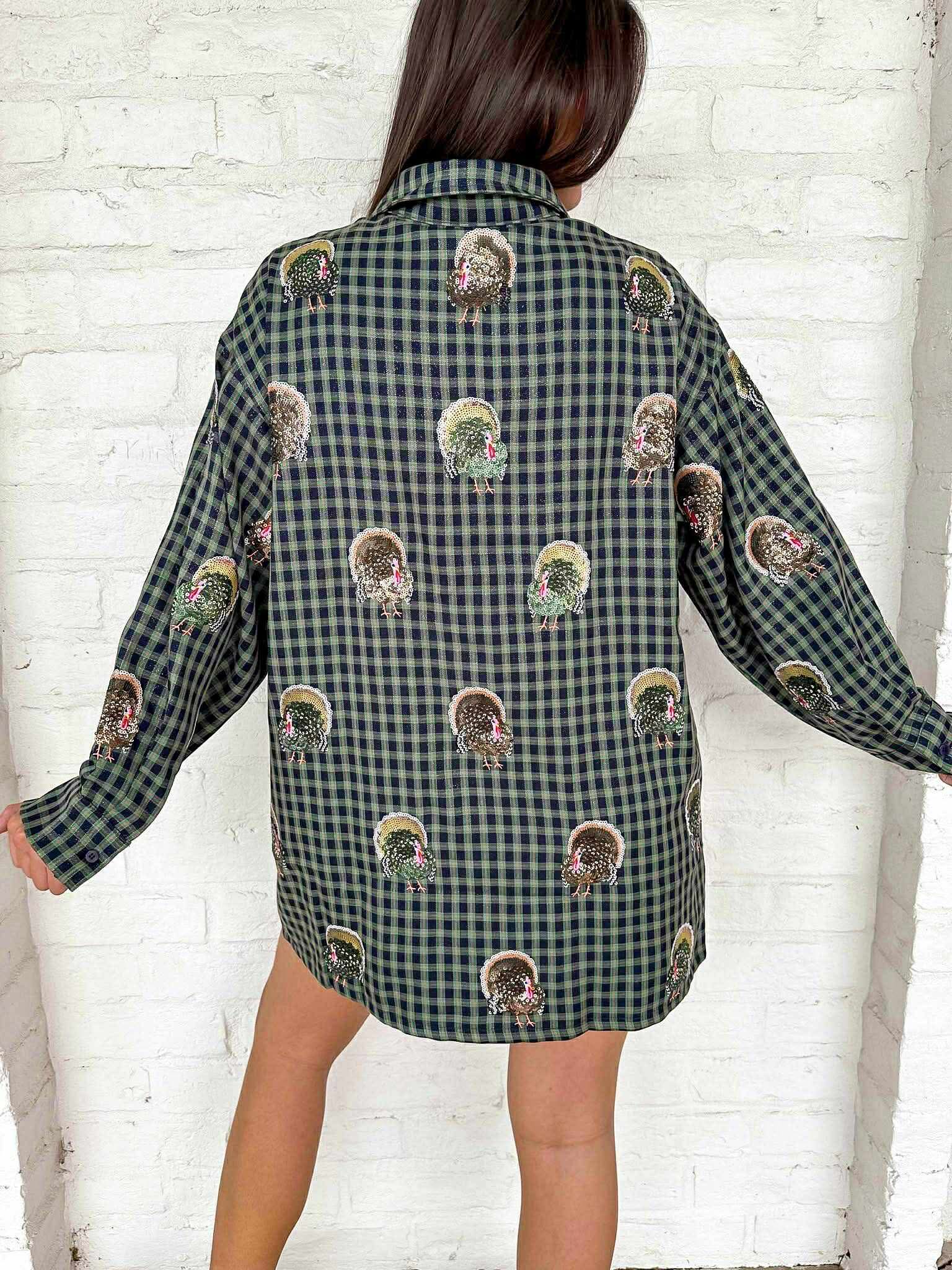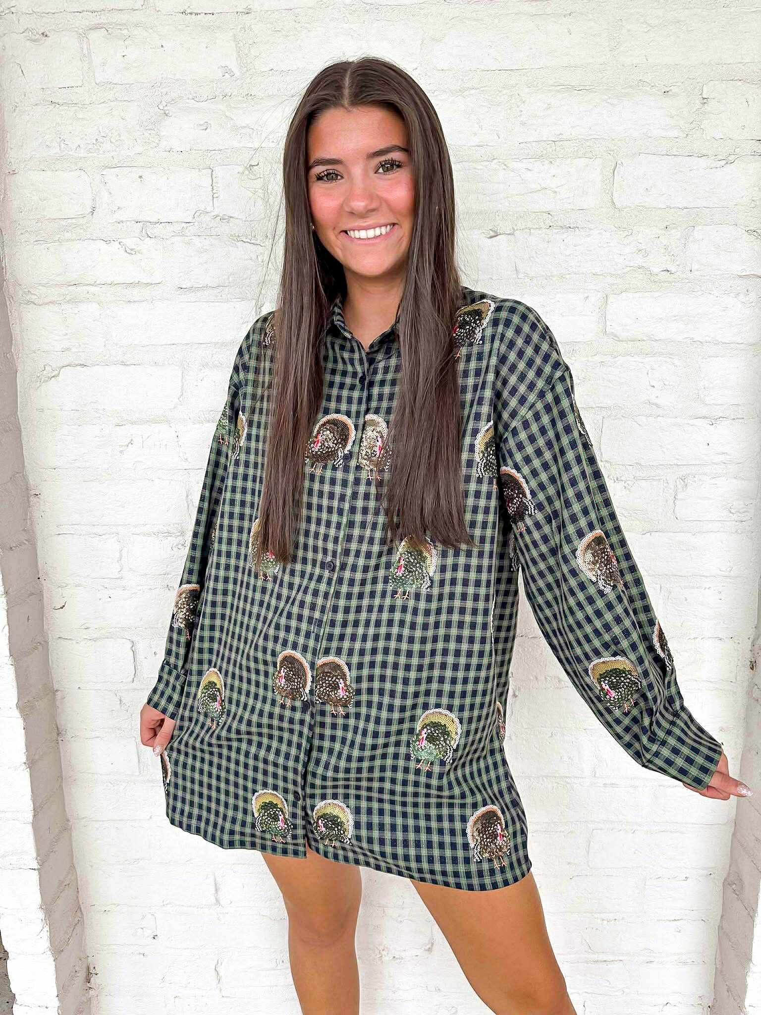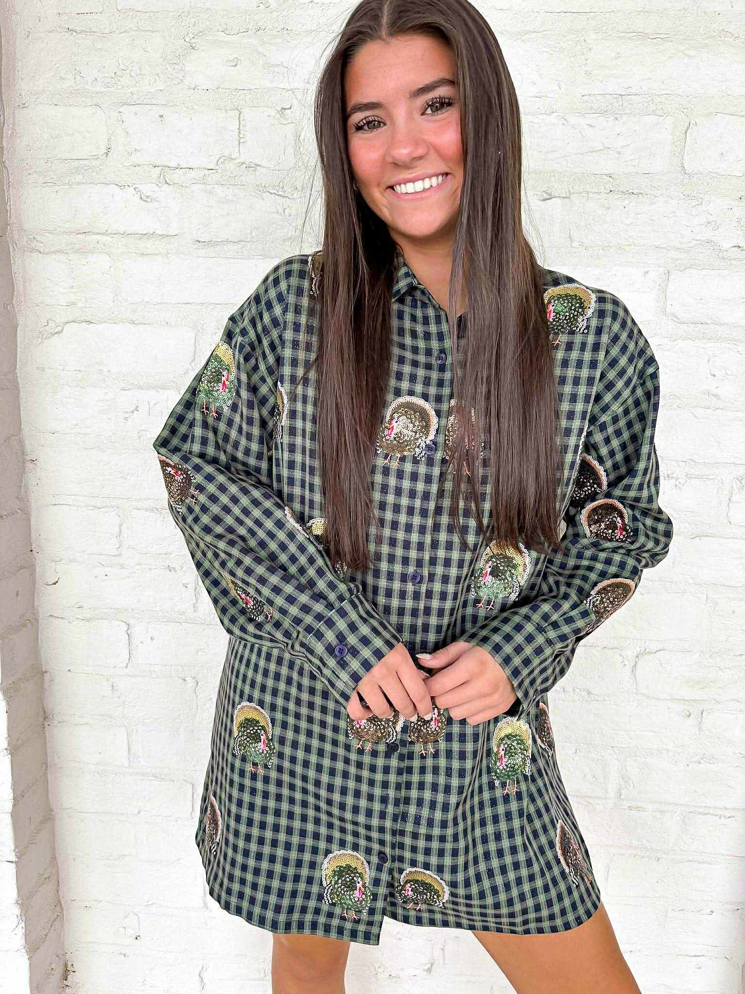 "Get ready to shine like the Queen of Sparkles this Turkey season! This navy plaid dress features scattered turkey patterns and a button-up design. The perfect outfit to show off your love for the season and make a statement with every step you take. Bring on the compliments!"