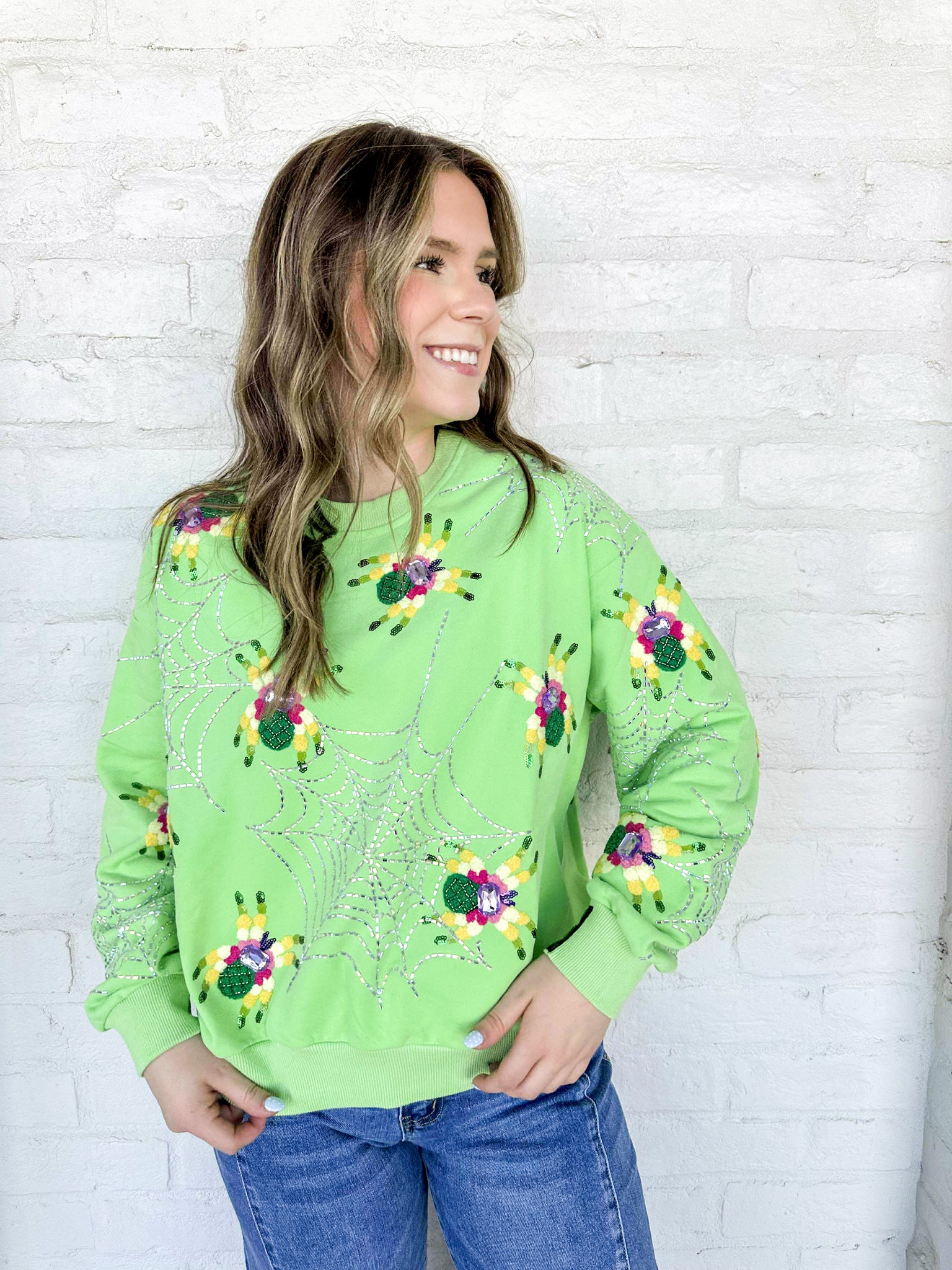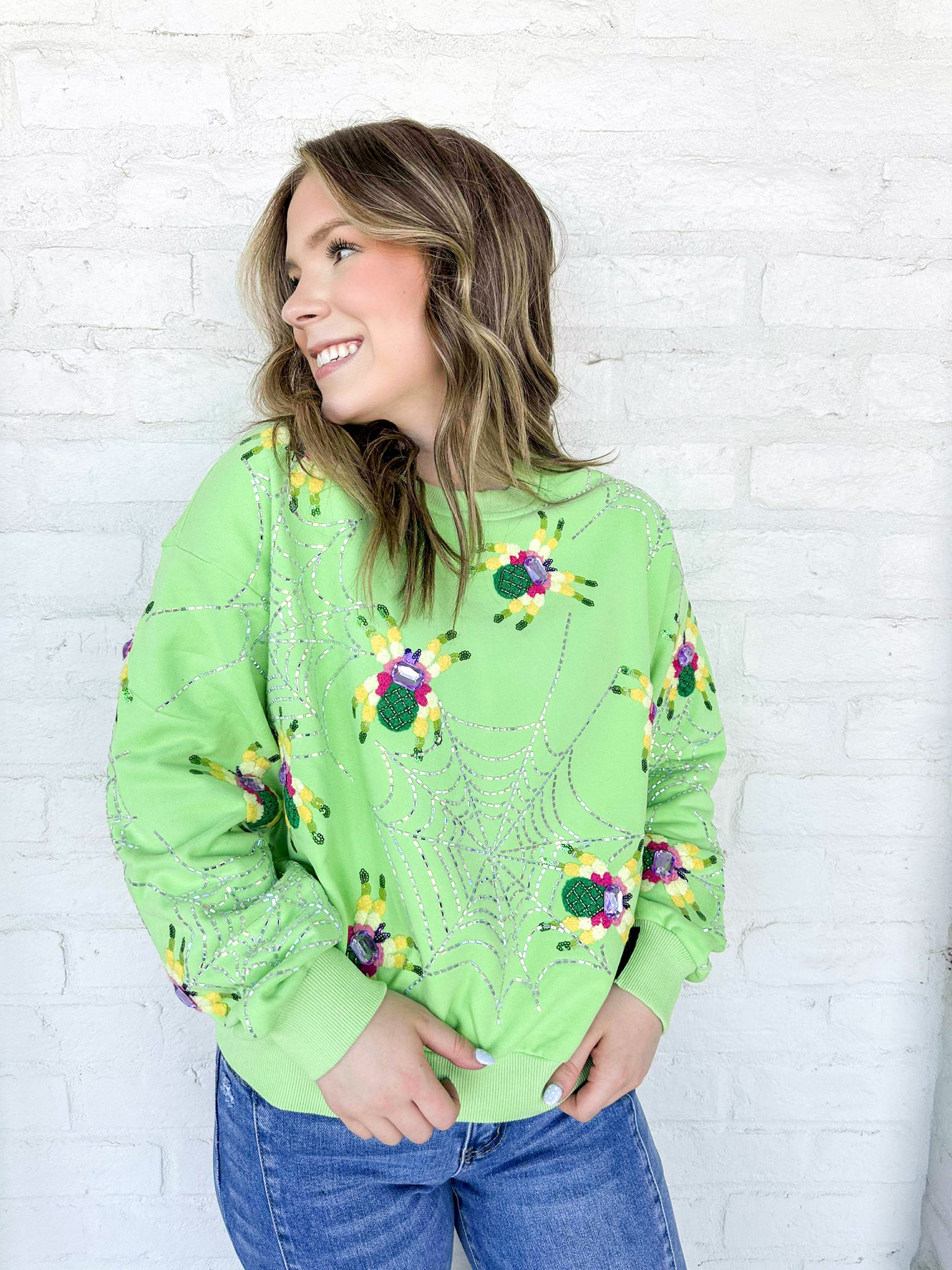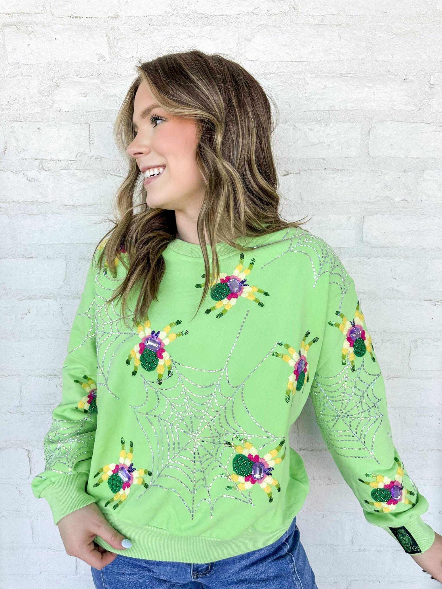 Queen Of Sparkles Neon Green Fuzzy Spider Web Sweatshirt with sequin spiders on a silver grey sparkly web