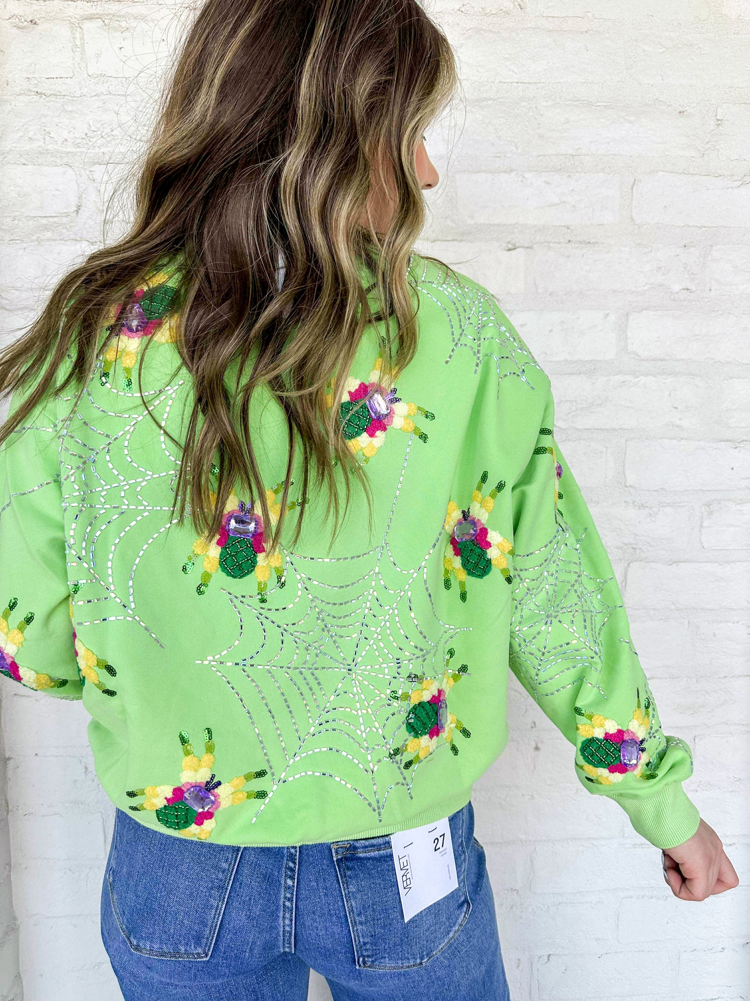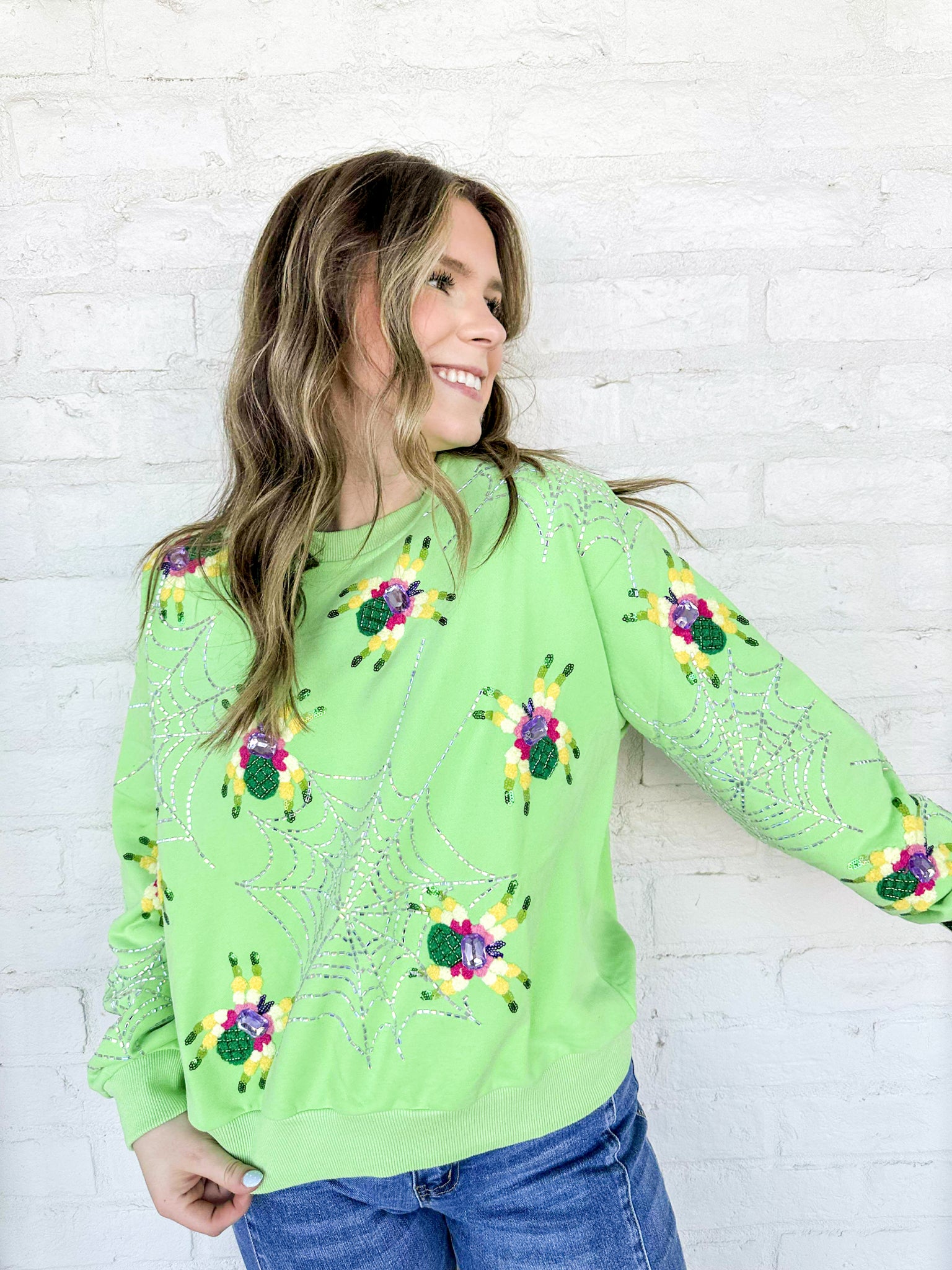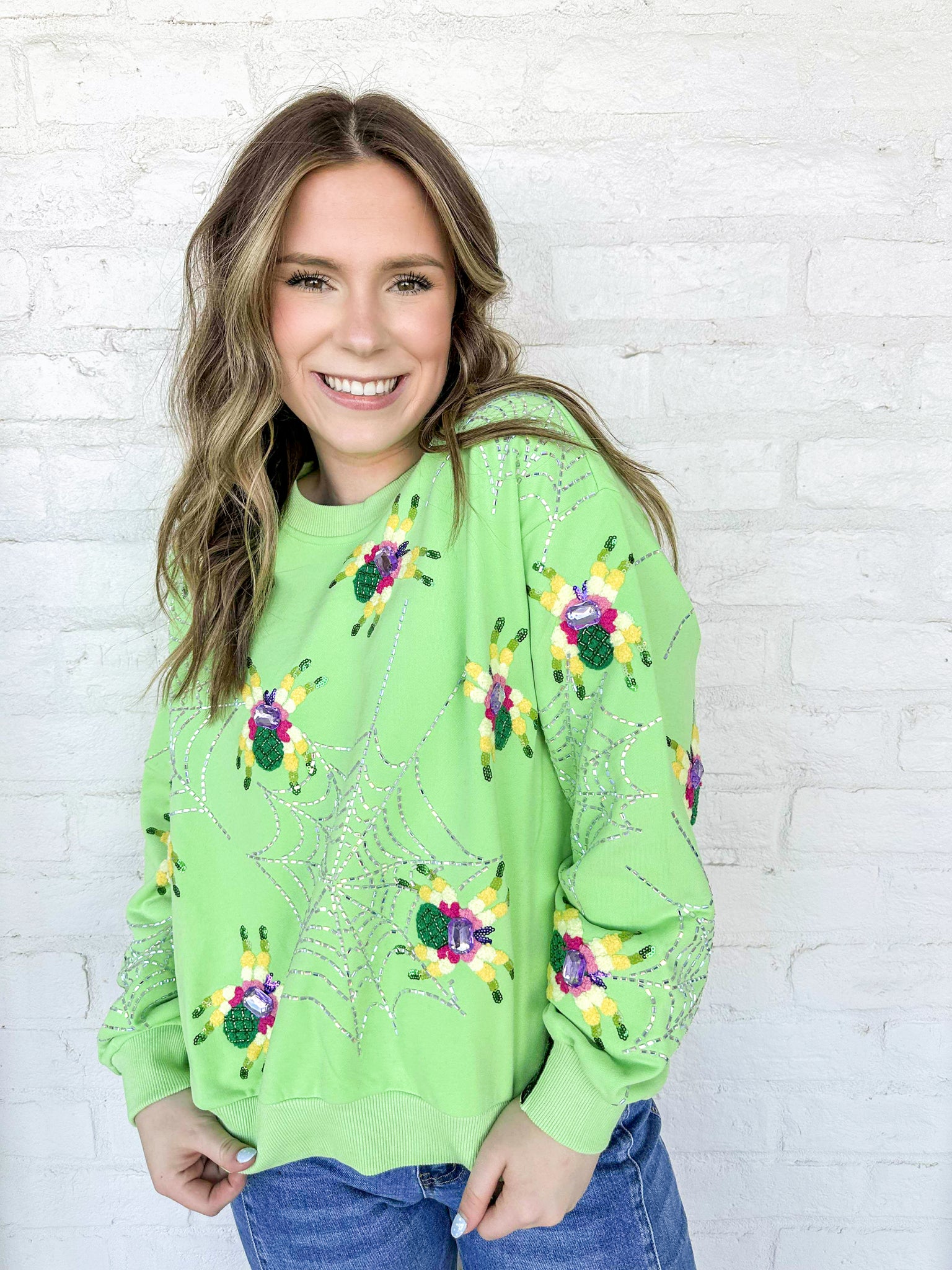 Queen Of Sparkles Neon Green Fuzzy Spider Web Sweatshirt with sequin spiders on a silver grey sparkly web