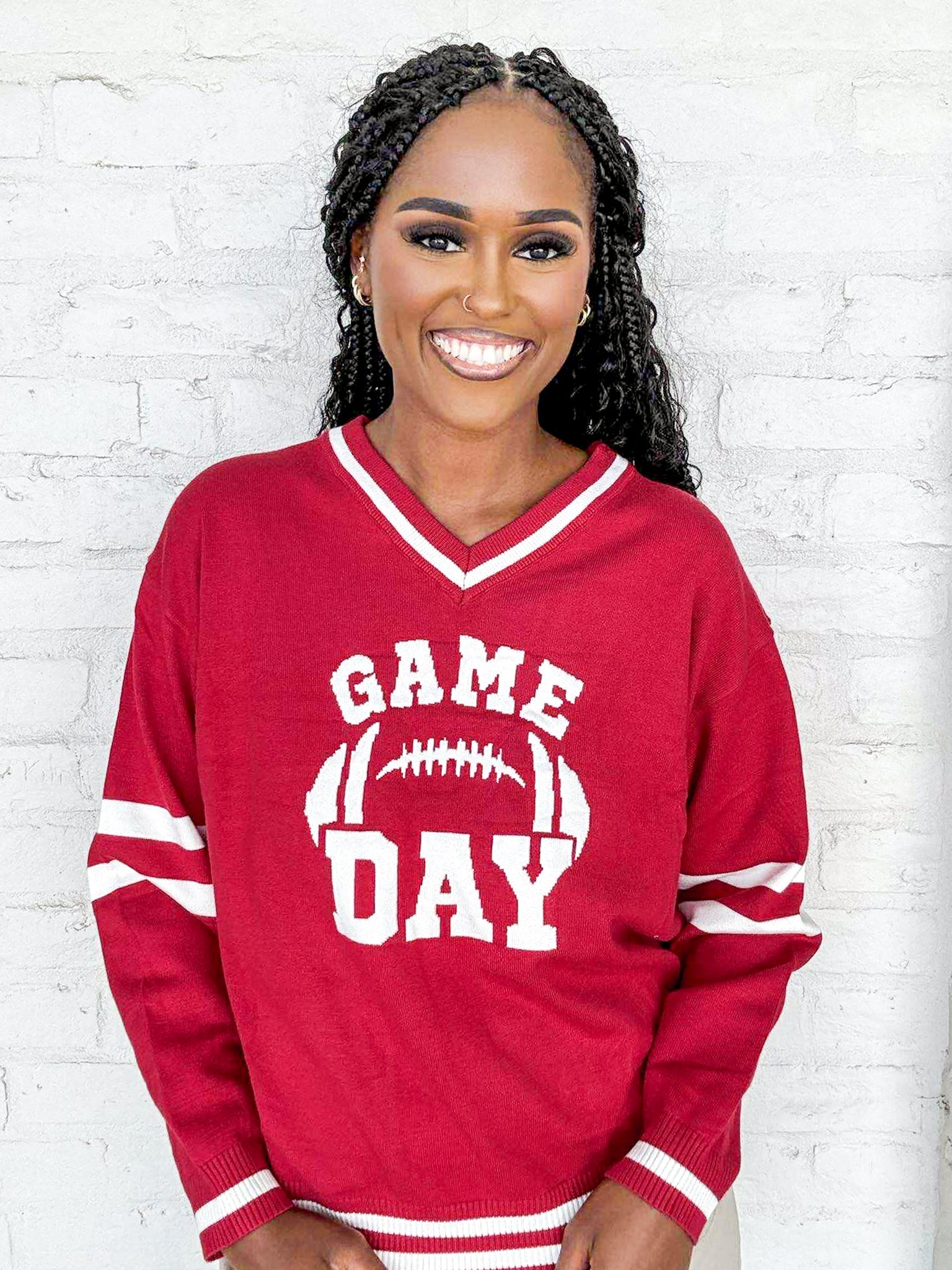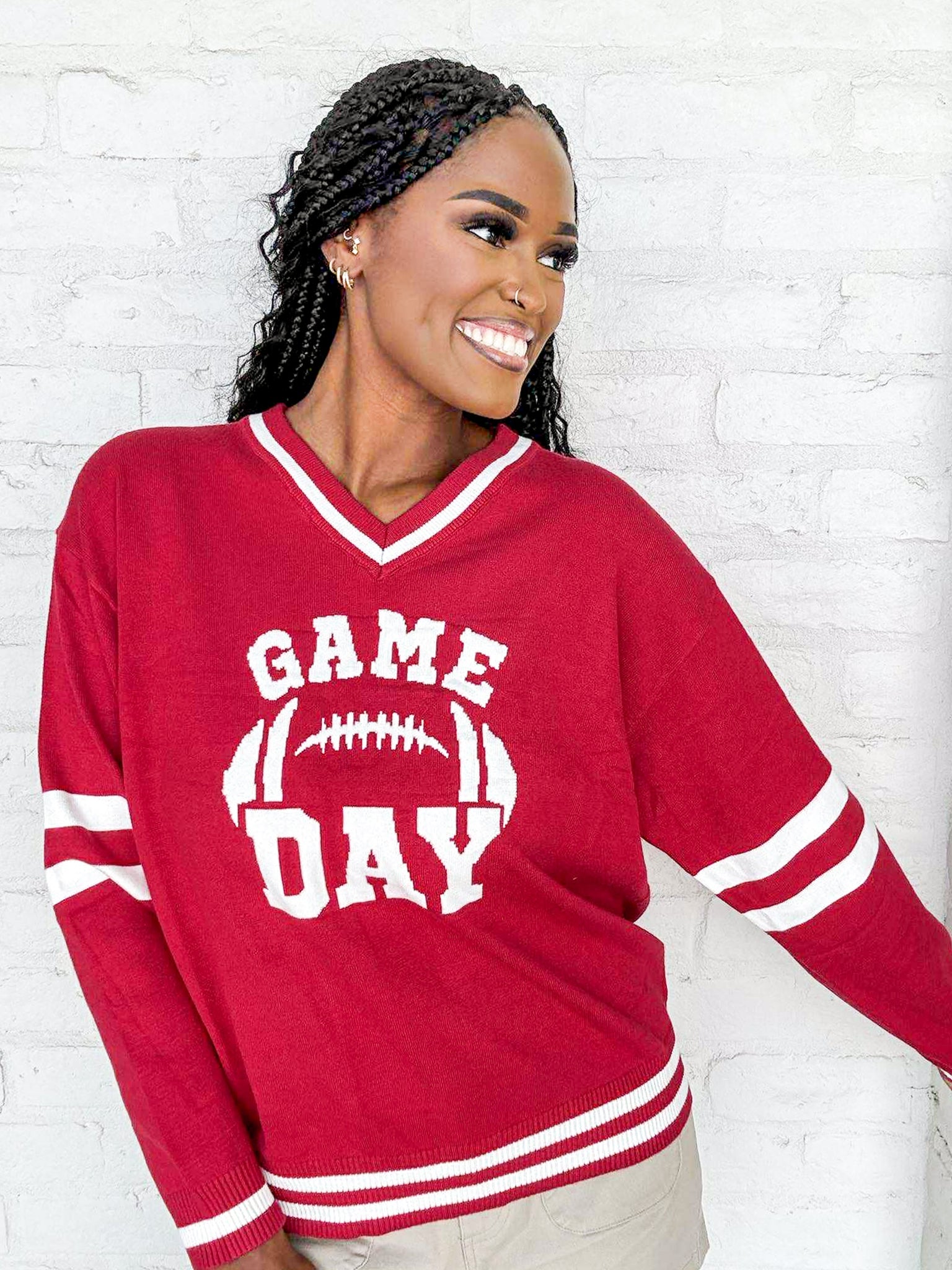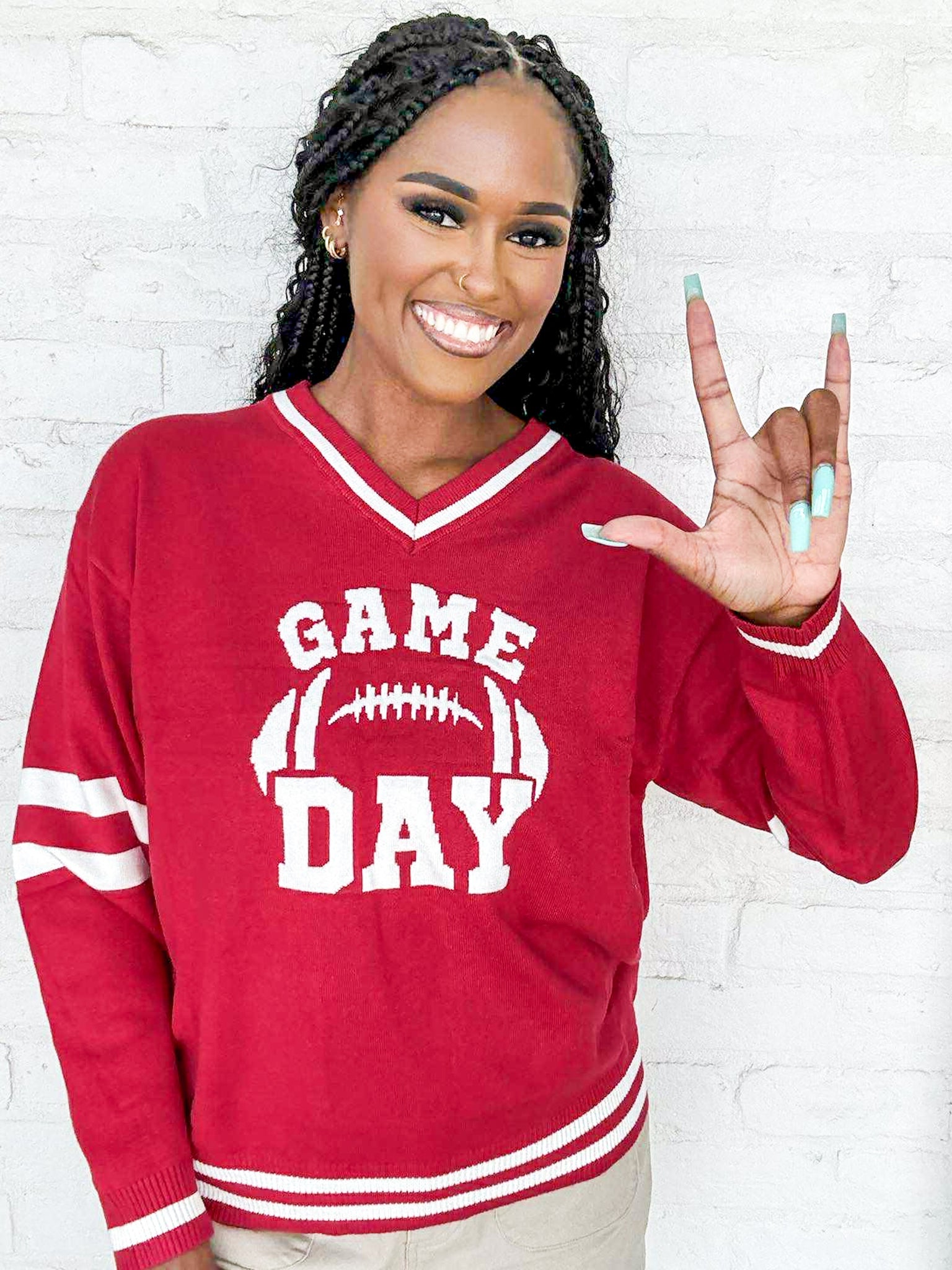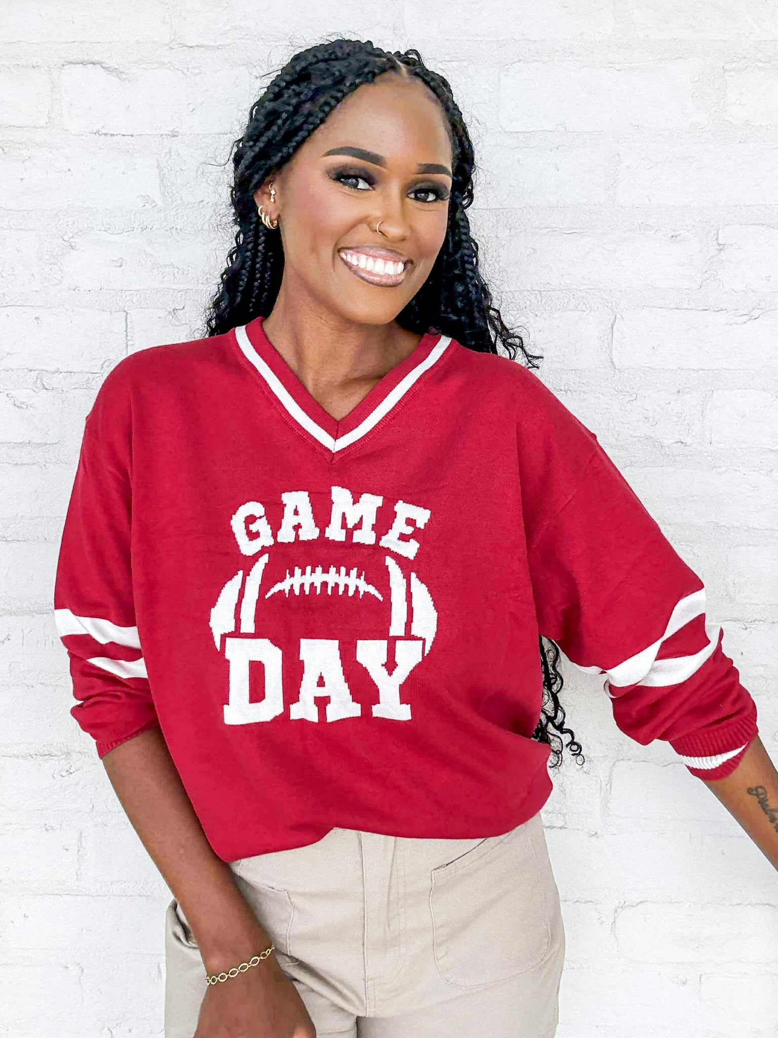 Get ready for the ultimate game day look with our Varsity Game Day Top! This long sleeve V-neck varsity sweater top will have you looking and feeling like a true fan. Don't miss out on the perfect combination of style and comfort for your next game day.