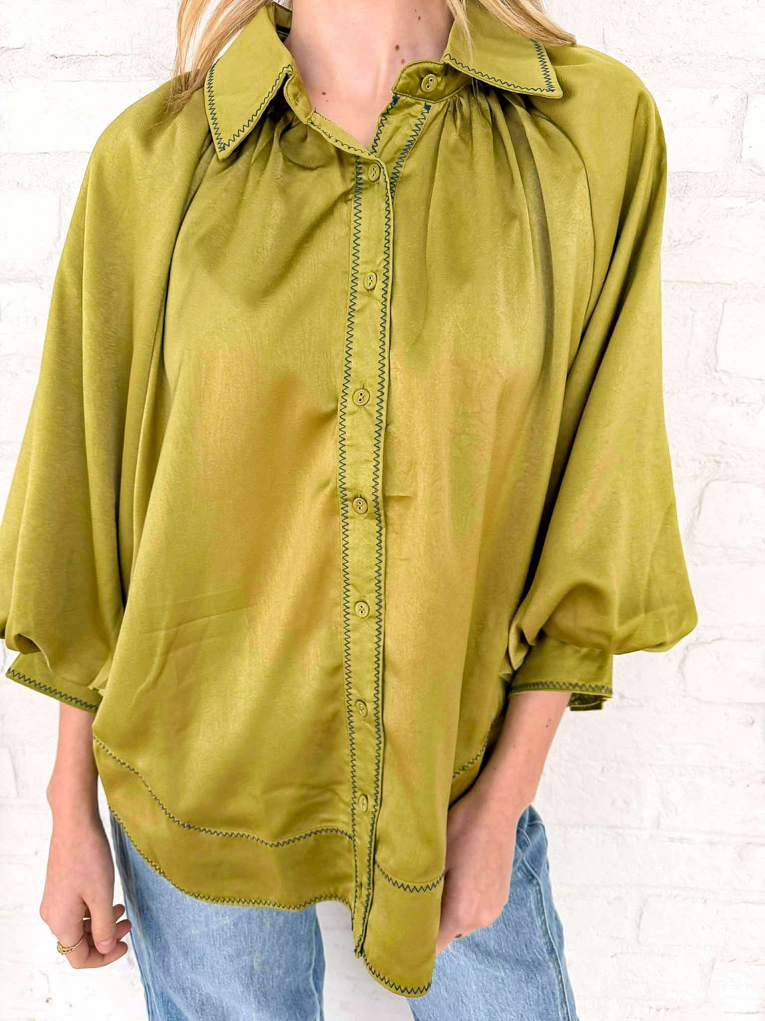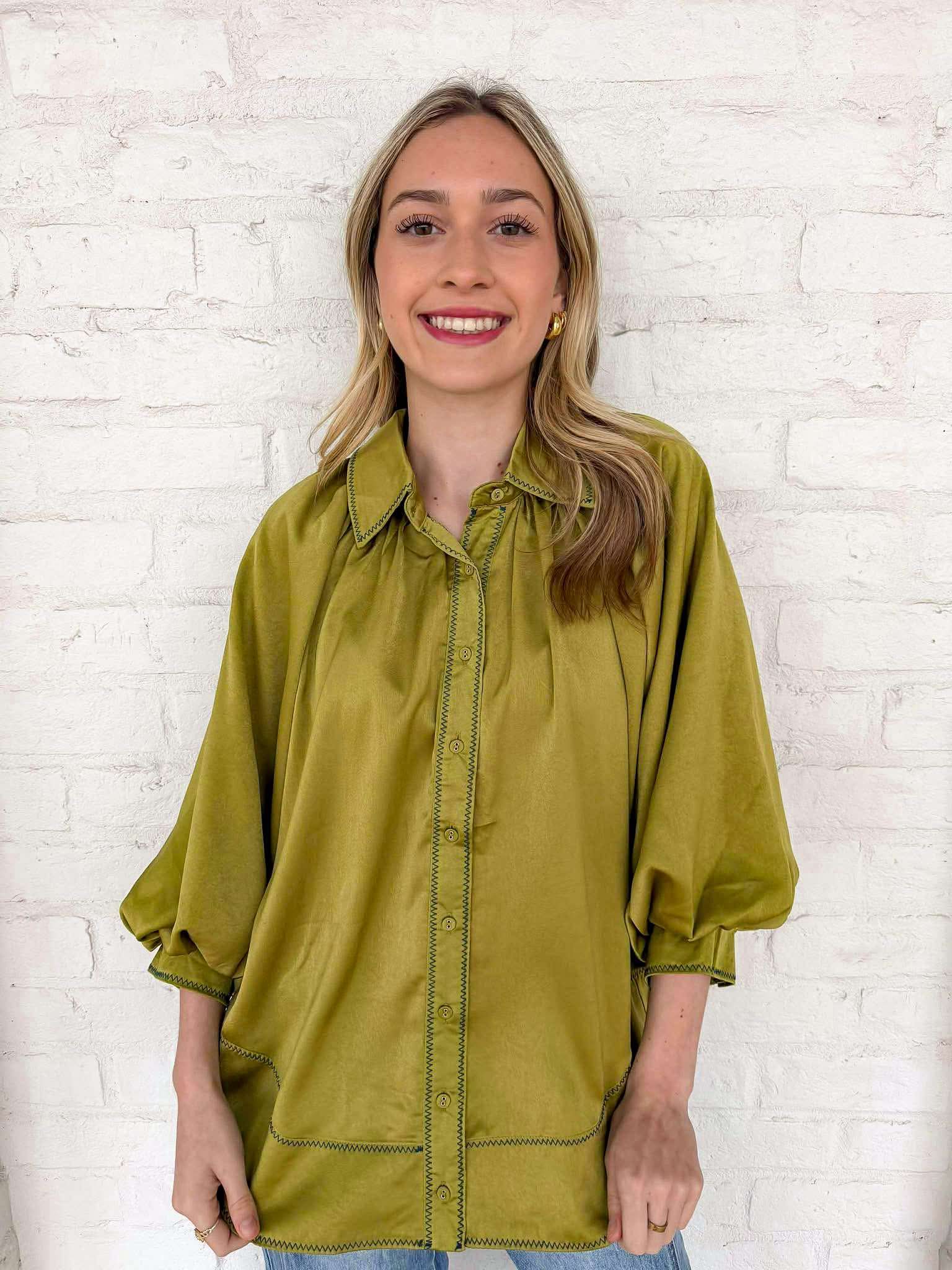 Elevate your wardrobe with the Enough Talking Top! This stunning button-down features elegant satin balloon sleeves that exude sophistication. Imagine the soft touch of the fabric against your skin as you step out in style—perfect for making a statement at any occasion. Embrace your unique flair and shine!