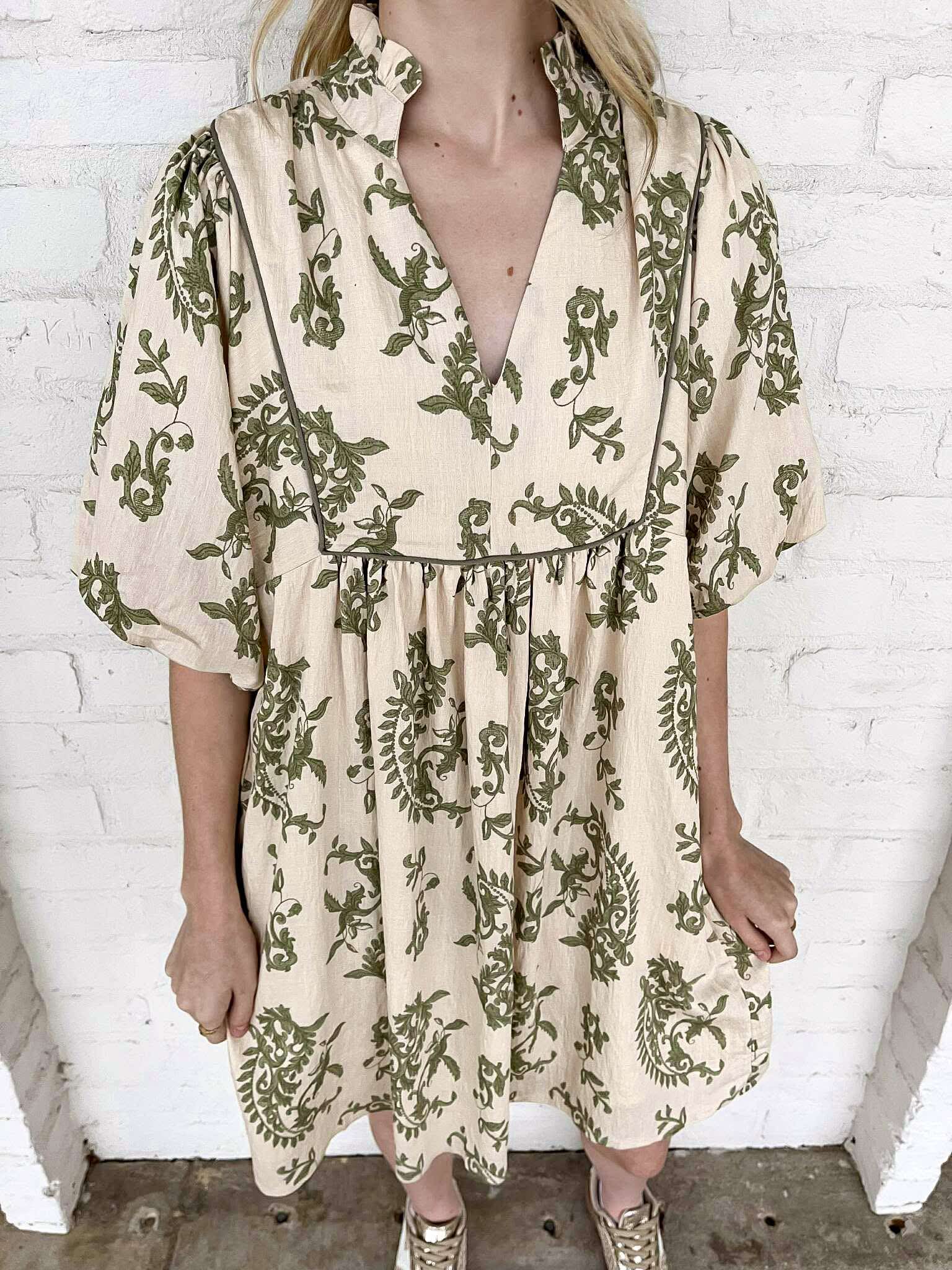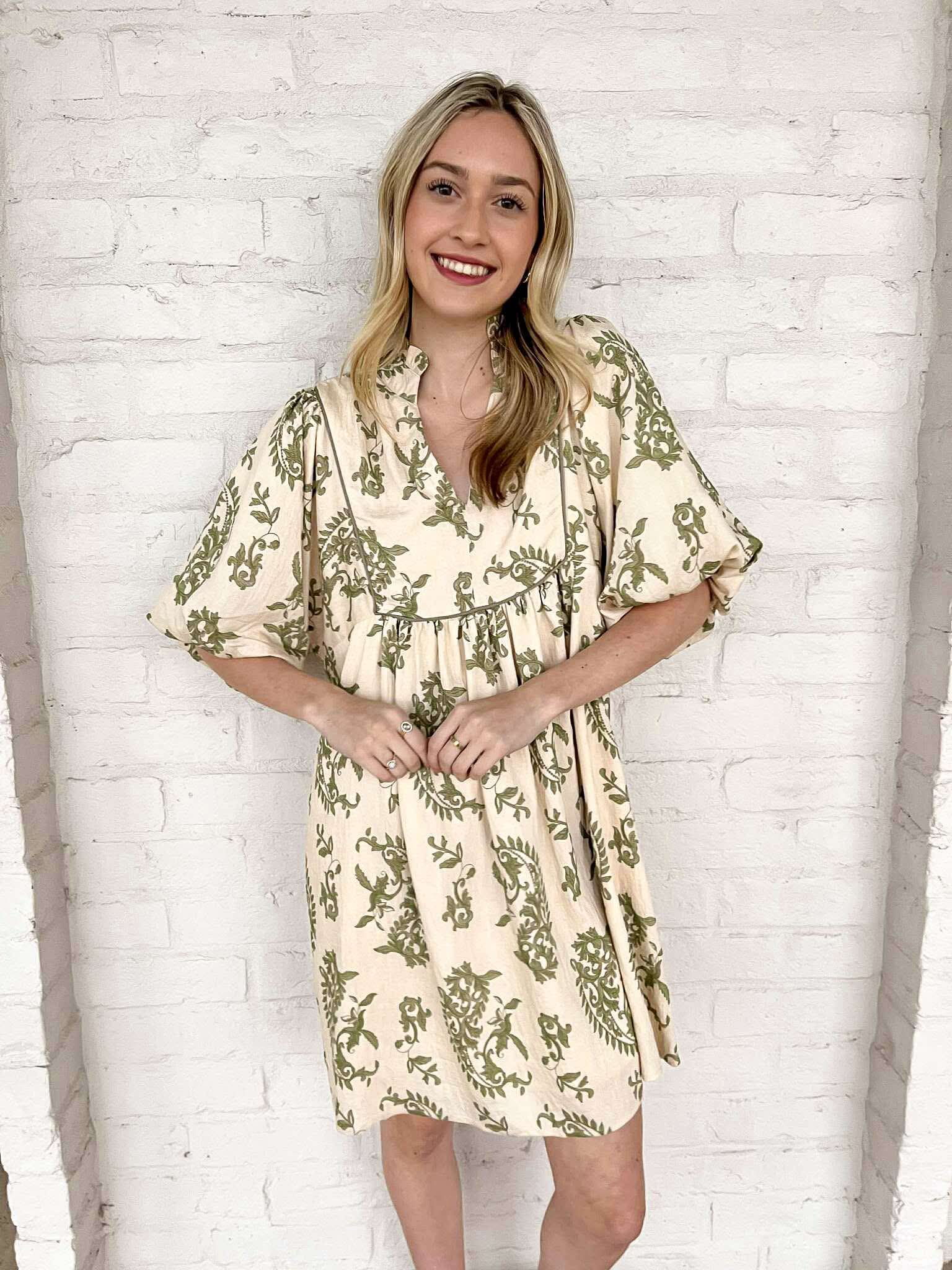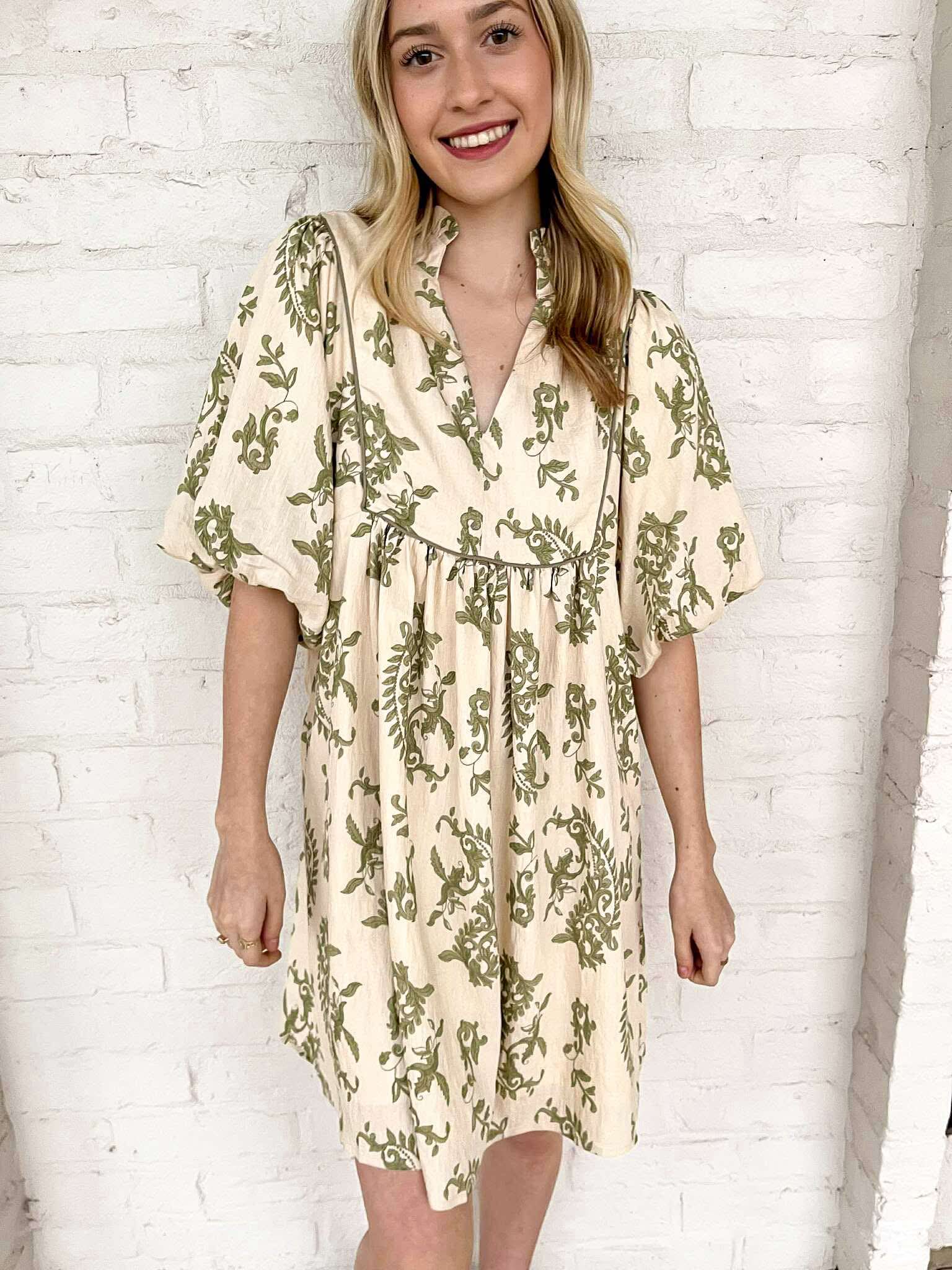 Embrace effortless elegance with the Vineyard View Printed Dress. Its charming babydoll silhouette features a delightful ruffled neck and exquisite piping details, offering a unique blend of playfulness and sophistication. This dress will inspire confidence and turn heads, making every occasion feel special! Feel beautiful, feel bold!