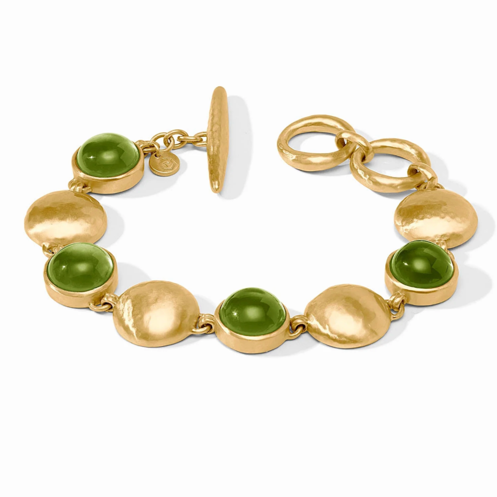 Elevate your everyday look with the Julie Vos Solara Stone Bracelet in Iridescent Palmetto. Crafted to highlight the beauty of the hammered gold and iridescent stone, this bracelet adds a sophisticated touch to any outfit. Made with high-quality materials, this bracelet is sure to become a staple in your jewelry collection. Upgrade your style now!