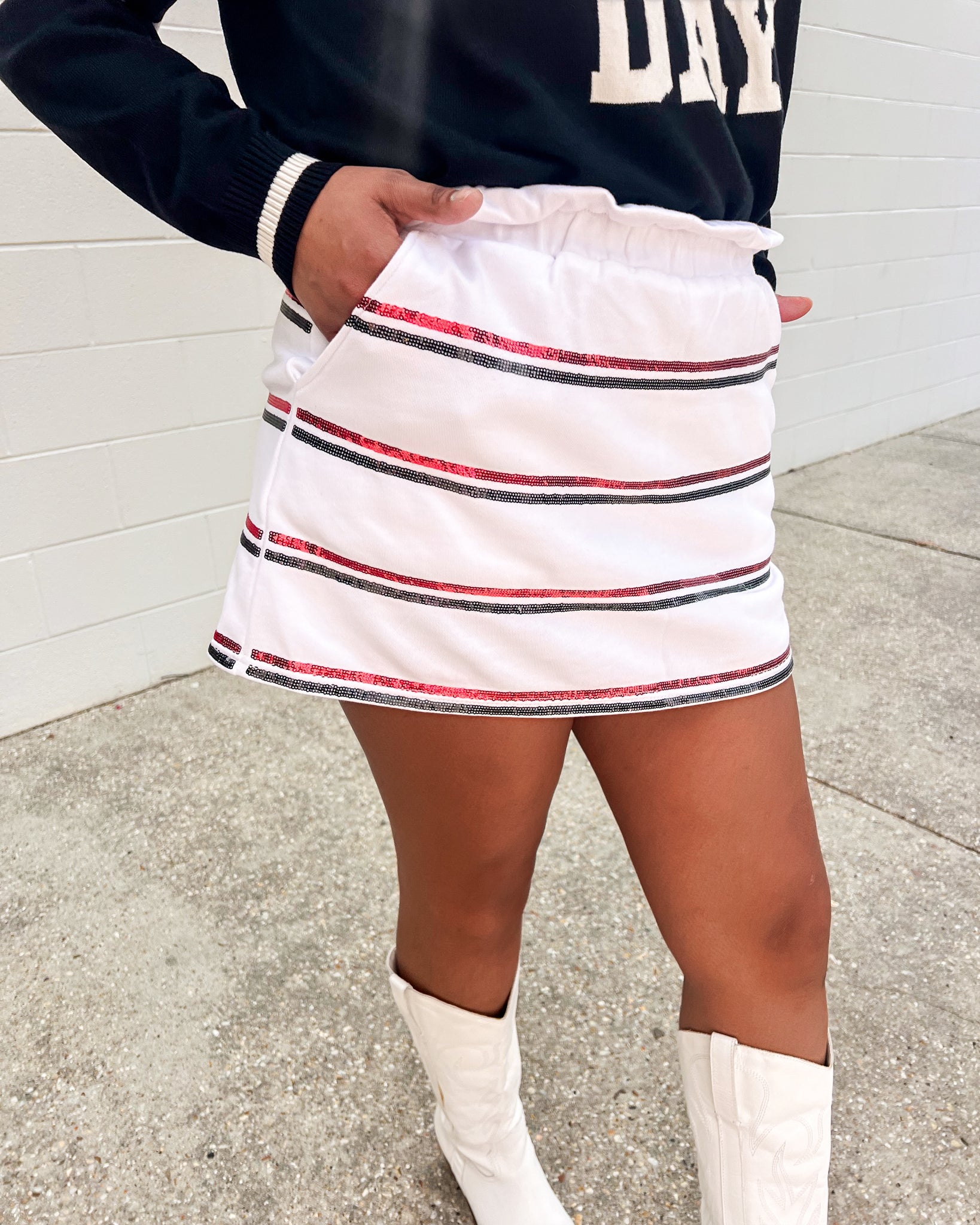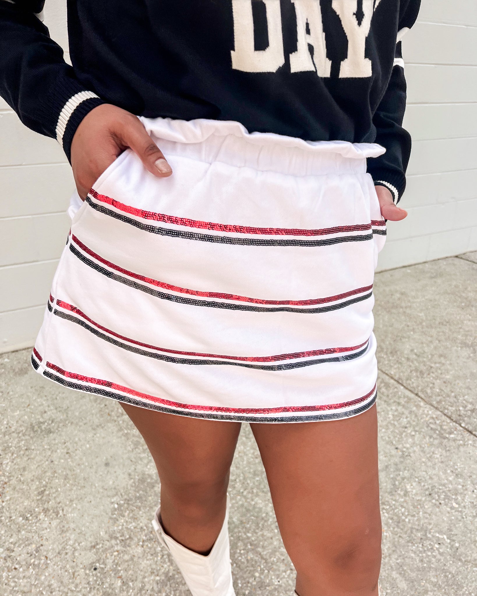 Show up to game day in style with this chic Cajuns sequin stripe skort, designed for tailgates, stadium days, and spirited weekends. With bold red and black sequin stripe details and a comfortable elastic waistband, this skort combines boutique fashion with effortless team spirit.