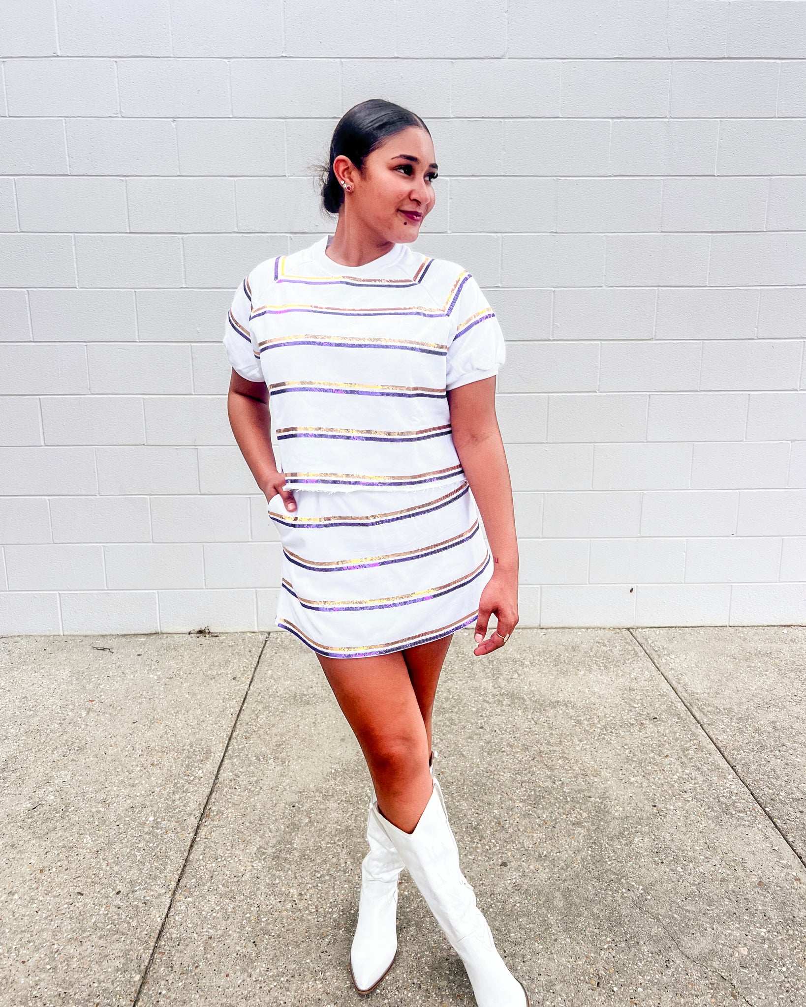 Cheer on the LSU Tigers in style with this purple and gold sequin game day skort, perfect for tailgates, stadium days, and spirited weekends. Designed with sparkly team-colored stripes and a comfortable elastic waistband, this boutique piece combines fashion-forward sparkle with game day spirit.