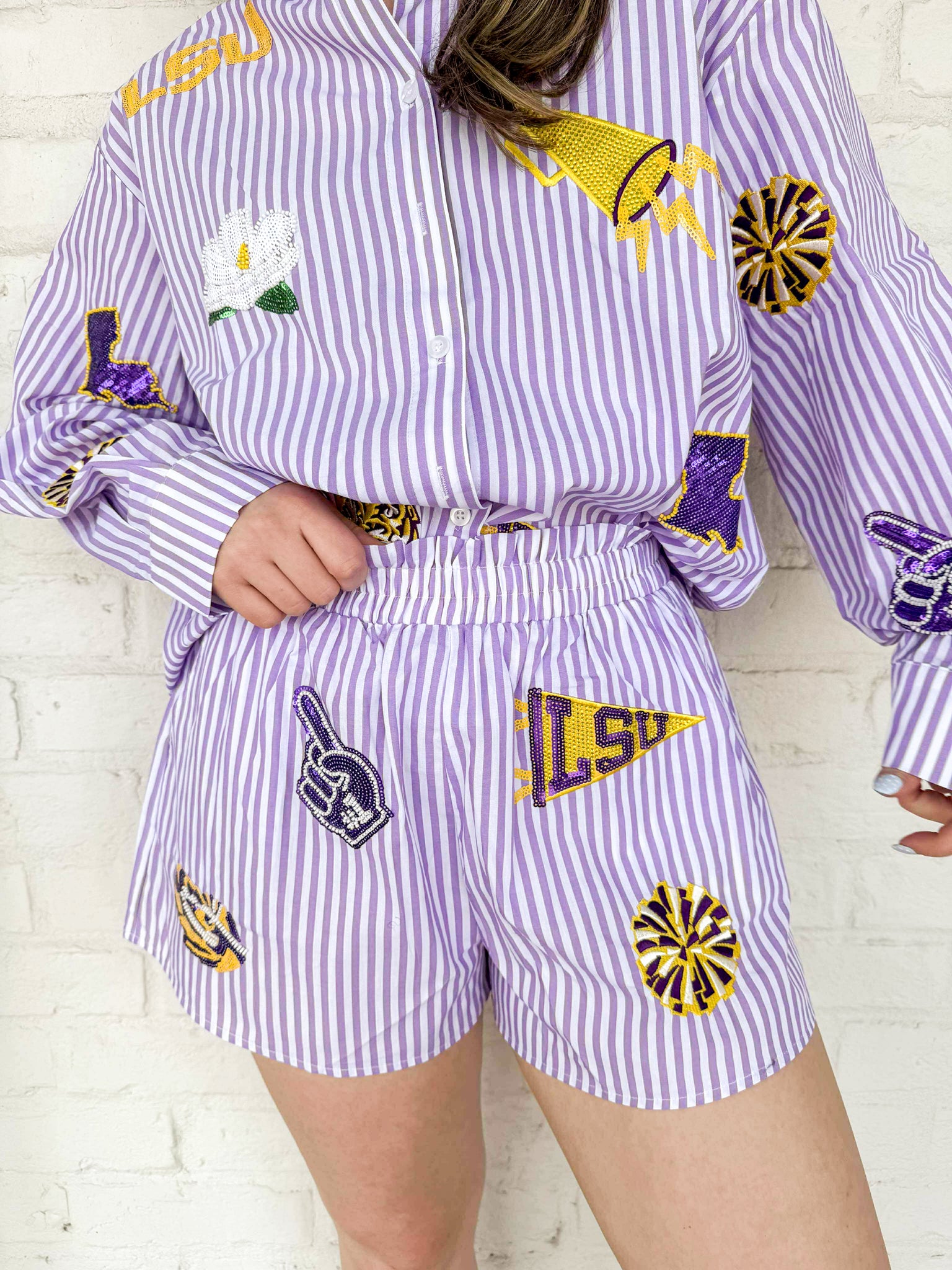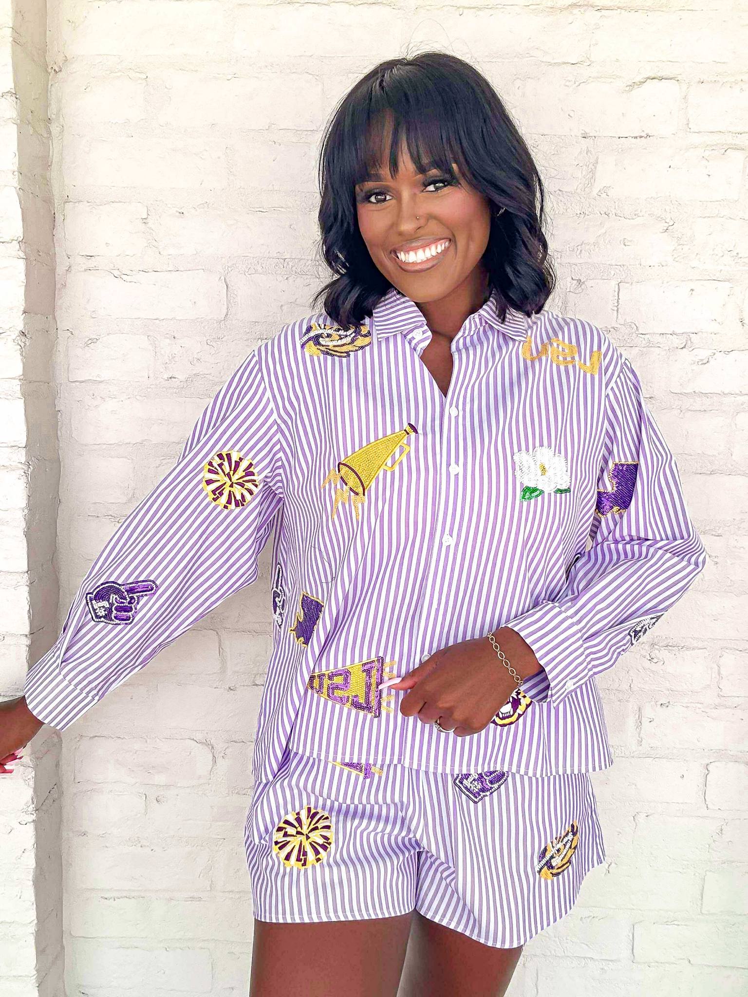 Show off your LSU pride with our Queen of Sparkles Mini Icon Striped Button Down Top! Perfect for gameday, this stylish top will make you the center of attention. With vibrant colors and a flattering fit, you'll be the ultimate fan and fashionista!
