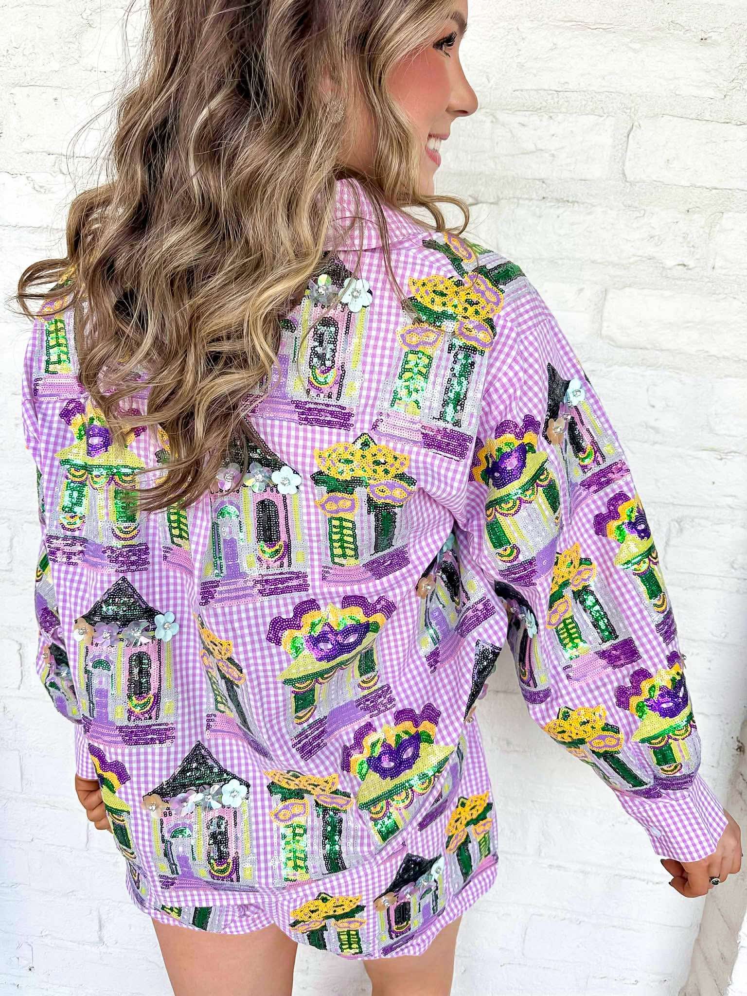 The Queen Of Sparkles Diamond Mardi Gras Porches Button Up is a must-have for any fashion-forward individual. With its vibrant and eye-catching porches design, you'll be sure to stand out in any crowd. Make a statement and let your style sparkle with this unique and dazzling piece!