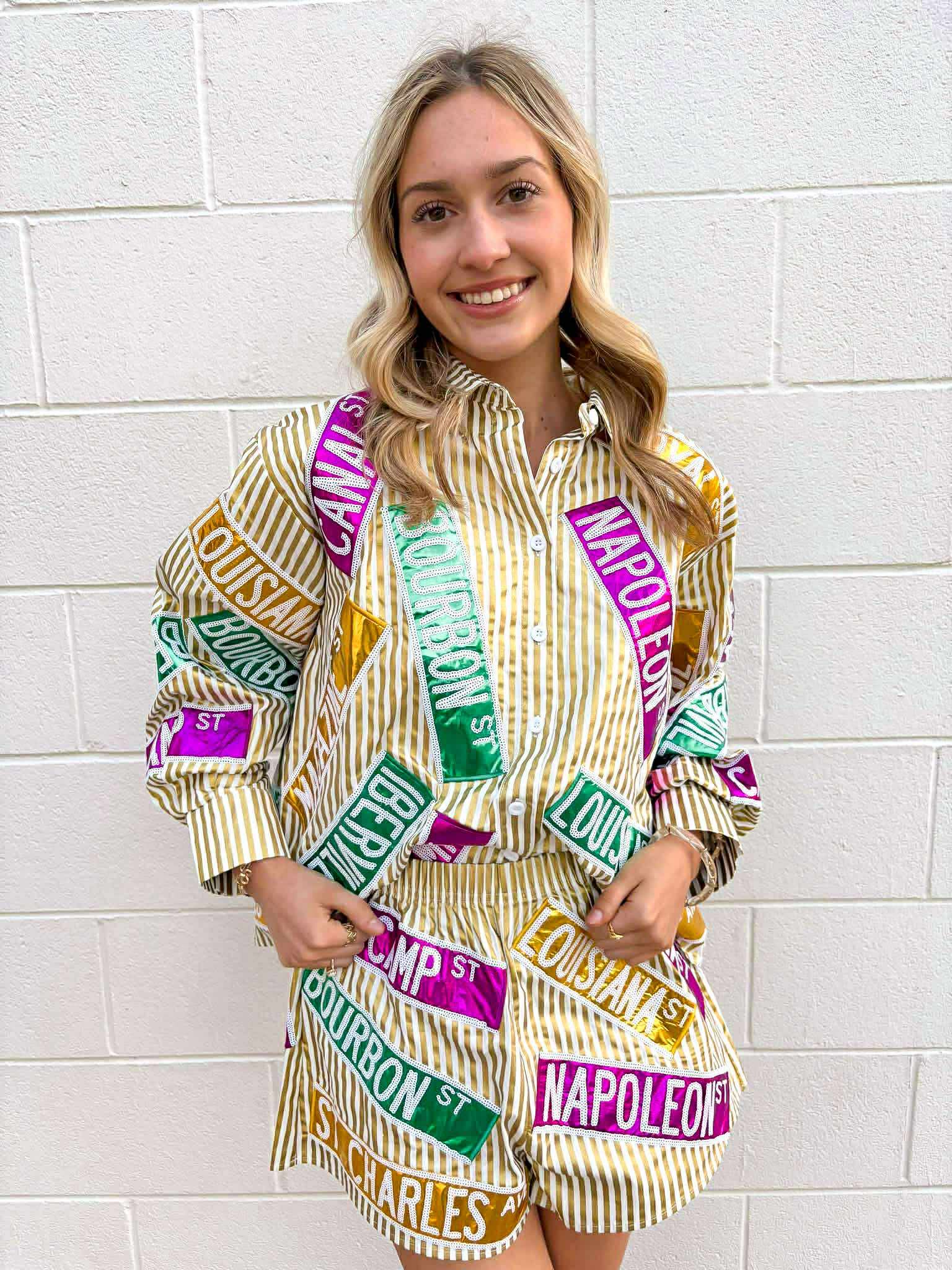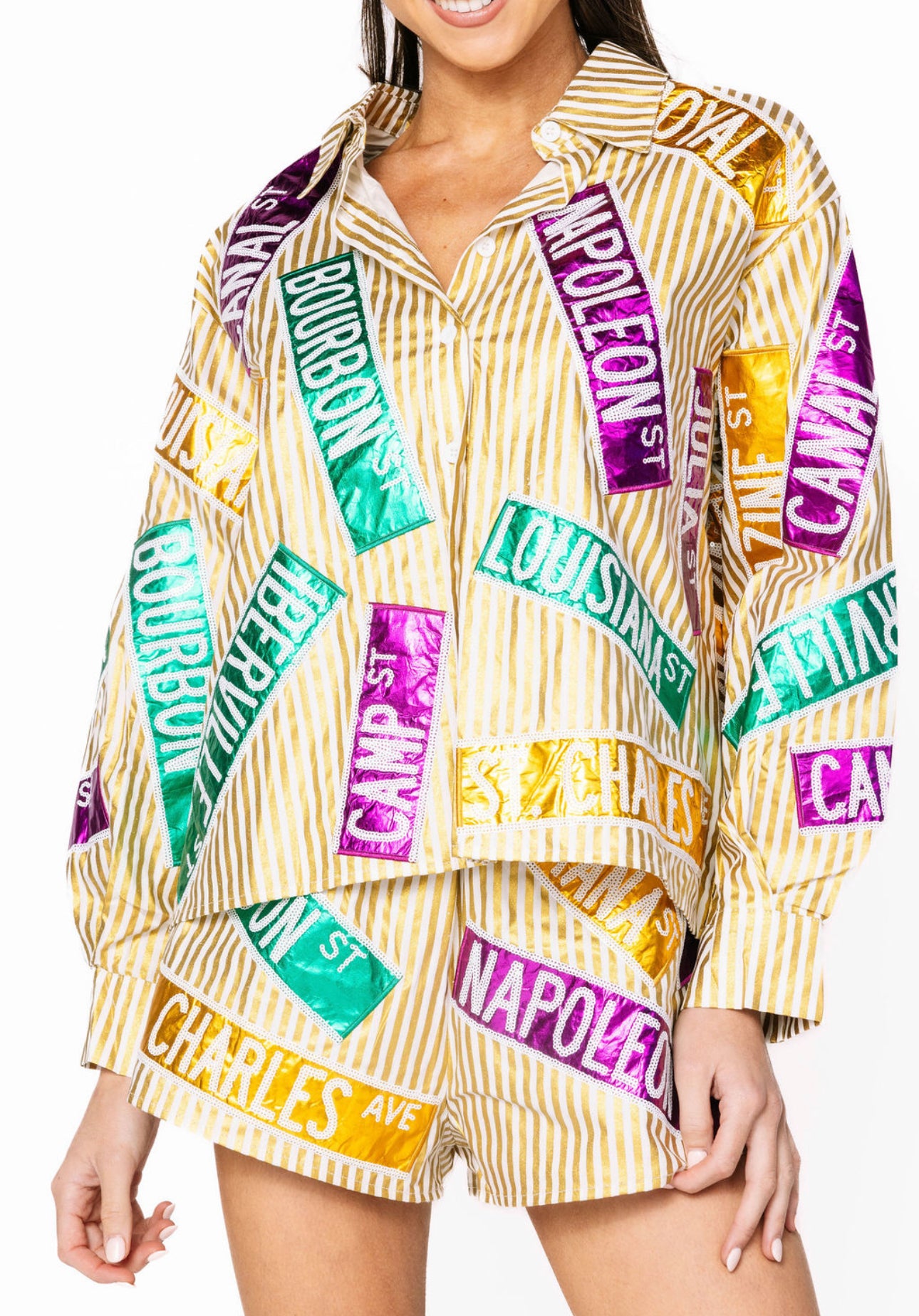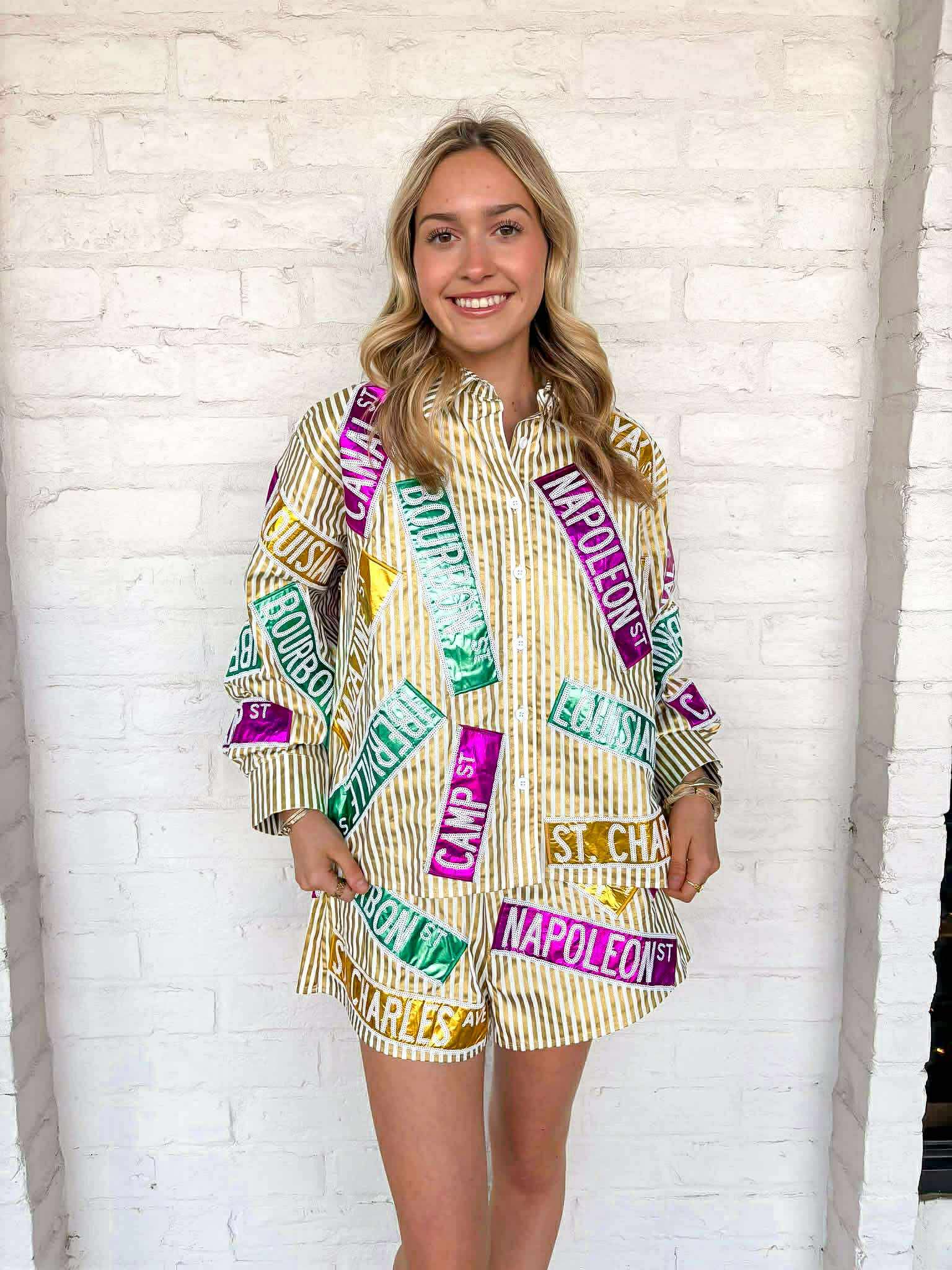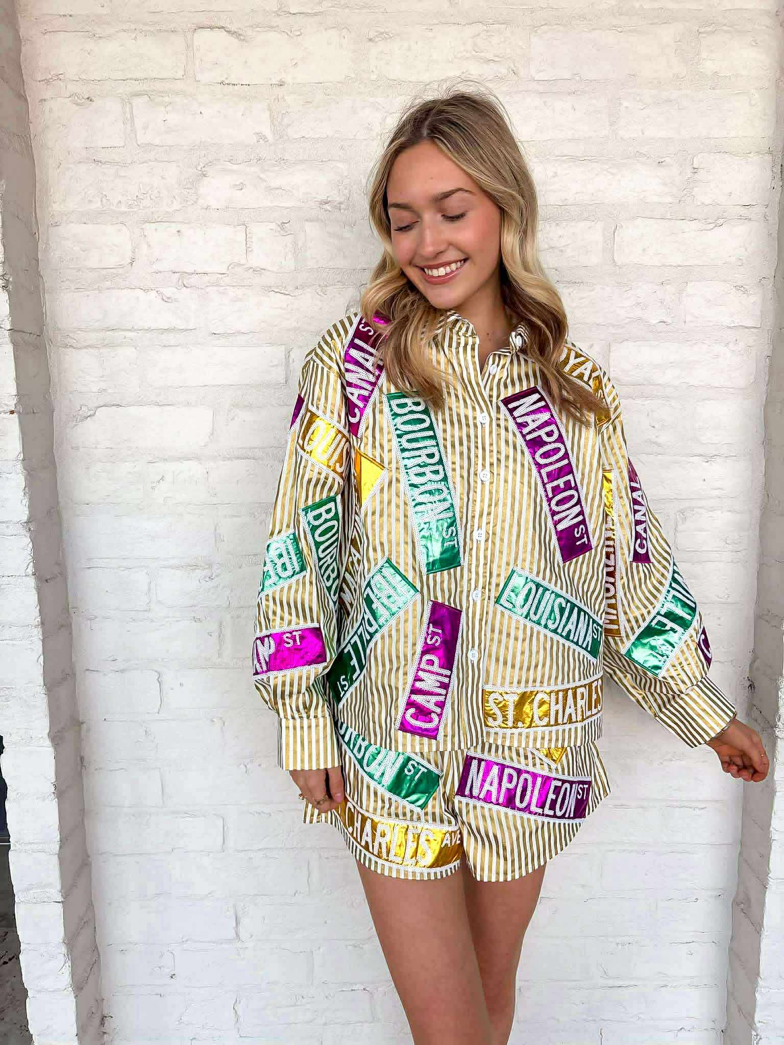 Add a touch of glamor to your wardrobe with our Queen Of Sparkles Metallic Gold Stripe Nola Street Tile Top. This button-up top is perfect for any occasion and will make you stand out from the crowd. Shine bright and feel confident in this eye-catching piece.