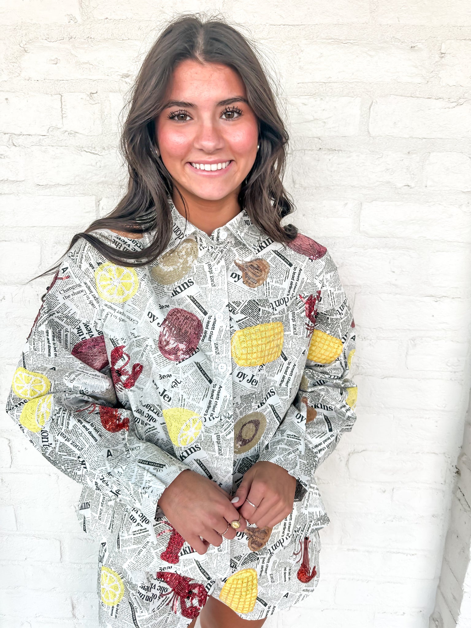 Indulge in regal style with the Queen of Sparkles Newspaper Seafood Button Up. This unique black and white newspaper print top is perfect for adding a touch of sophistication to any outfit. Made with quality materials, it offers comfort and style, making you feel like a true fashionista.