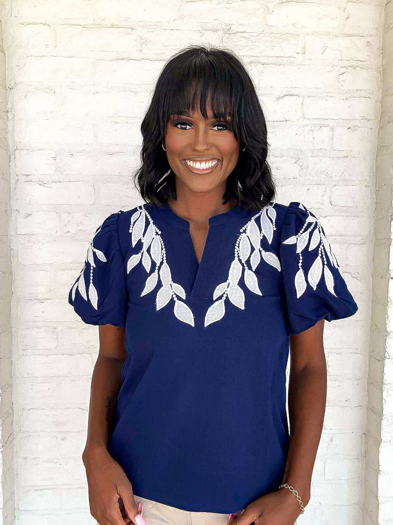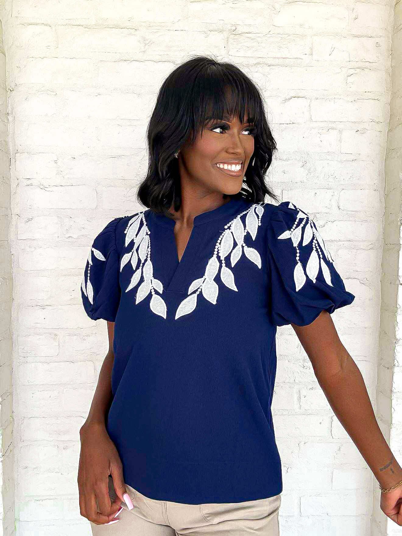 Elevate your wardrobe with our Moving Pieces Navy Top! This stunning floral blouse will add a pop of color to any outfit. Embrace your feminine side with its vibrant green hue and delicate floral design. Elevate your style game and stand out from the crowd.