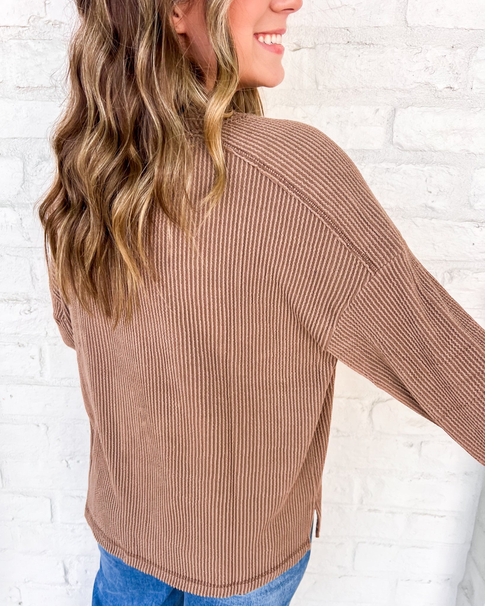 "Experience all-day comfort and style with our Hard Worker Top! This crew neck ribbed long sleeve knit top is the perfect addition to any wardrobe. Stay cozy and polished throughout your day with our versatile top."