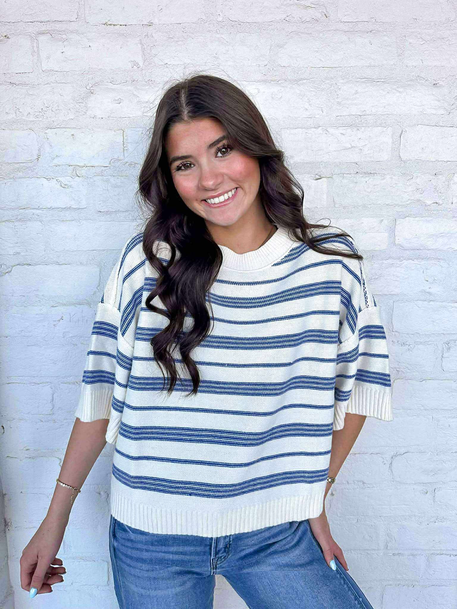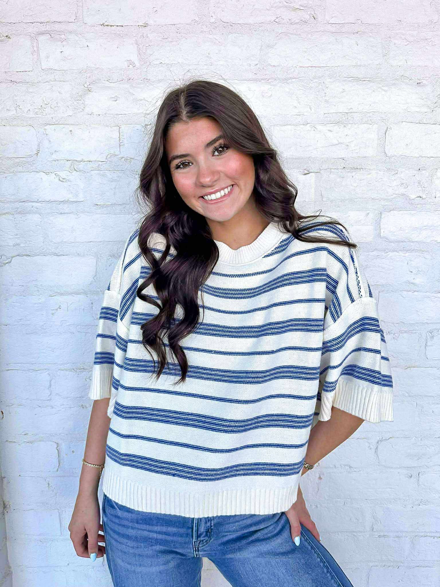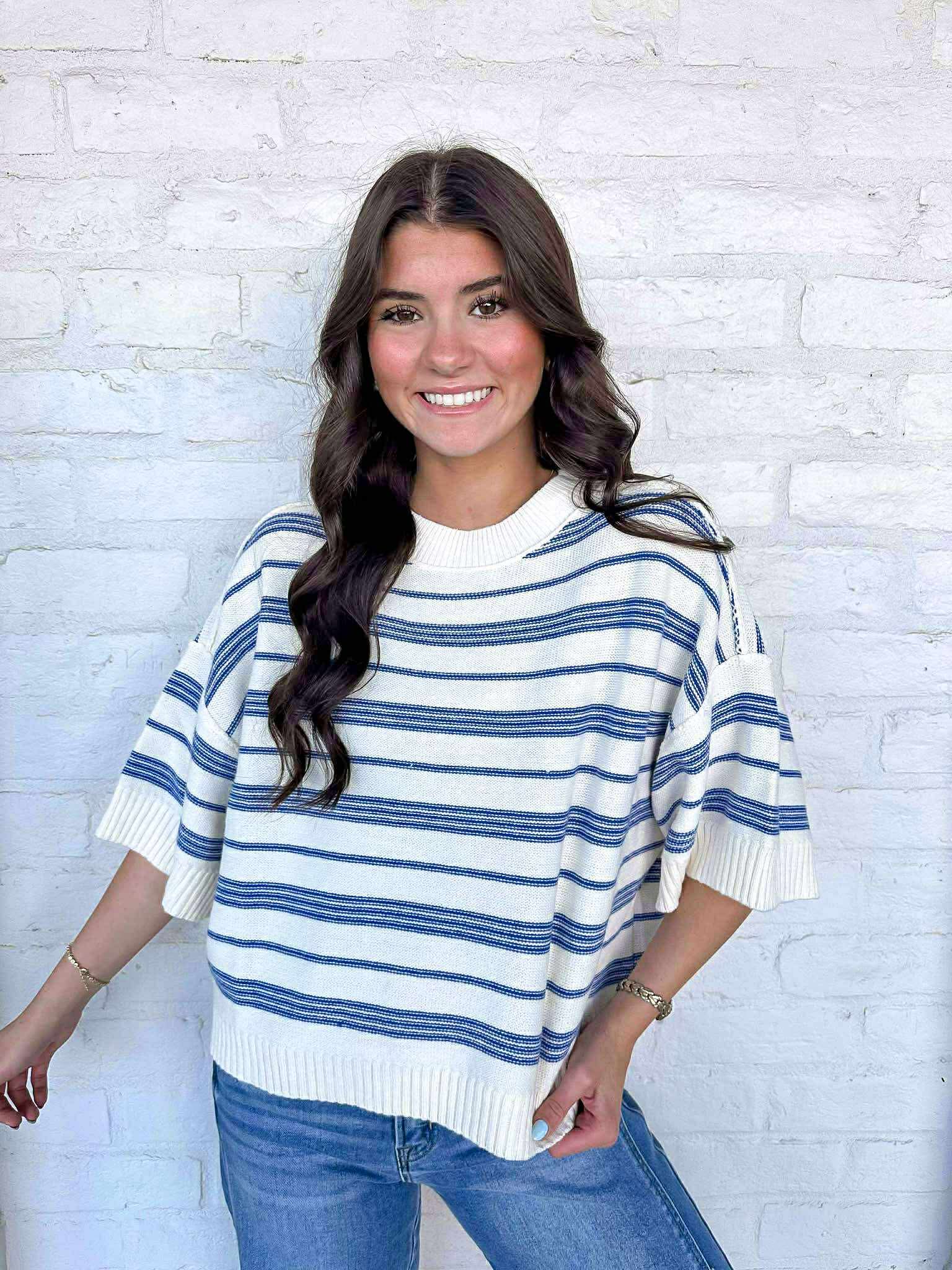 Stylish, versatile, and comfortable, our Hold Onto Me Knit Top is a must-have for any wardrobe. With its drop half sleeves and round neck design, it's perfect for any season. The striped knit sweater fabric adds a touch of texture, while providing an effortless and chic look. Stay fashionable and cozy with this top!