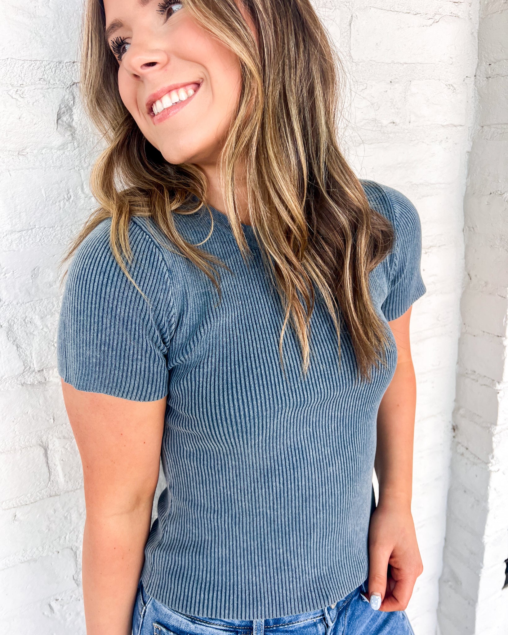 This short sleeve cropped knit tee features a washed ribbed design that adds texture and dimension to your outfit. Perfect for a casual day out or a night on the town, this tee is versatile and effortlessly stylish. Comfortable and chic, it's a must-have addition to any wardrobe.