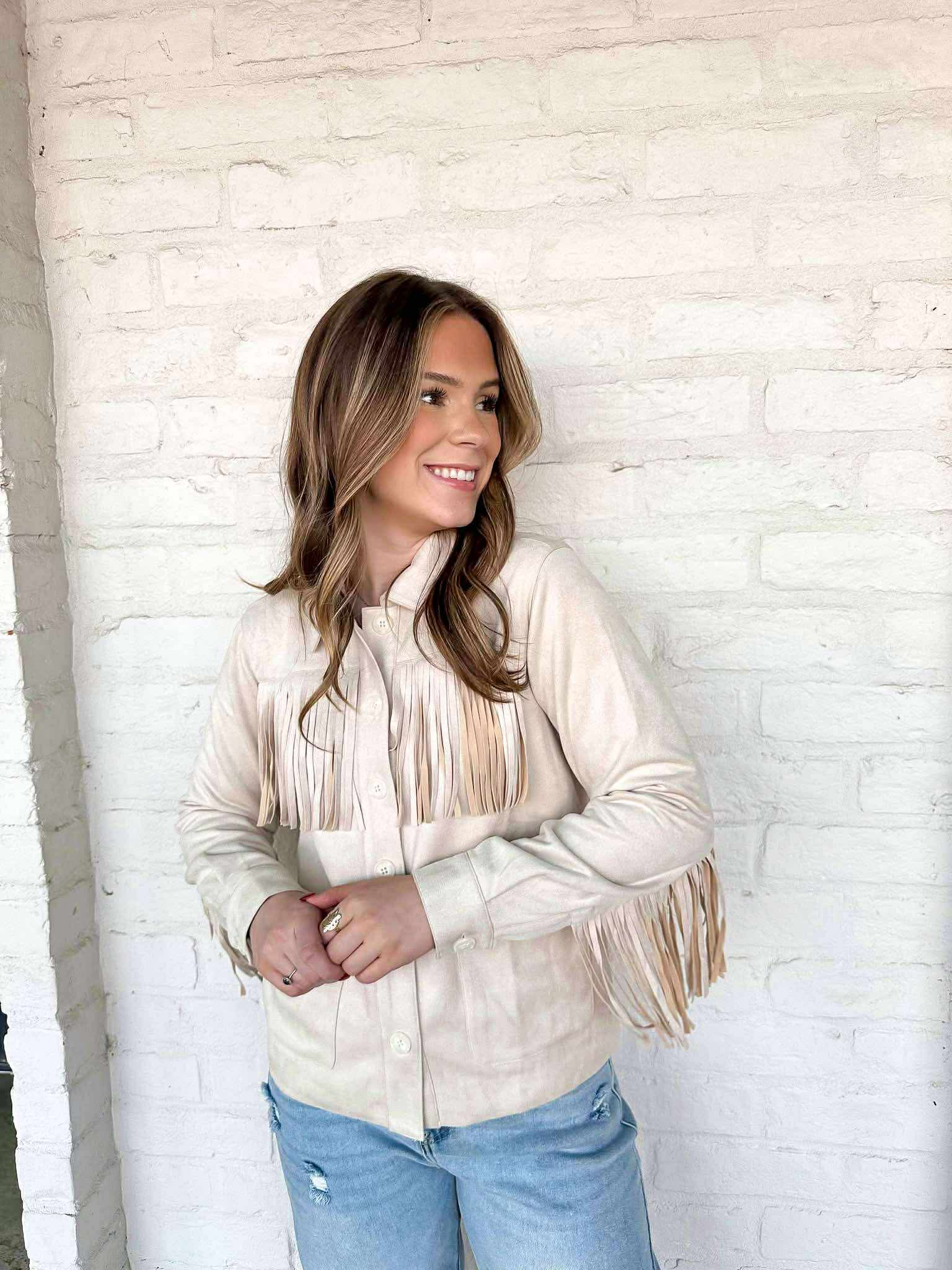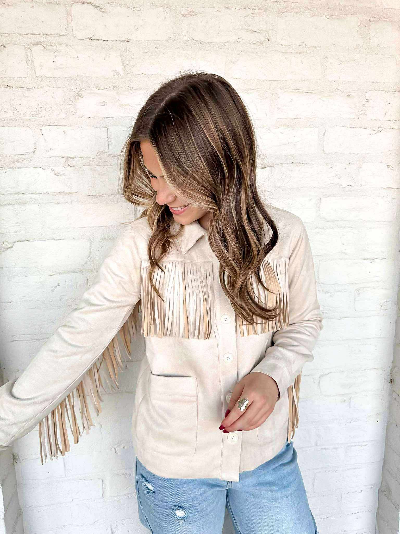 Complete your boho chic look with our Nothing Without You Cream Suede Jacket! This stunning jacket features beautiful fringe detailing that adds movement and texture to your outfit. Made with high-quality suede, it's the perfect way to elevate your style and make a statement. Don't miss out on this must-have piece!