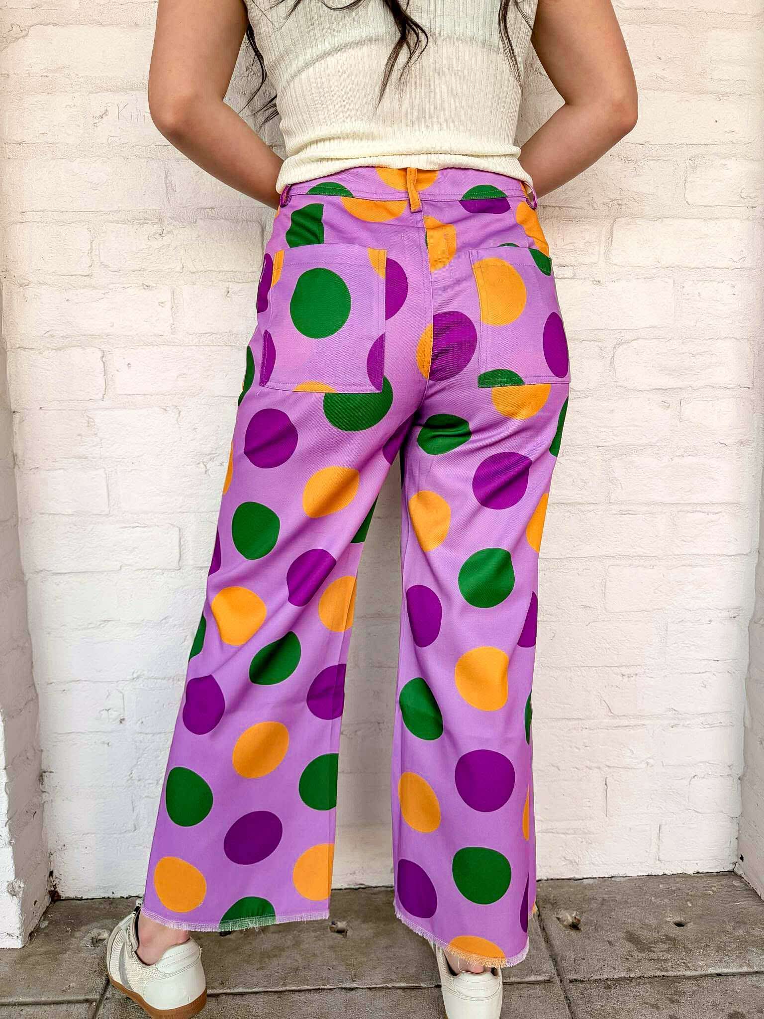 These Purple Polka Dot Mardi Gras Pants feature a unique polka dot pattern, specifically designed for festive occasions. The tailored fit ensures comfort and style, making them suitable for a variety of celebratory events. Crafted for durability, they provide both aesthetic appeal and functionality during Mardi Gras festivities.