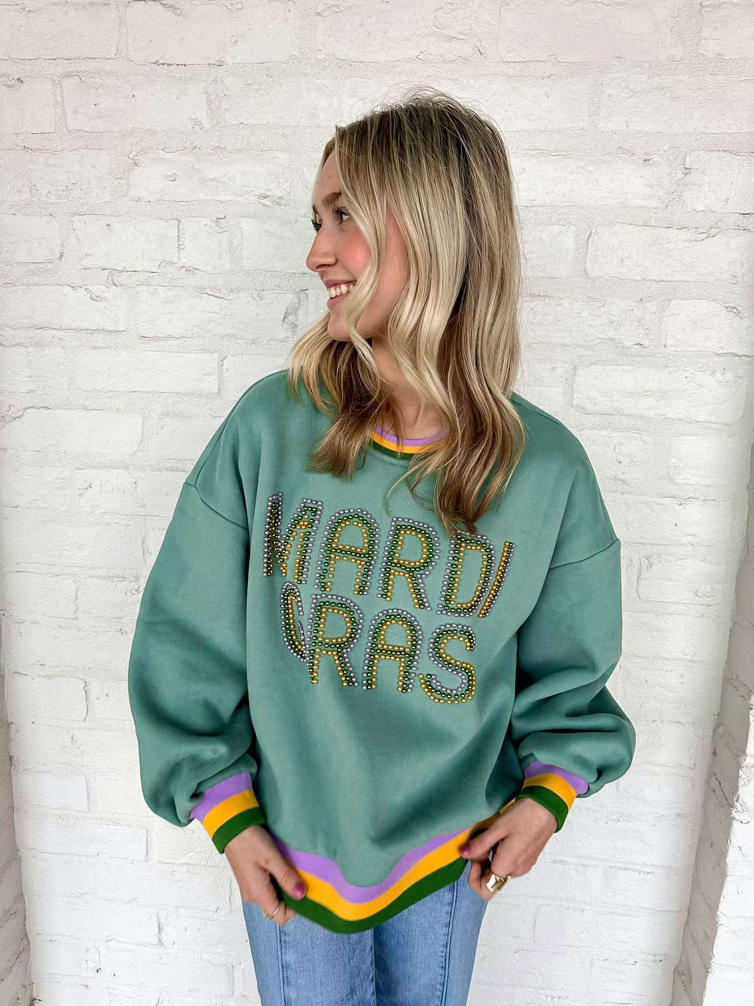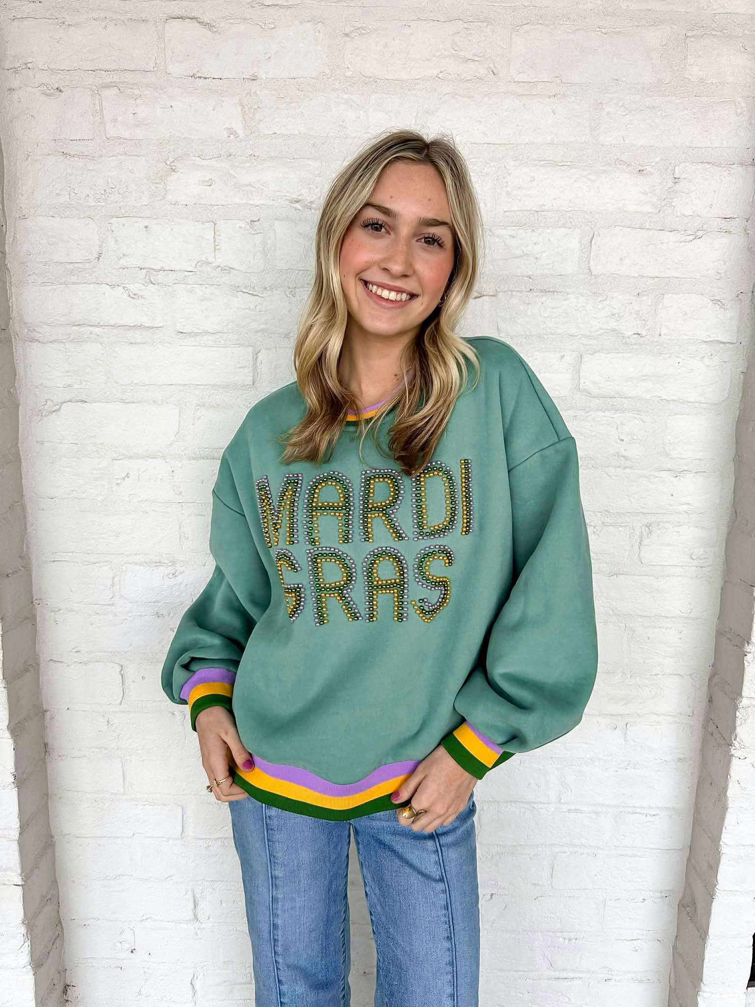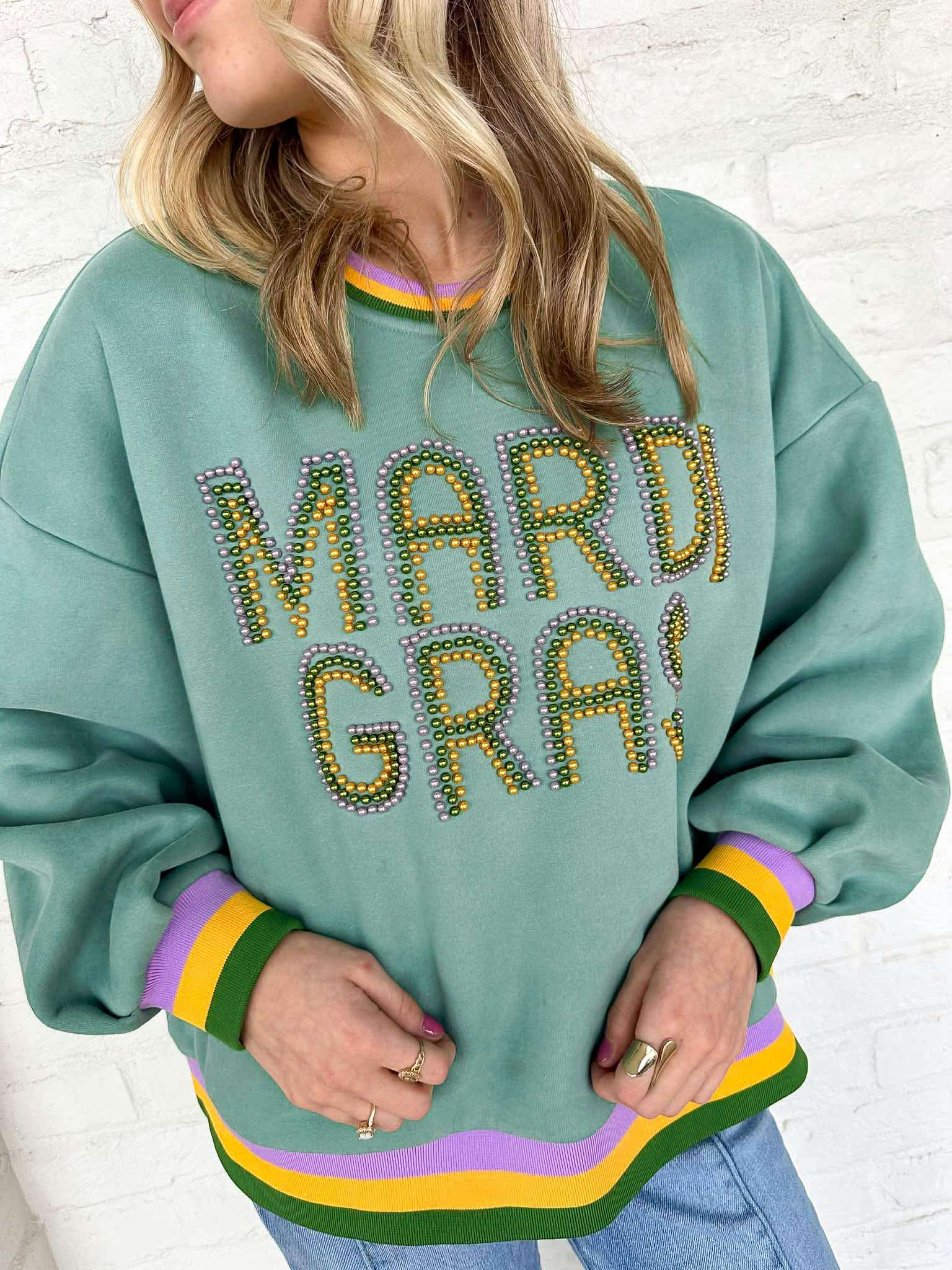 Celebrate your unique style with the Mardi Gras Pearl Letters Sweatshirt! This stunning top features eye-catching pearl letters that add a touch of glamour to any outfit. Embrace the vibrant spirit of Mardi Gras and make a bold statement wherever you go! Ideal for those who love to stand out!