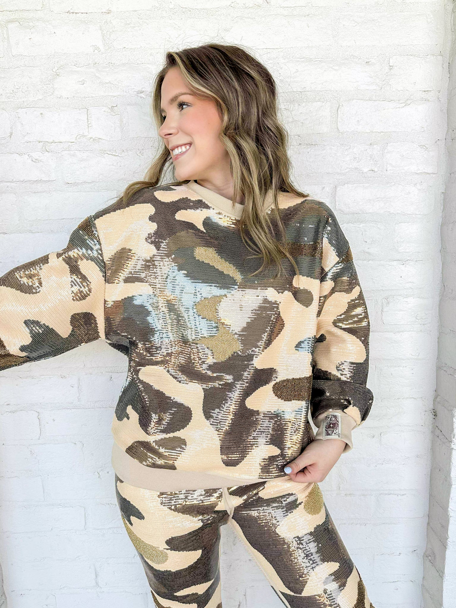 Be bold and stand out with the Queen Of Sparkles Green Full Sequin Camo Sweatshirt. With full sequin camo and a nod to hunting season, this sweatshirt combines fashion and function. Be the queen of the fashion game and stay warm in style.