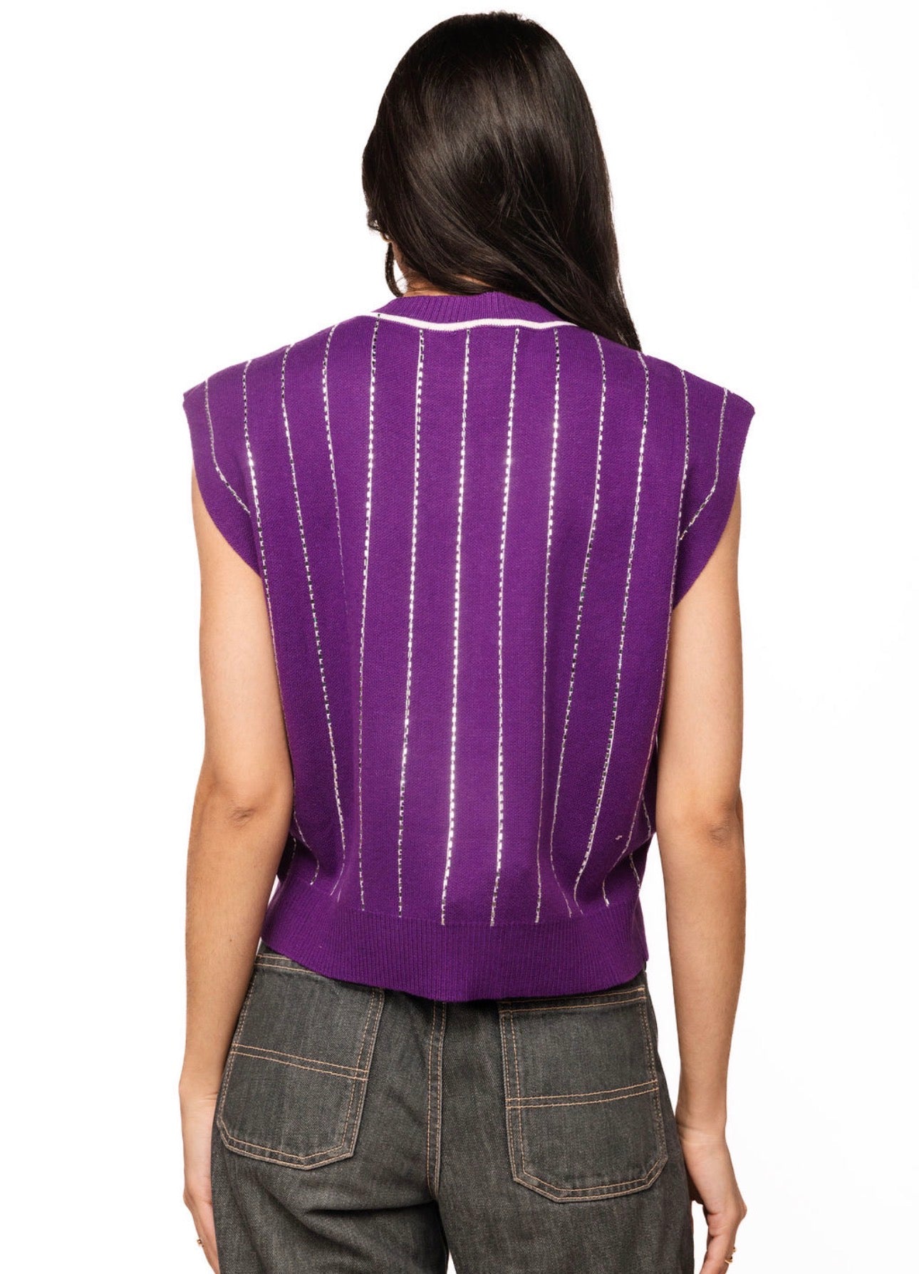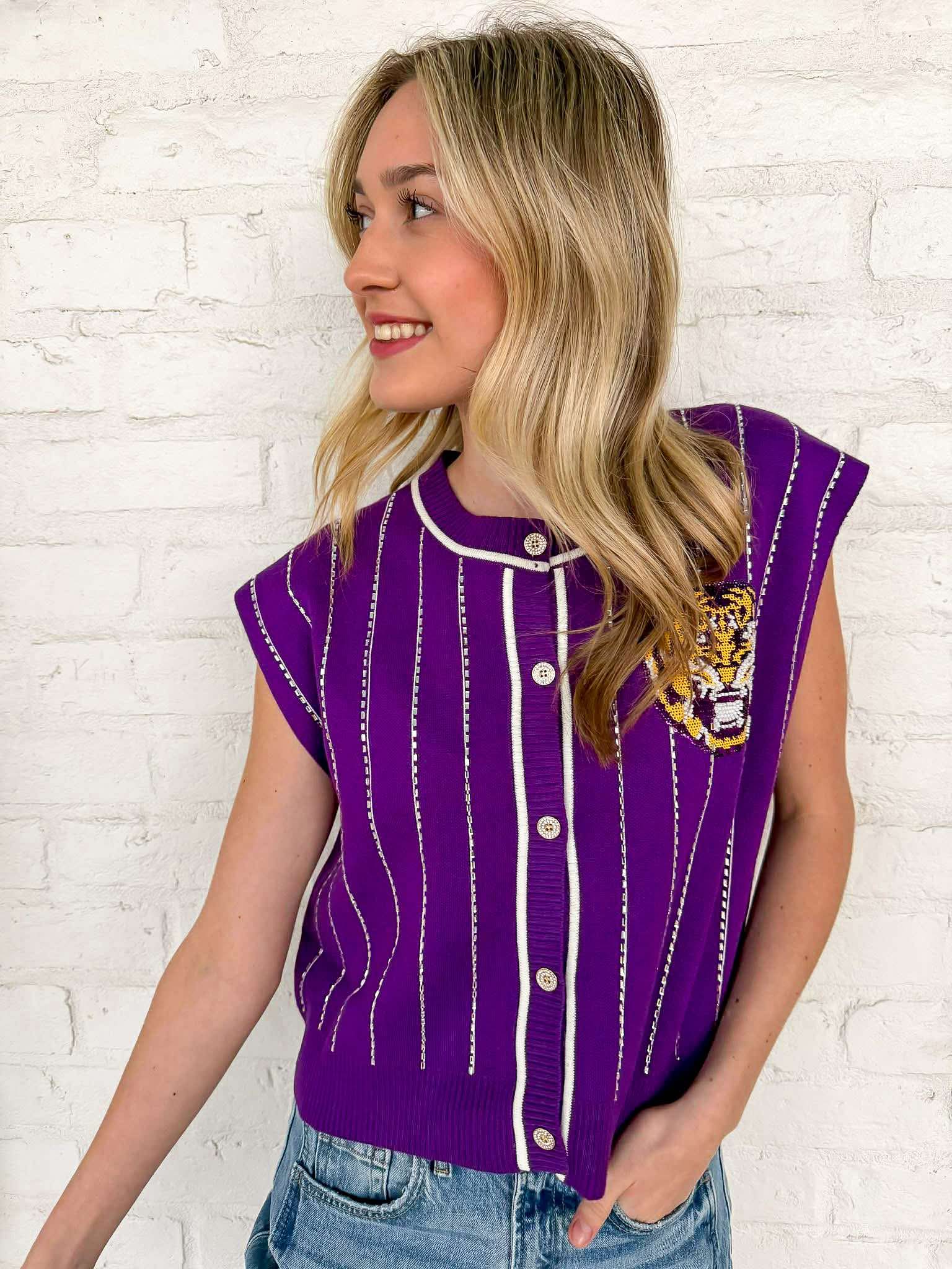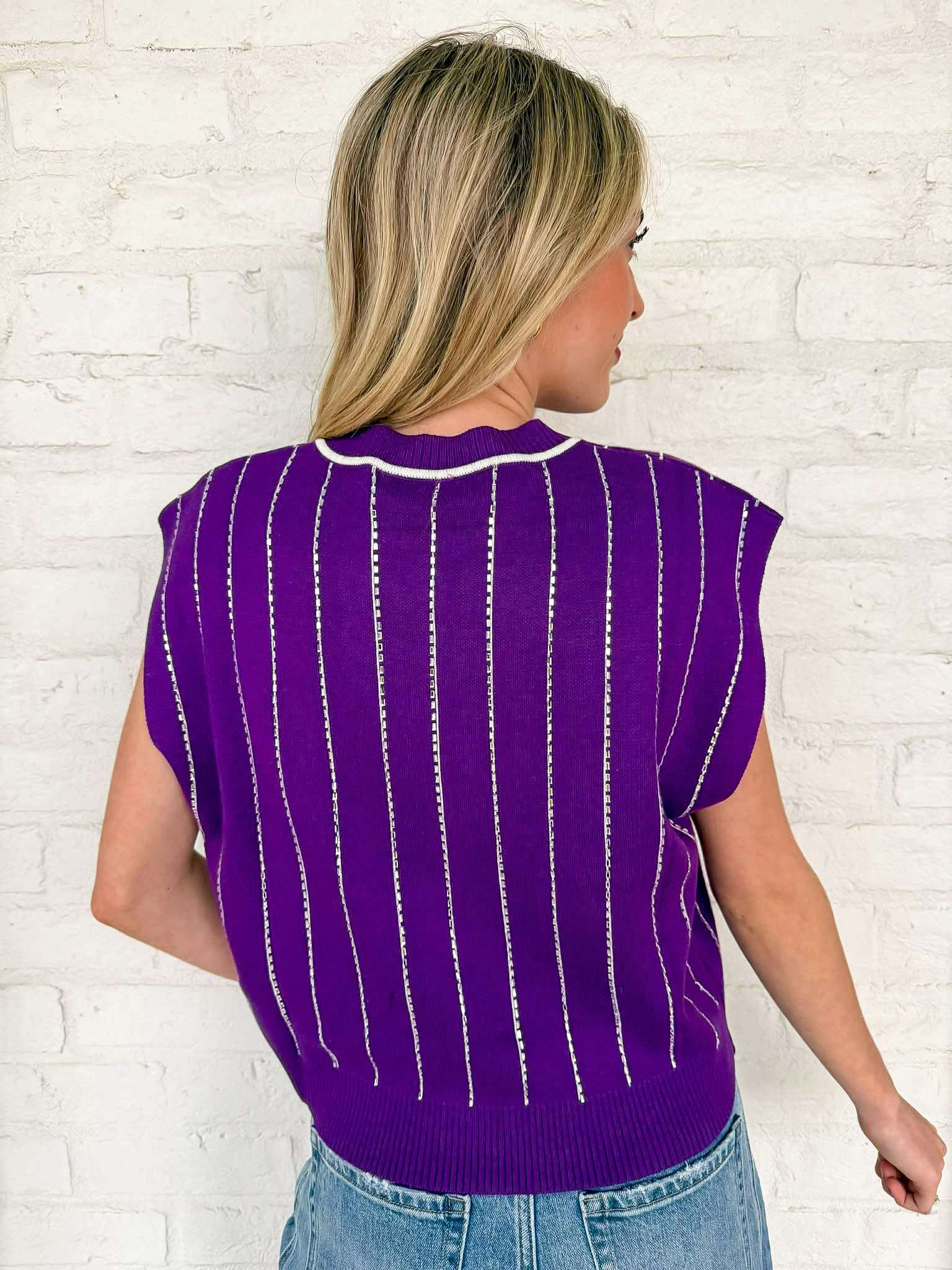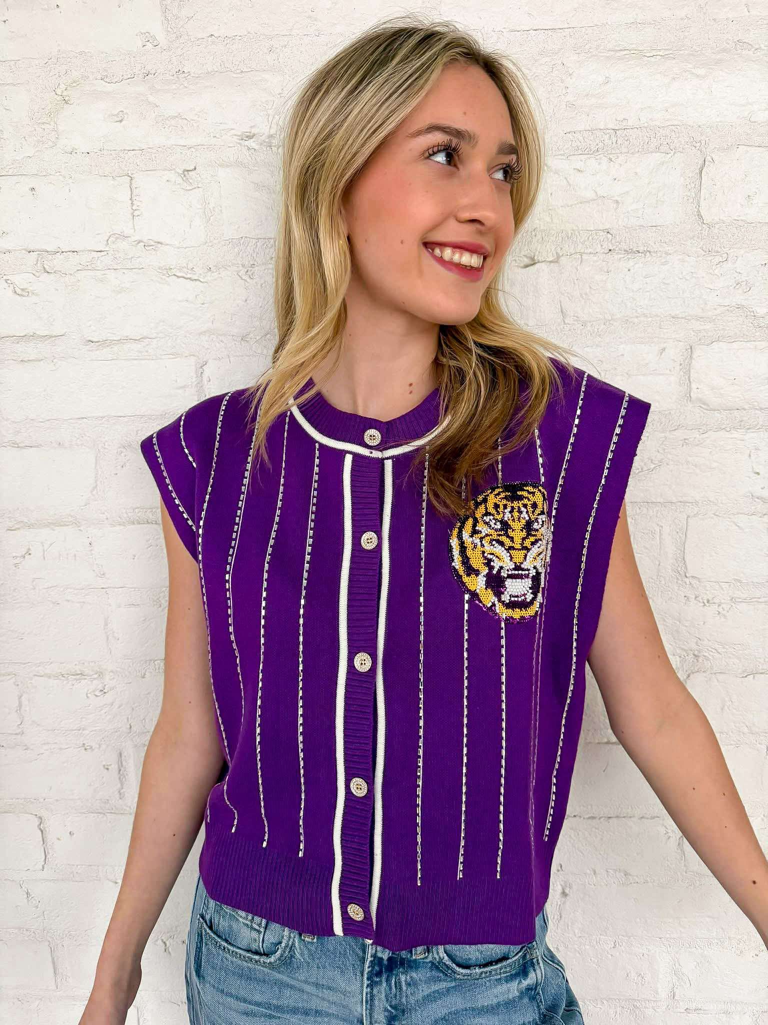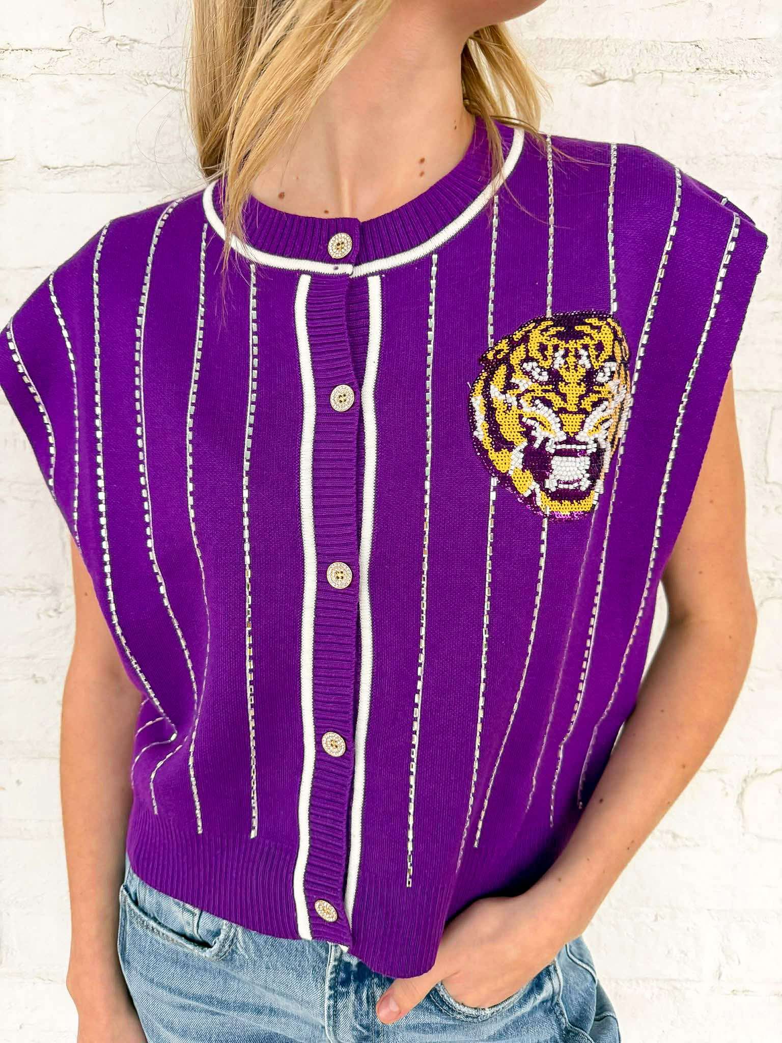 Queen Of Sparkles Purple LSU Striped Mascot Button Down Vest