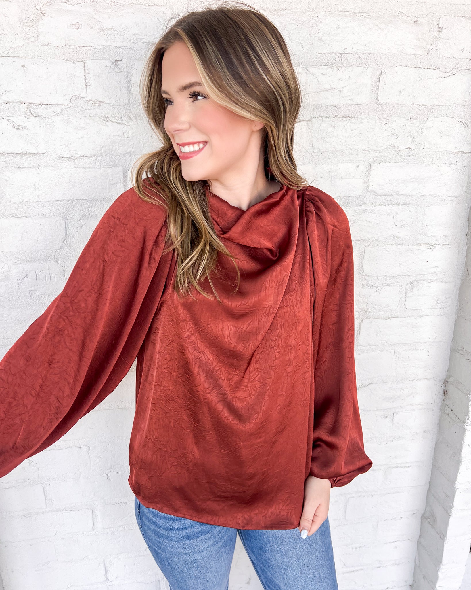 Elevate your style with the Rust Satin Draped Mock Neck Blouse. Crafted in a soft satin-like fabric with subtle texture, this blouse features a dramatic draped neckline and billowy long sleeves for a look that’s both polished and fashion-forward. The rich rust shade adds a seasonal pop, making it the perfect statement piece for fall.