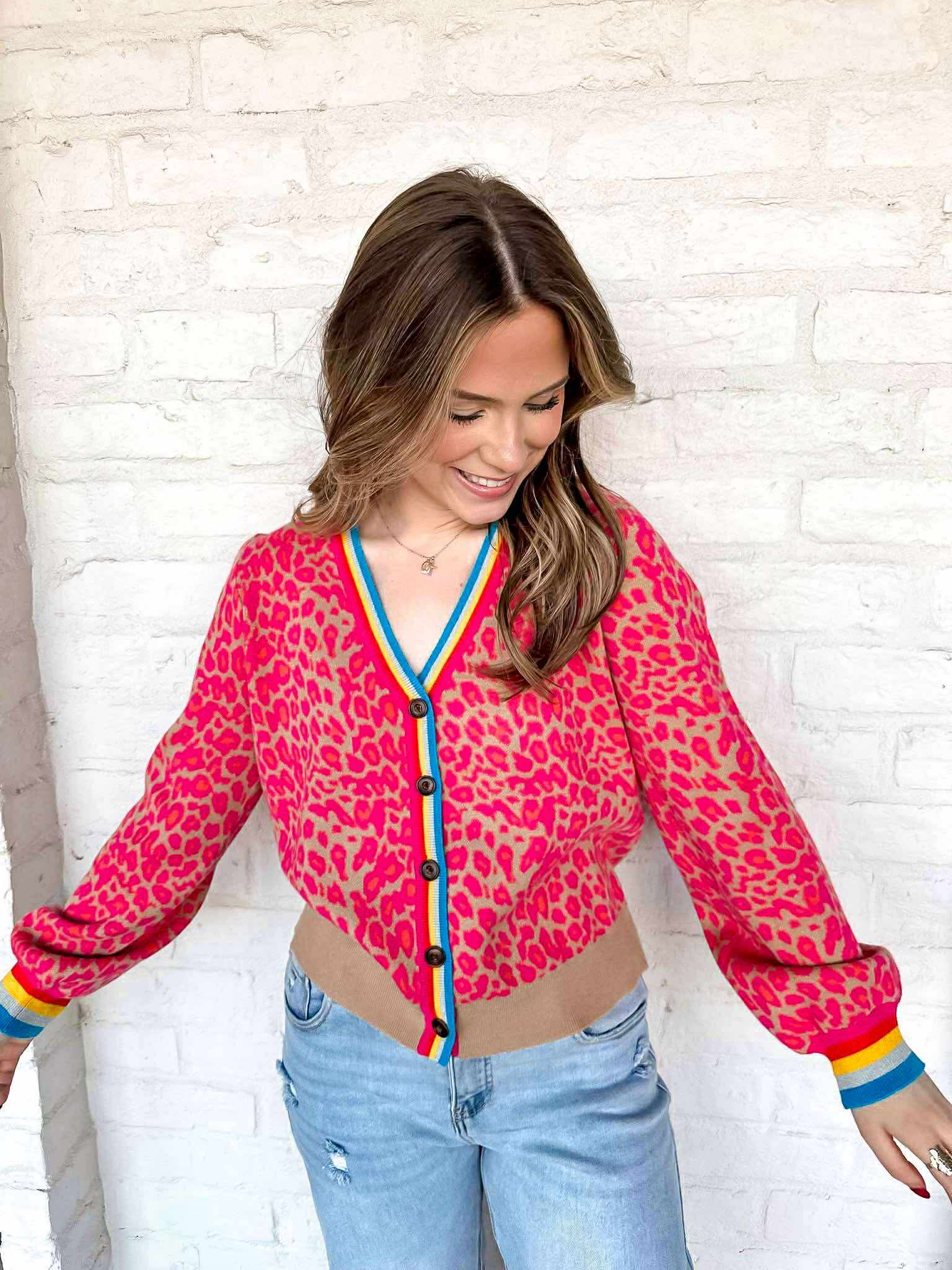 Indulge in luxury with our Stars Over Time Hot Pink Top featuring a fashionable cheetah cardigan. Feel confident and stylish with our trendy and unique design, perfect for any occasion. Elevate your wardrobe and stand out in a crowd!