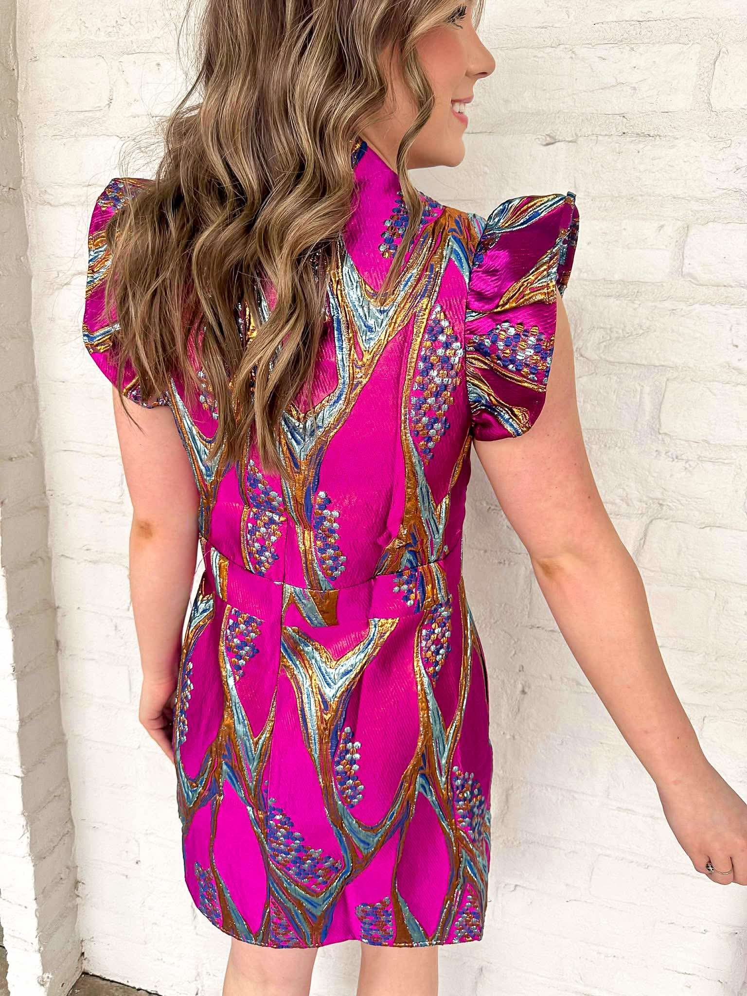 Stand out and make a statement with the THML Girls Night Out Magenta Dress! This bold, metallic print dress boasts flutter sleeves that add a touch of whimsy and movement. Perfect for a night out on the town, this dress will have you feeling confident and ready for any adventure.