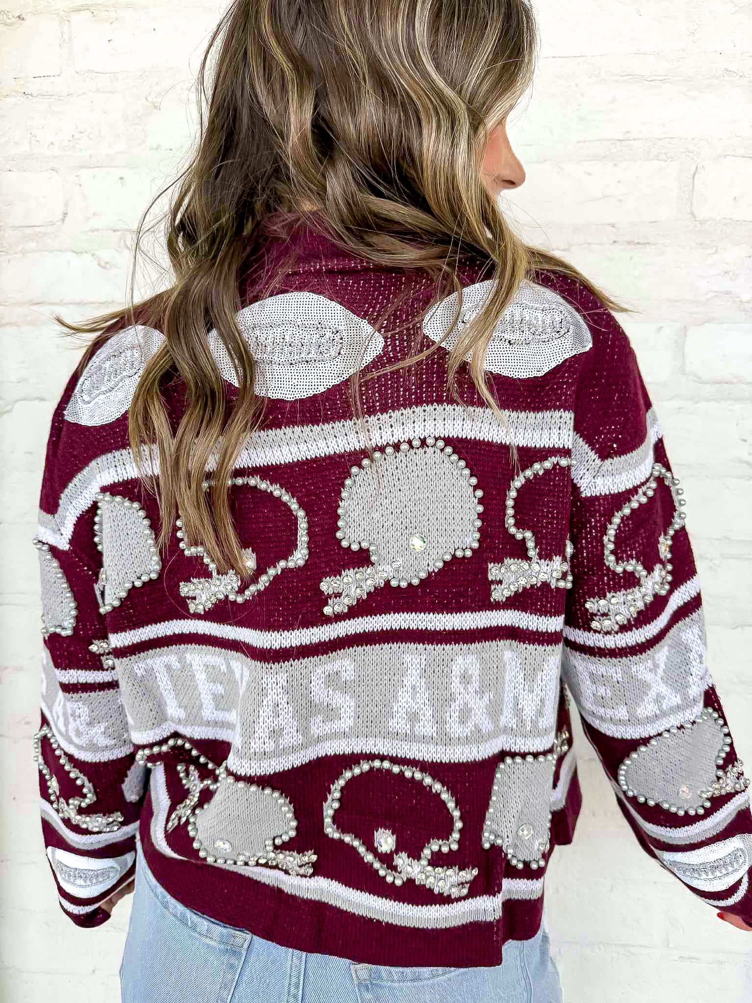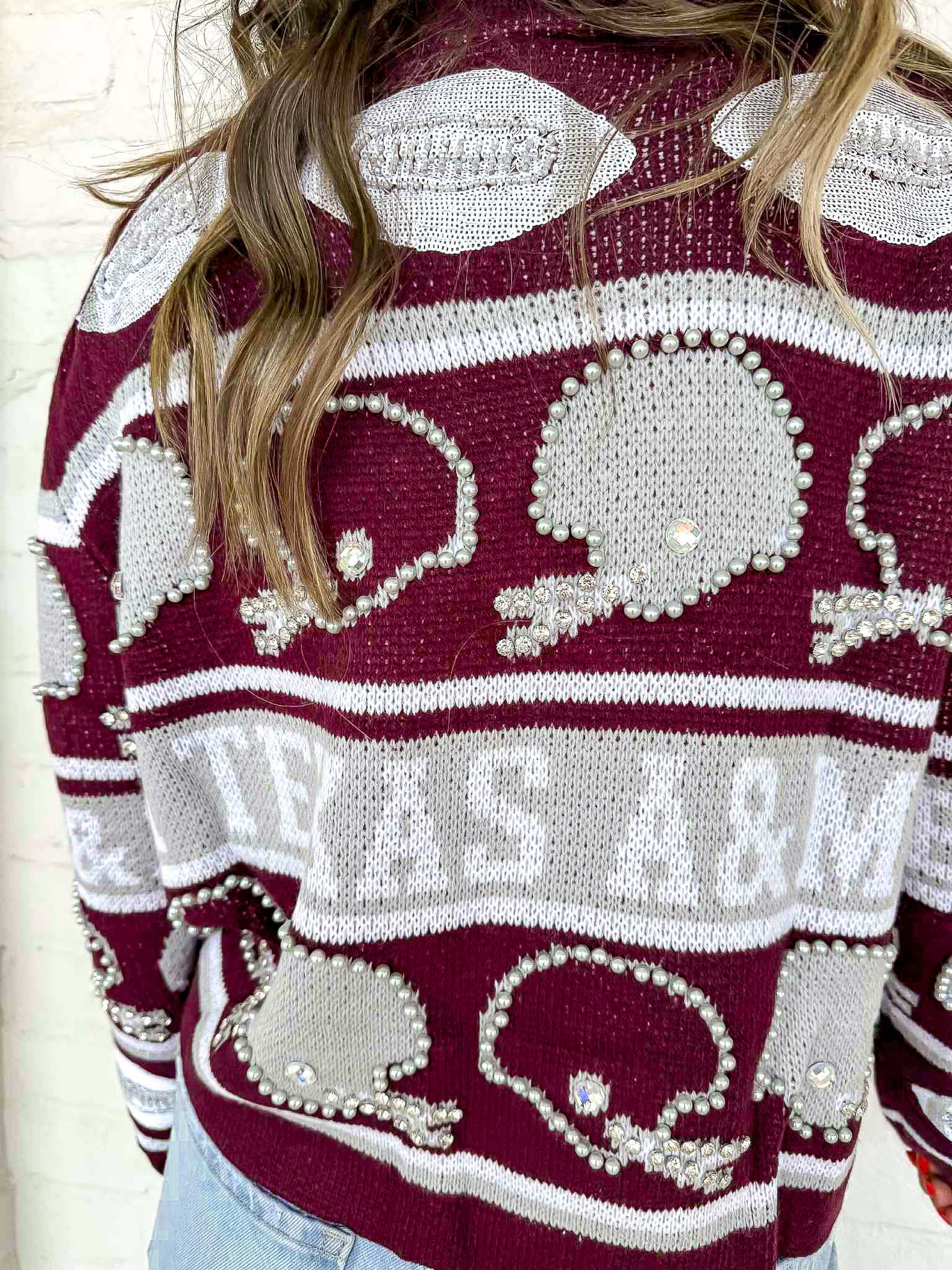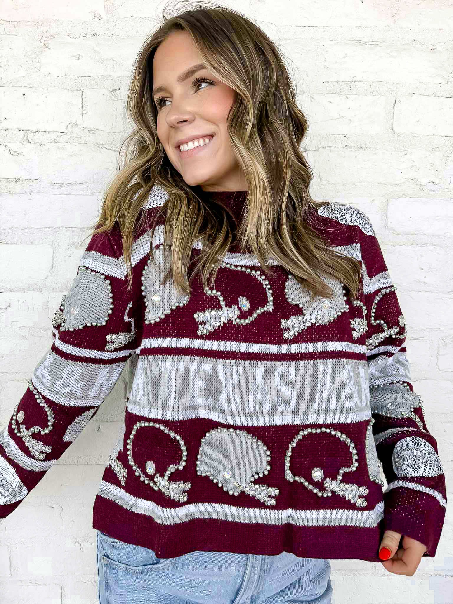 Elevate your gameday look with our Queen of Sparkles Vintage Football Sweater! This unique sweater features a vintage A&M football helmet design that will turn heads and make you the talk of the tailgate. Stay warm and stylish while showing your support for the Aggies!