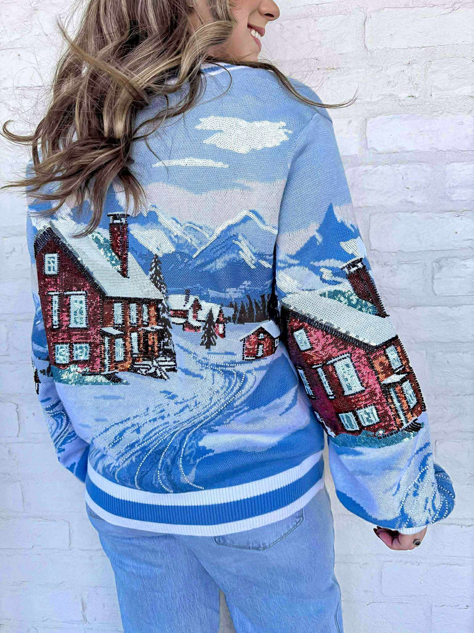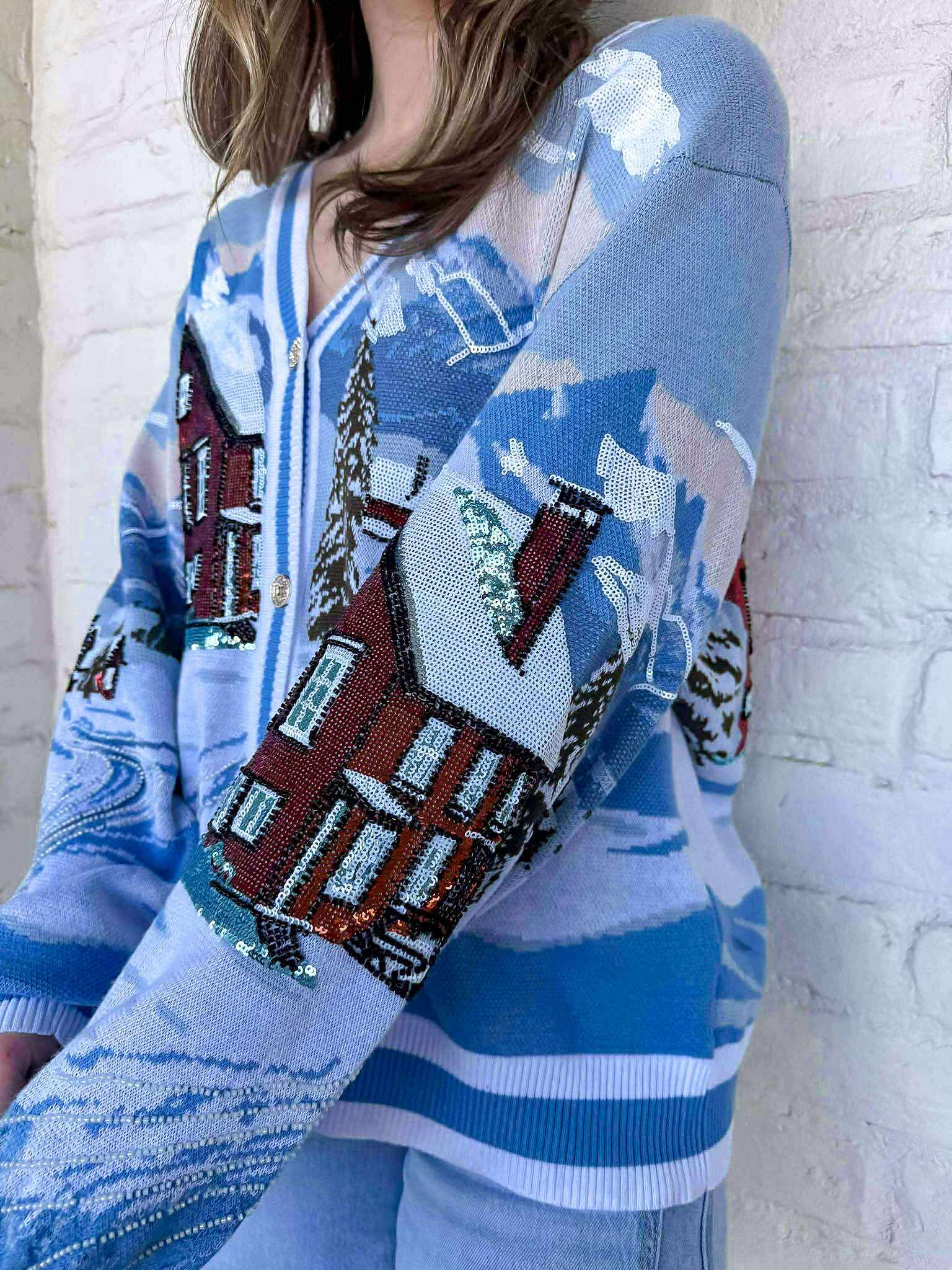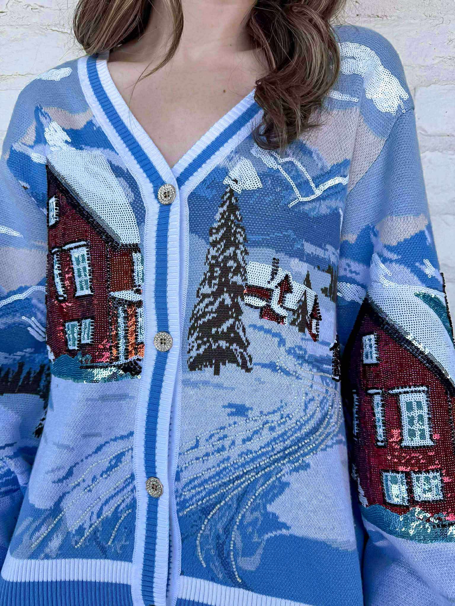 "Stay cozy and stylish in our Queen Of Sparkles Blue & White Snow Town Cardigan. With its snow town design, this cardigan is perfect for cold weather and adds a touch of whimsy to any outfit. Bundle up and shine bright with this must-have piece!"
