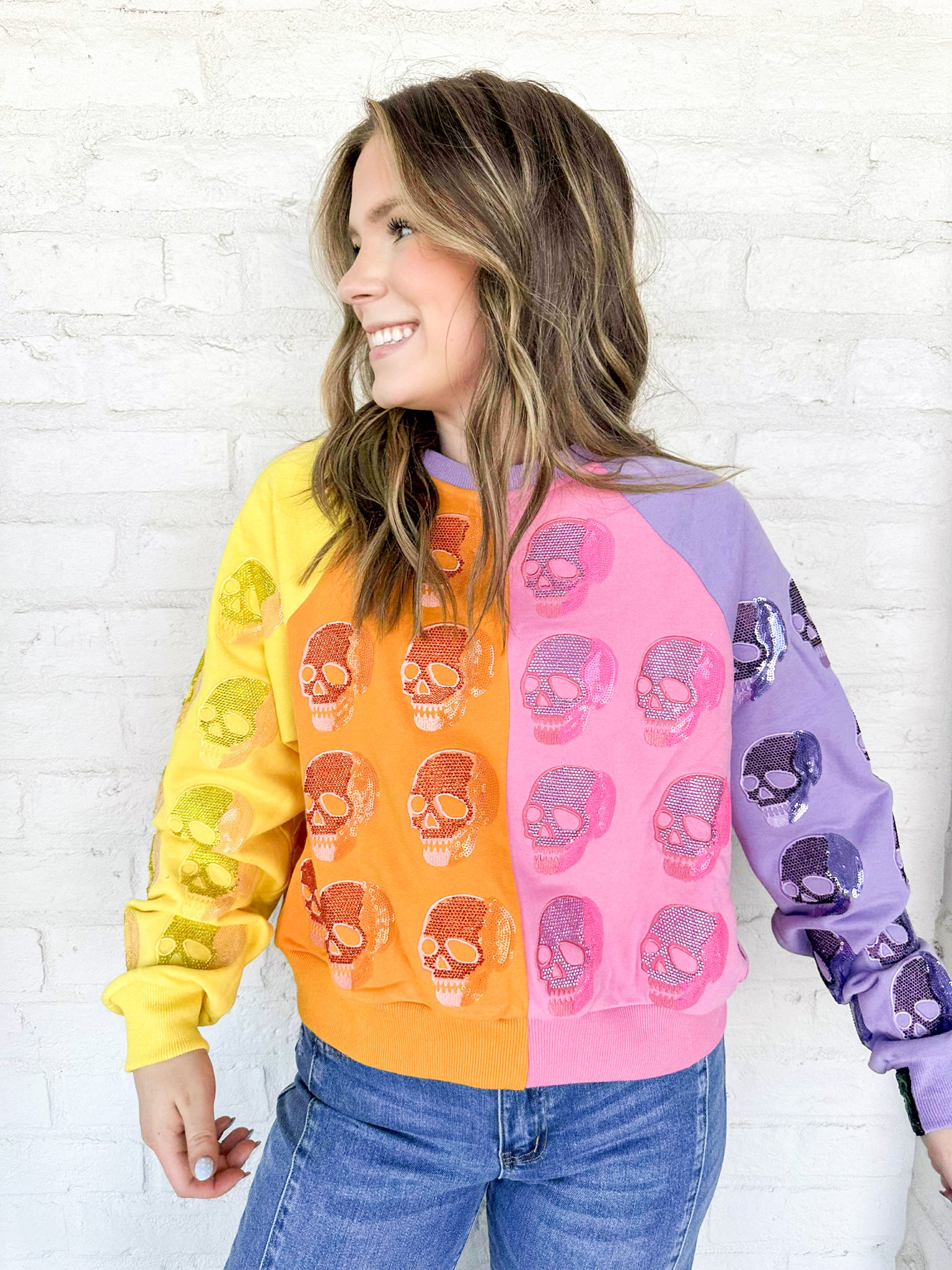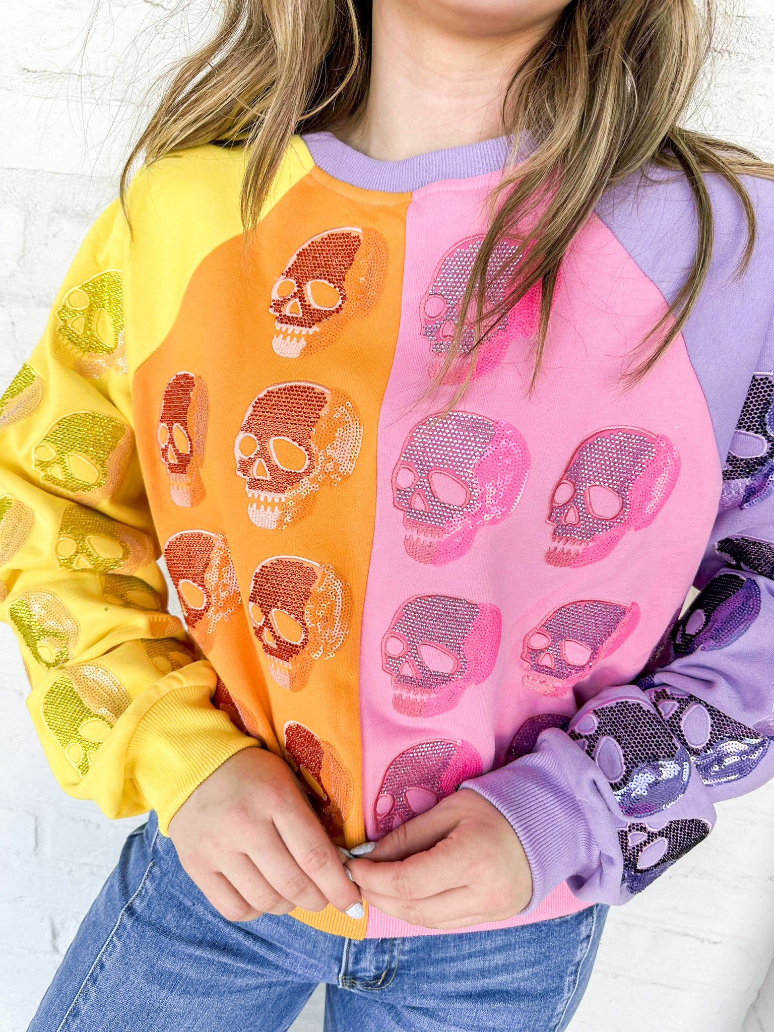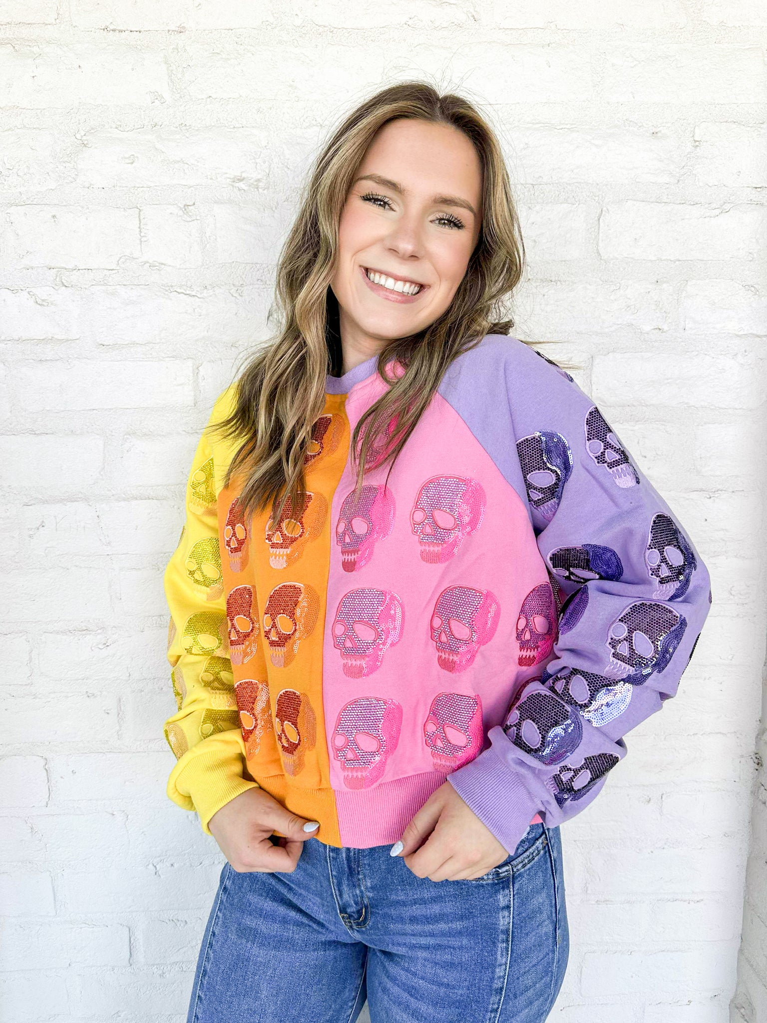 Unleash your inner queen of sparkle with this Queen of Sparkles Colorblock Multi Skull Sweatshirt! Featuring bright, vibrant colors and a cool skull design, this sweatshirt is perfect for making a bold fashion statement. Stay cozy and confident in this unique and eye-catching piece.