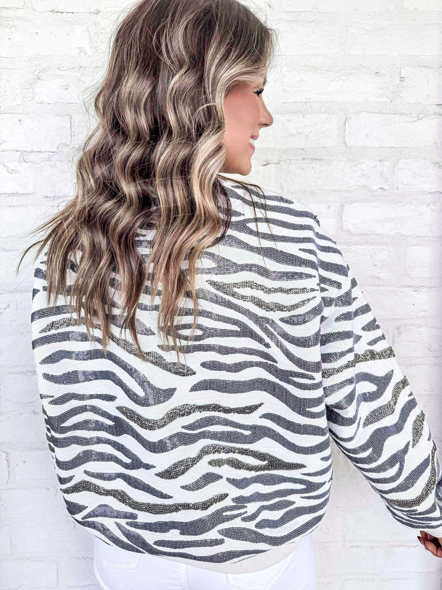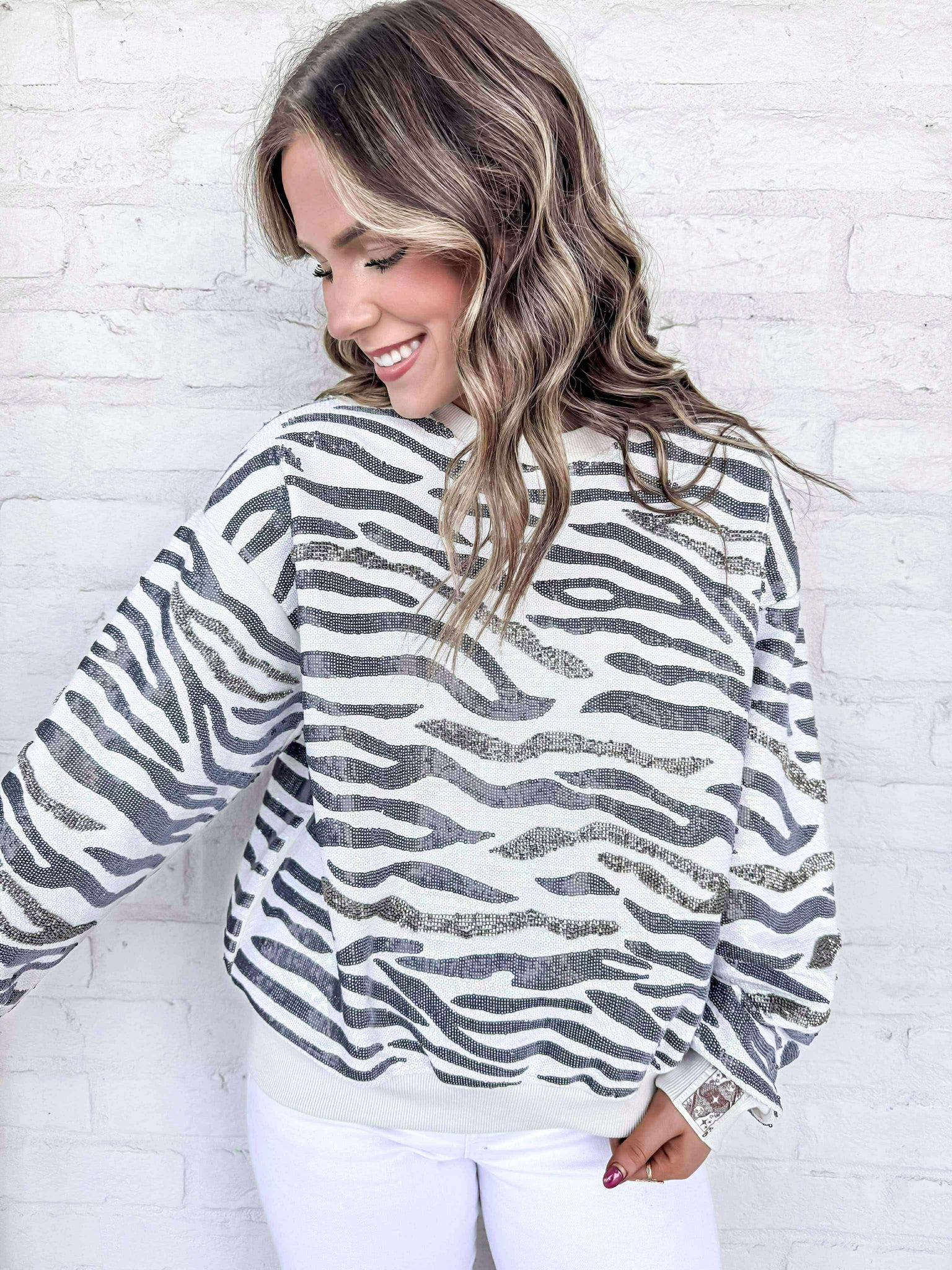 Indulge your wild side with our Queen Of Sparkles Cream & Black Zebra Sweatshirt. Featuring a bold and stylish zebra print, this sweatshirt is the perfect way to add some fun and excitement to your wardrobe. Made from soft and comfortable material, it's perfect for any casual occasion.